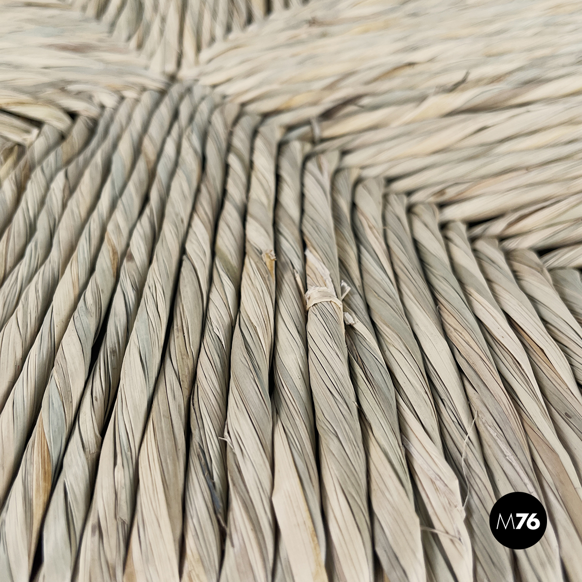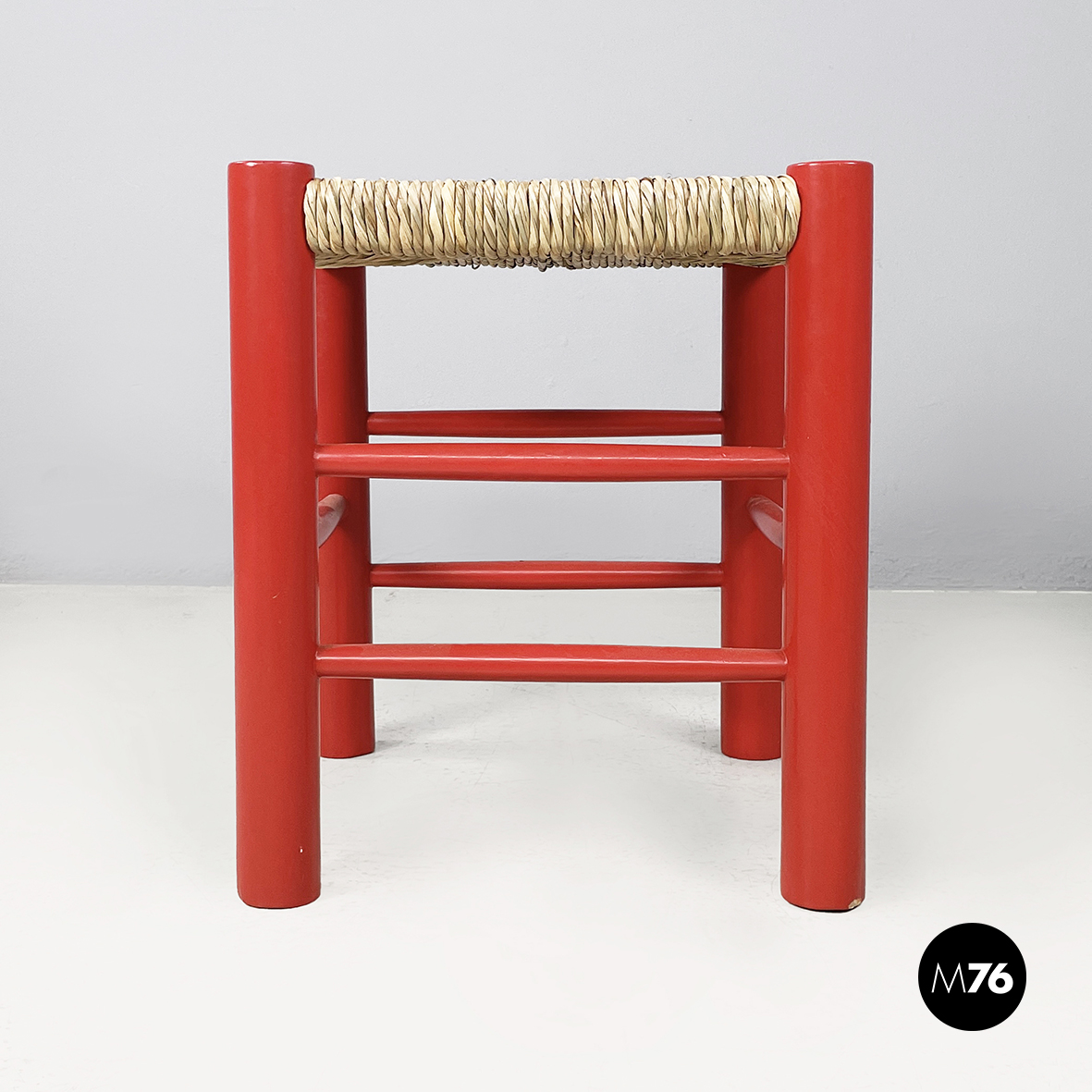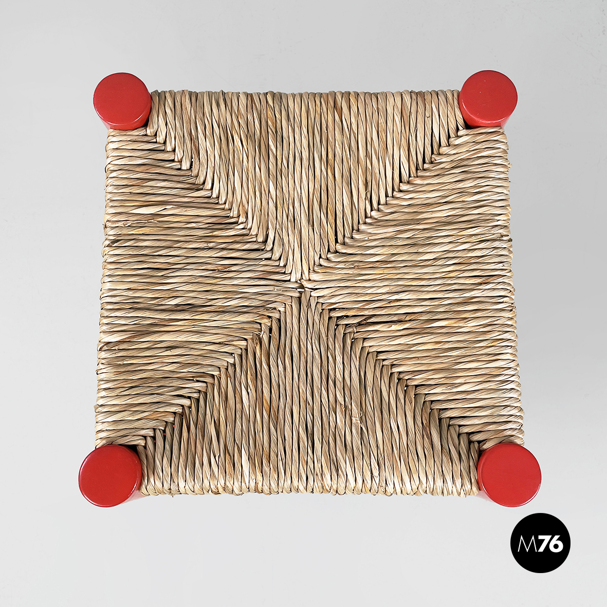 Sgabello con seduta squadrata in paglia intrecciata. La struttura e le zampe a sezione tonda sono in legno verniciato rosso.