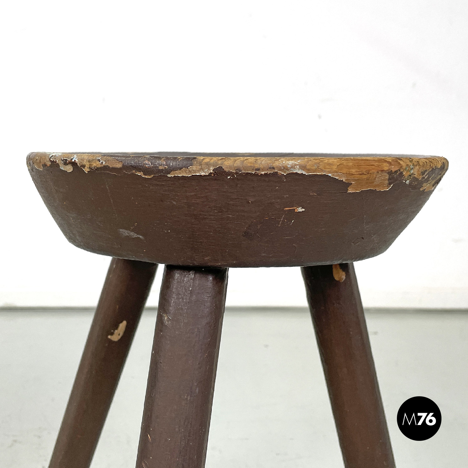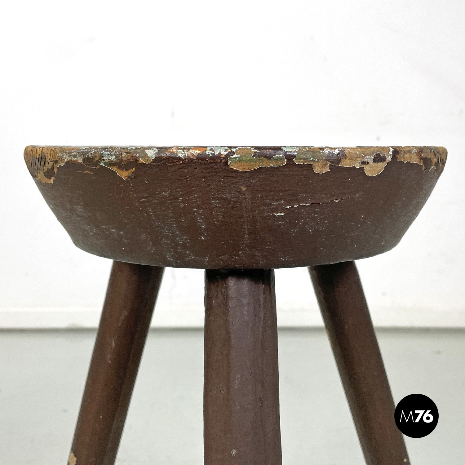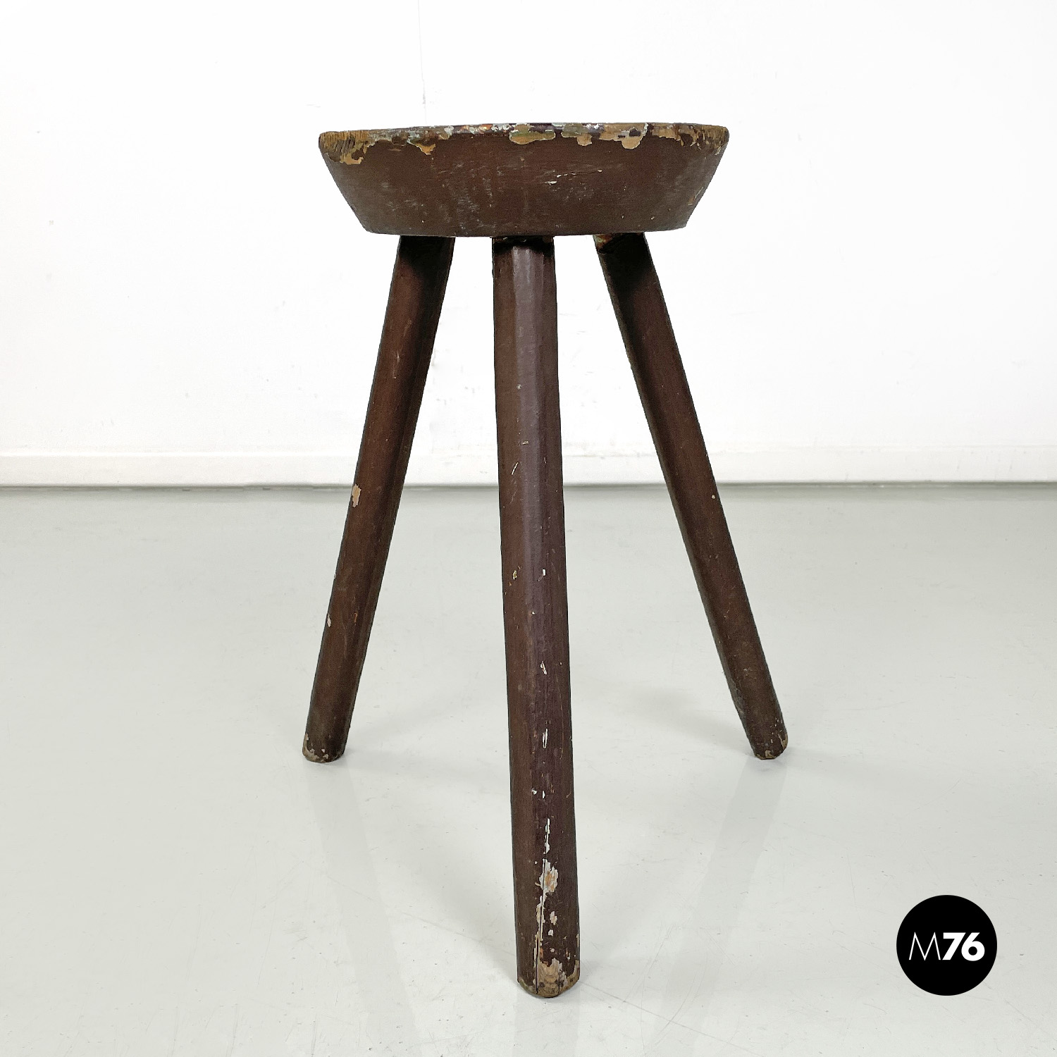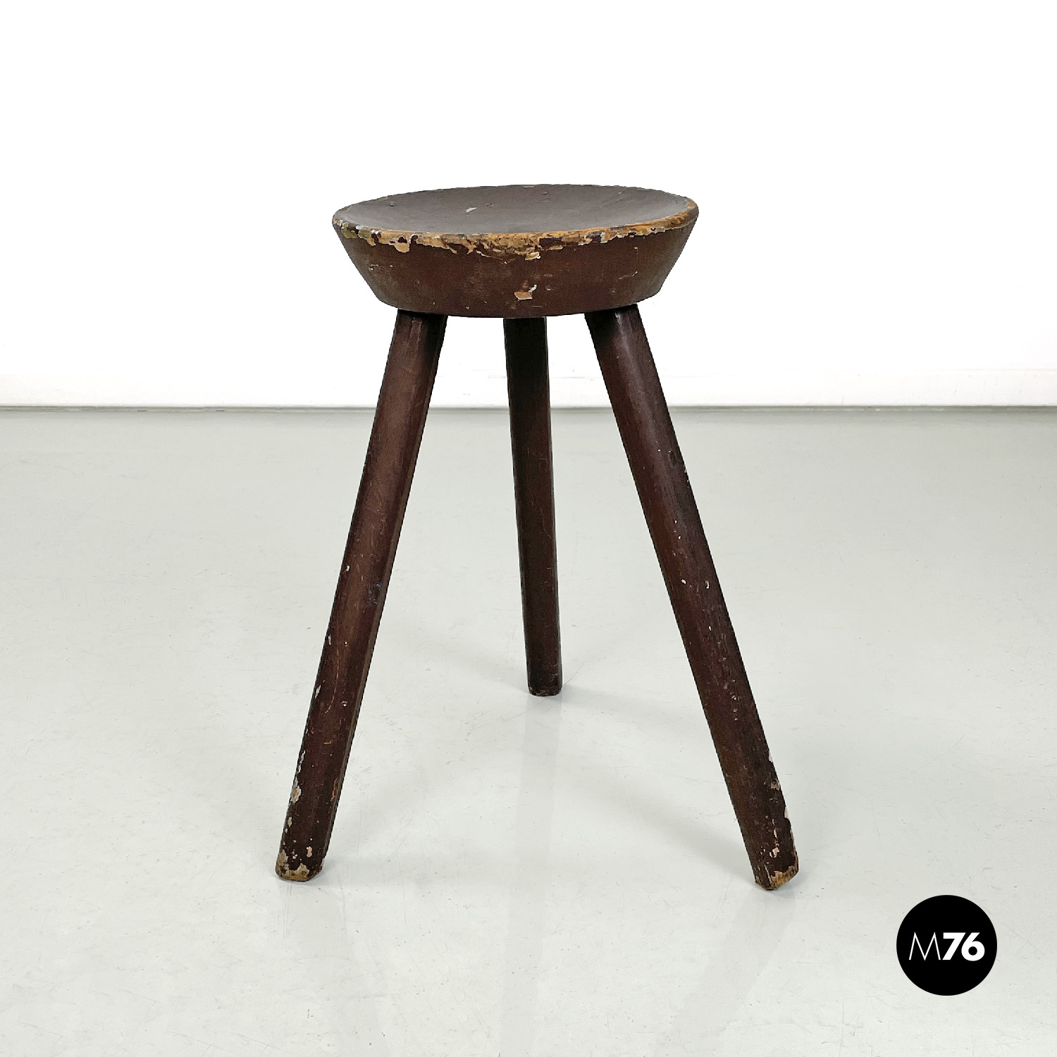 Sgabello in legno verniciato marrone. La seduta è tonda e convessa presenta tre gambe a sezione rettangolare con gli angoli smussati.