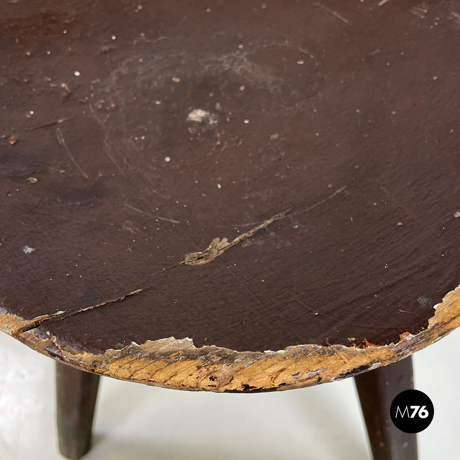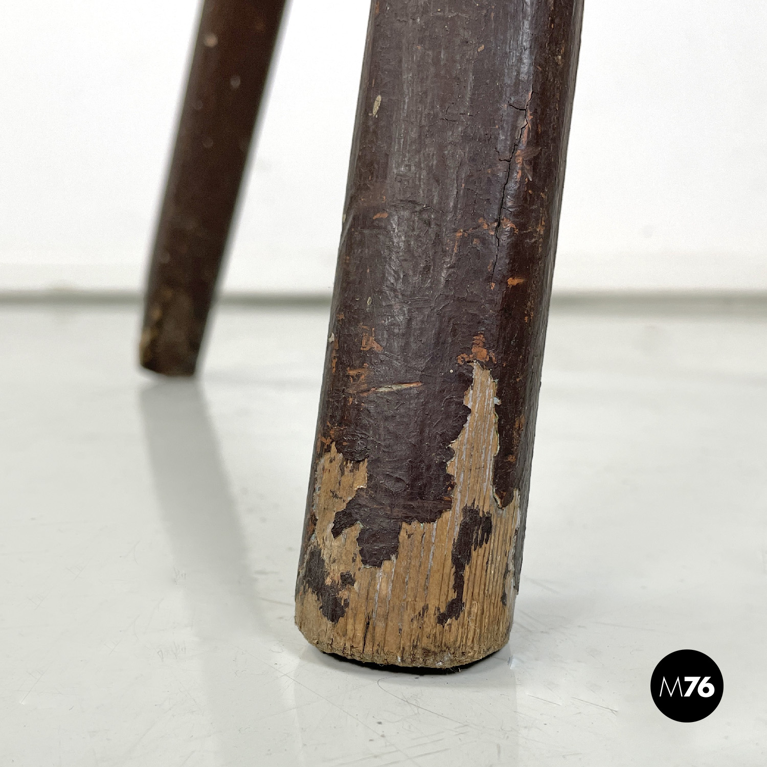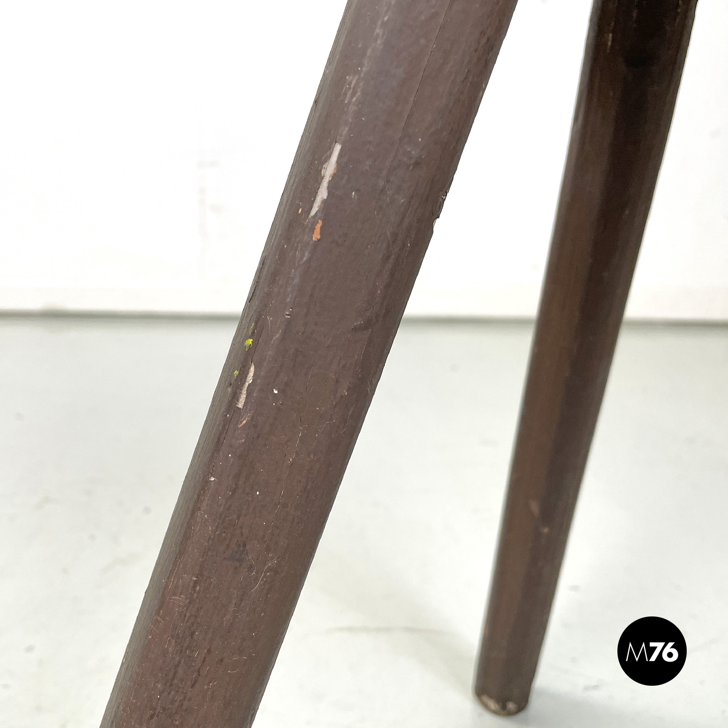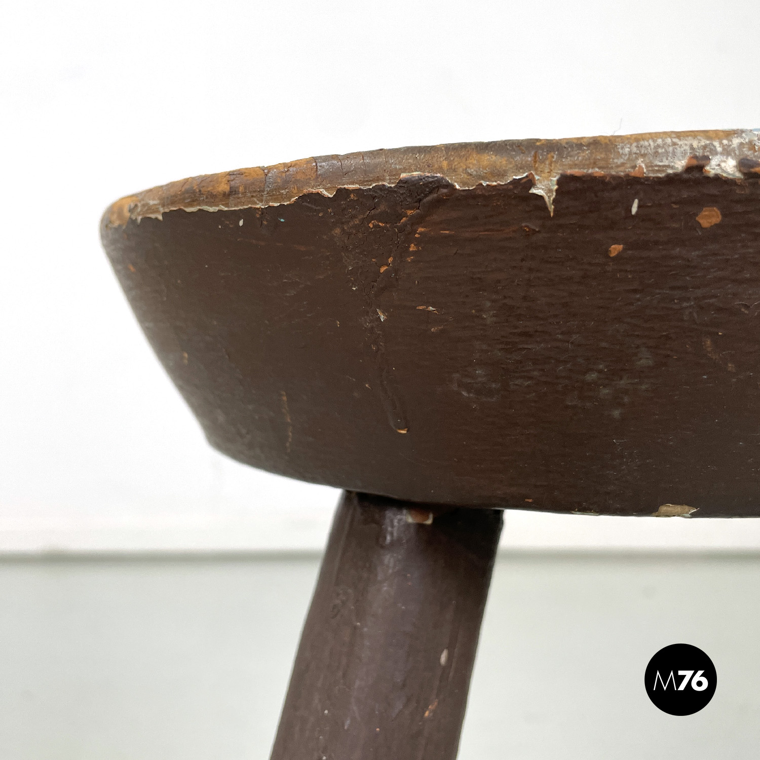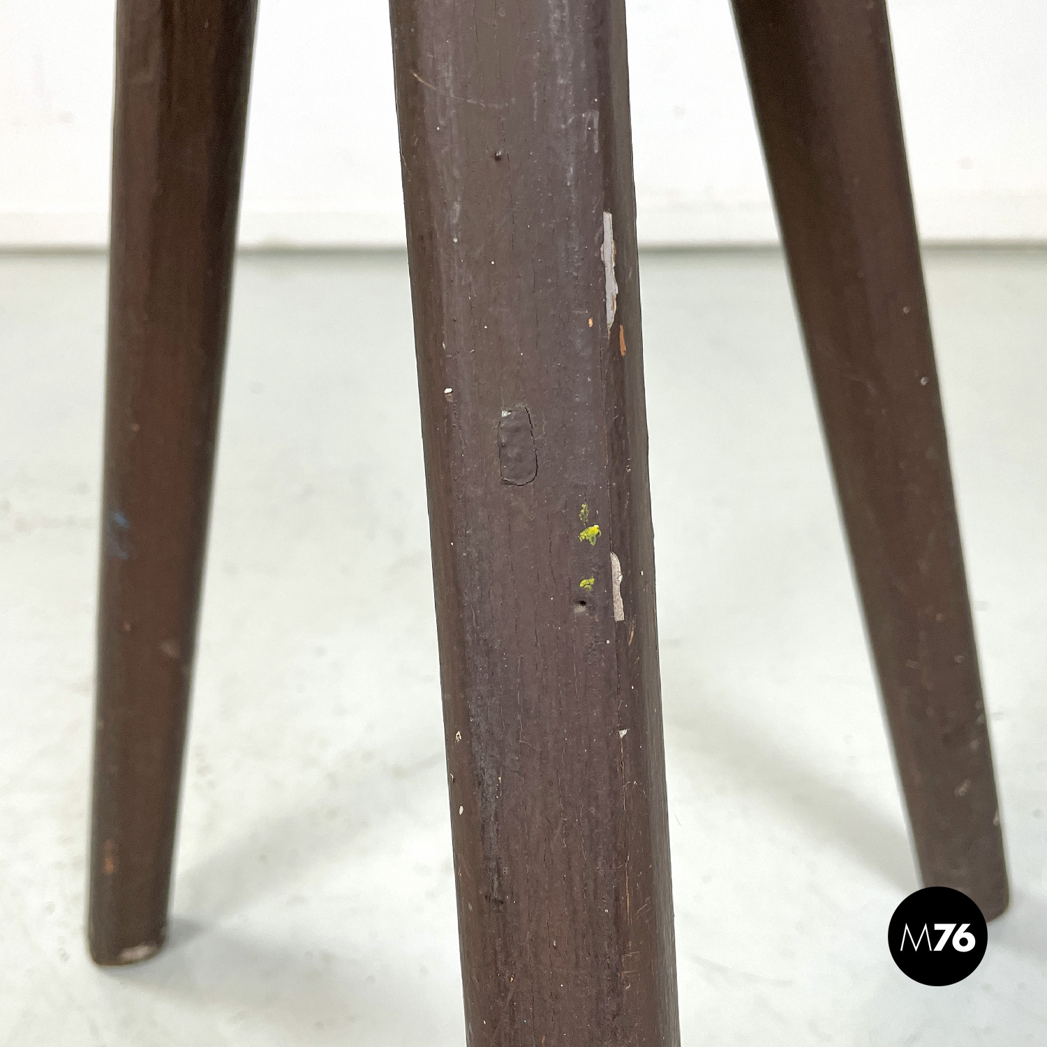 Sgabello in legno verniciato marrone. La seduta è tonda e convessa presenta tre gambe a sezione rettangolare con gli angoli smussati.