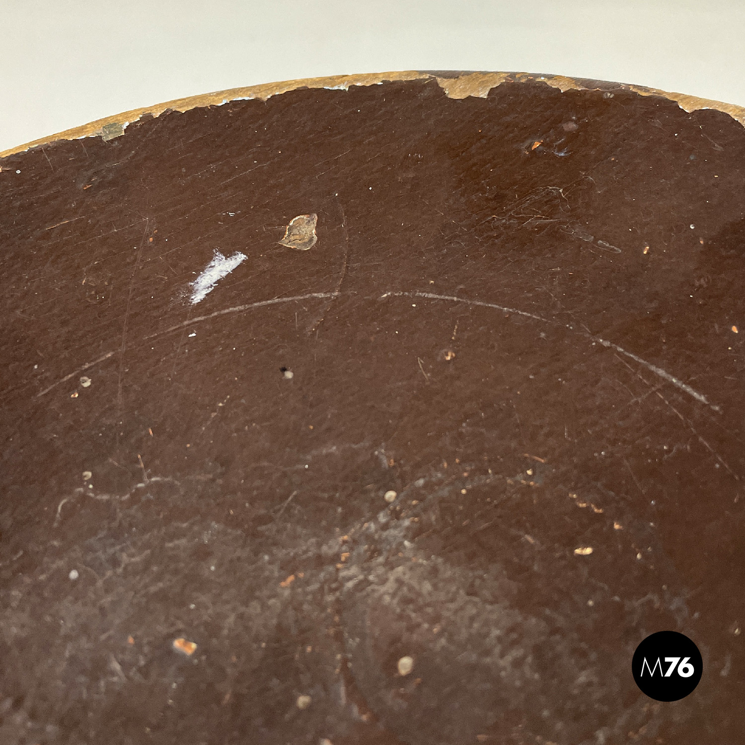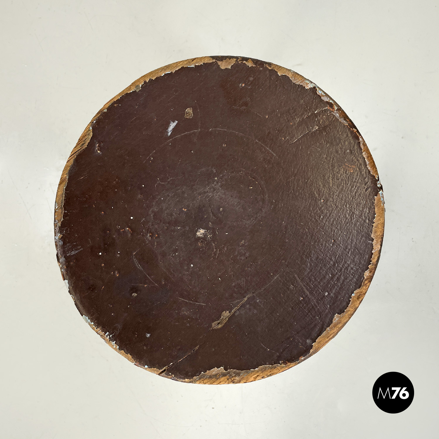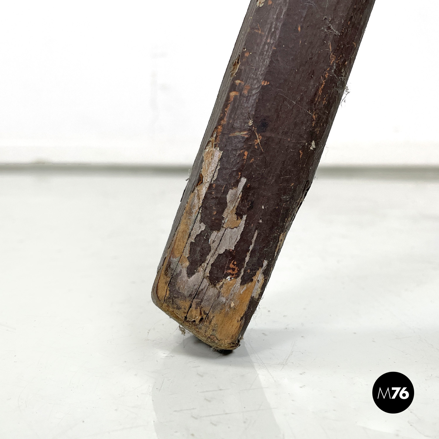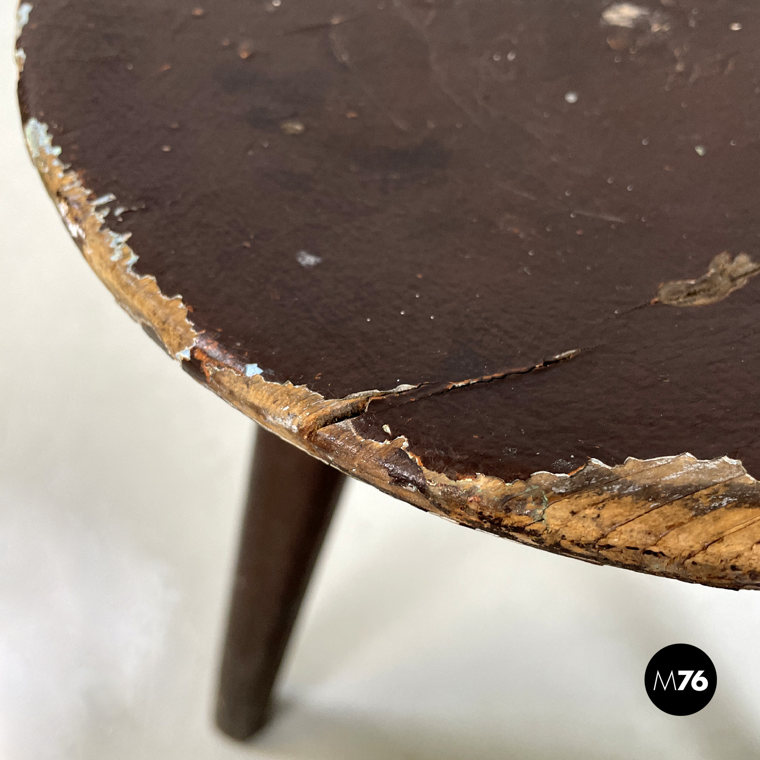 Sgabello in legno verniciato marrone. La seduta è tonda e convessa presenta tre gambe a sezione rettangolare con gli angoli smussati.
