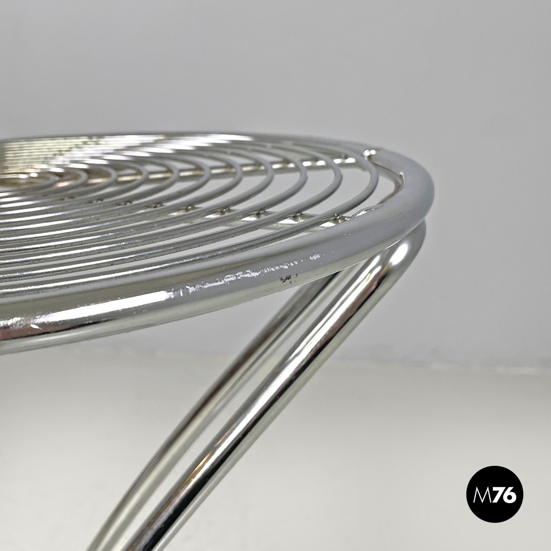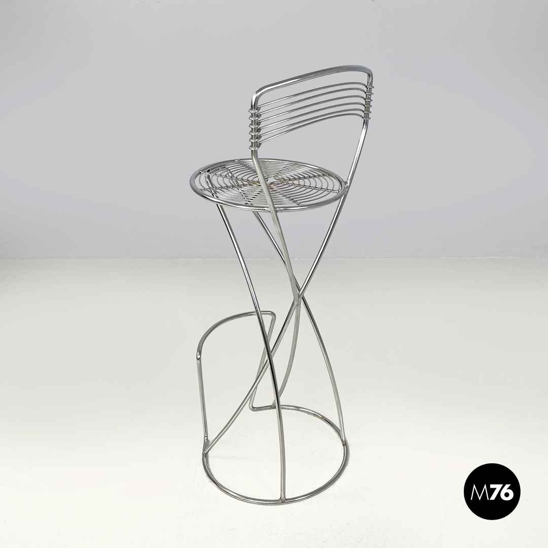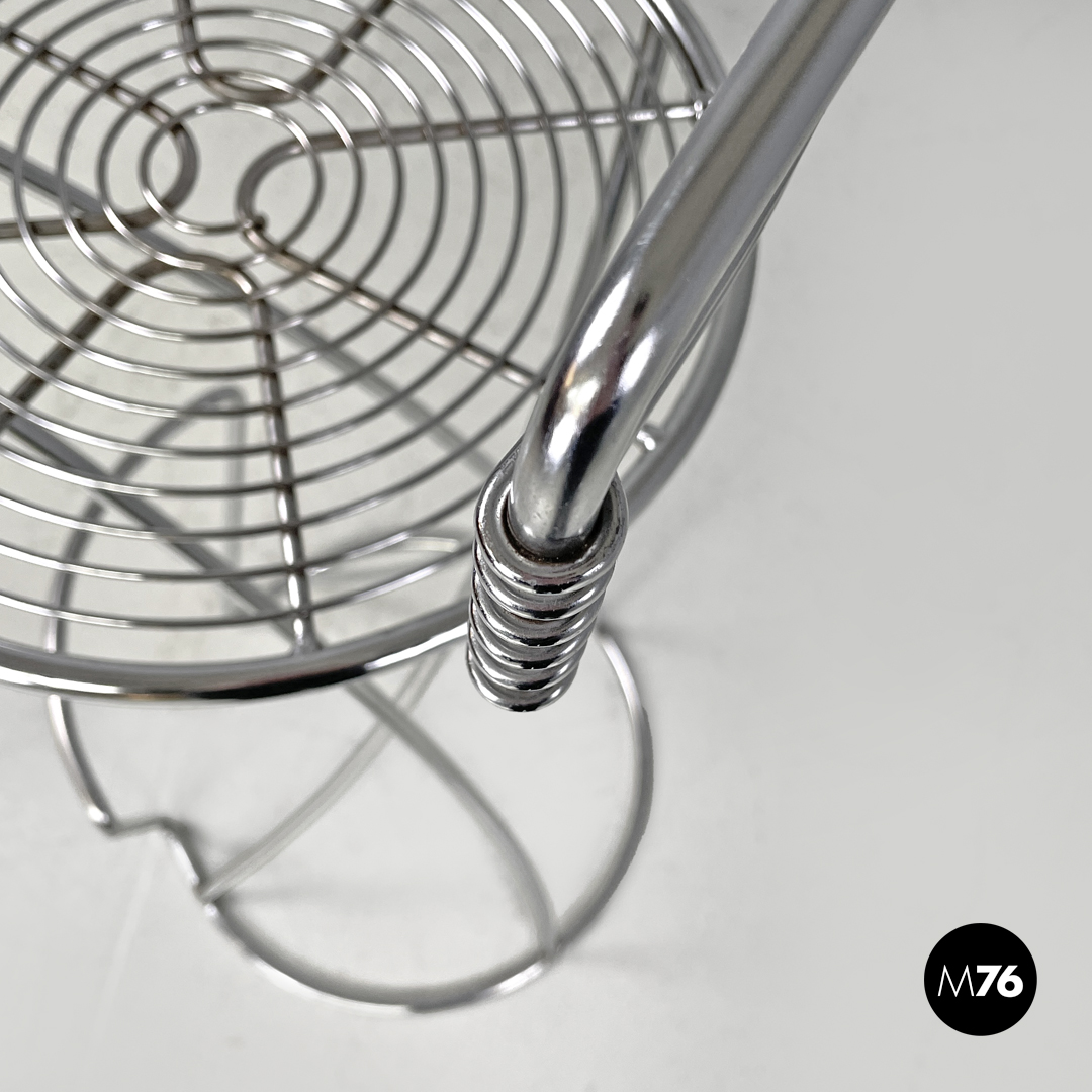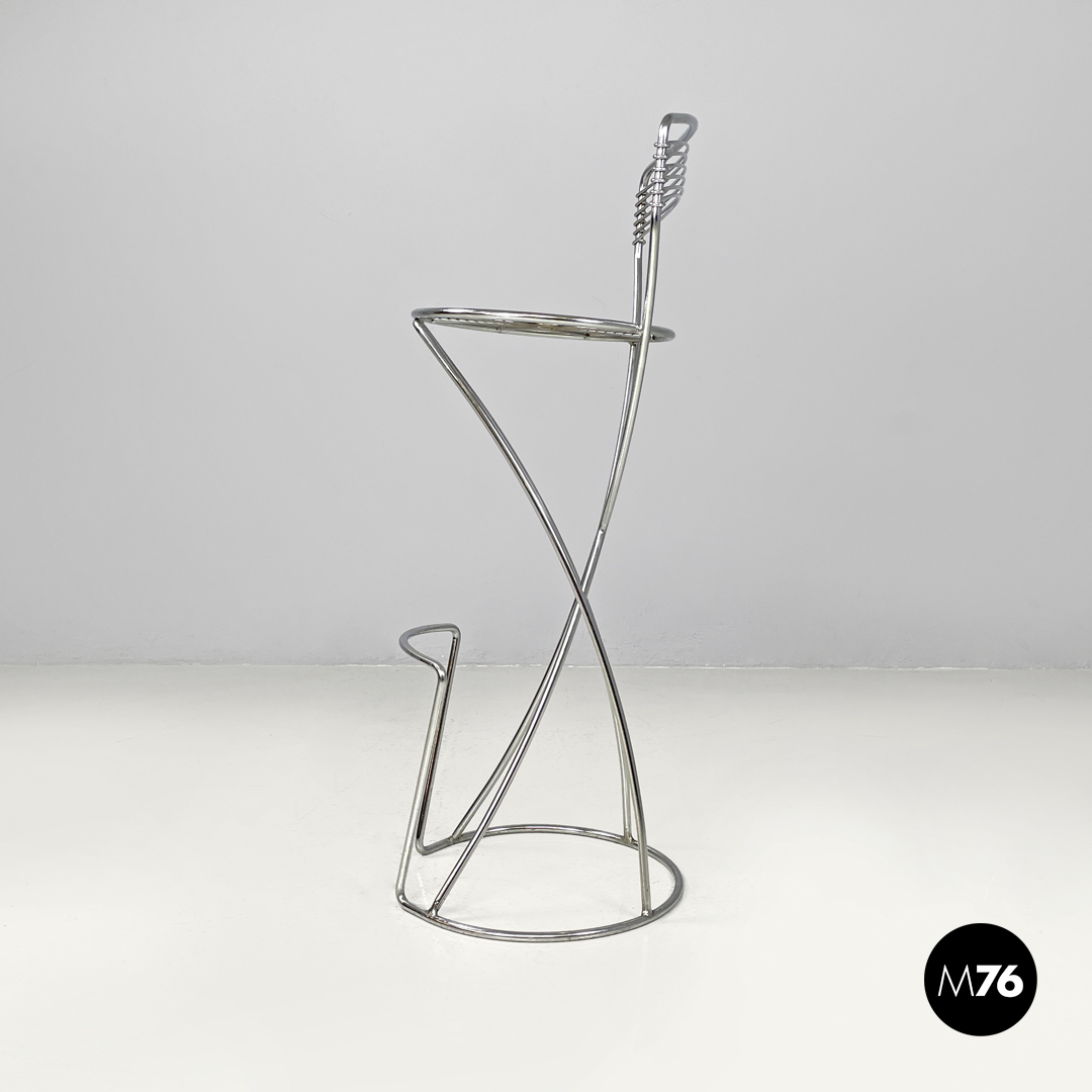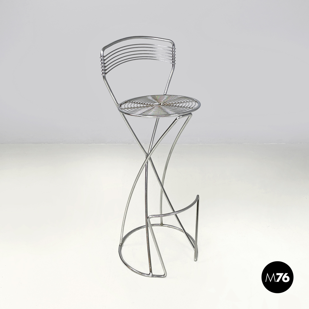 Sgabello a base tonda. La struttura è in tondino di metallo cromato la seduta è composta da un tondino che si sviluppa a spirale. Le quattro gambe si incrociano a formare due “x” la parte frontale della base presenta un poggiapiedi.