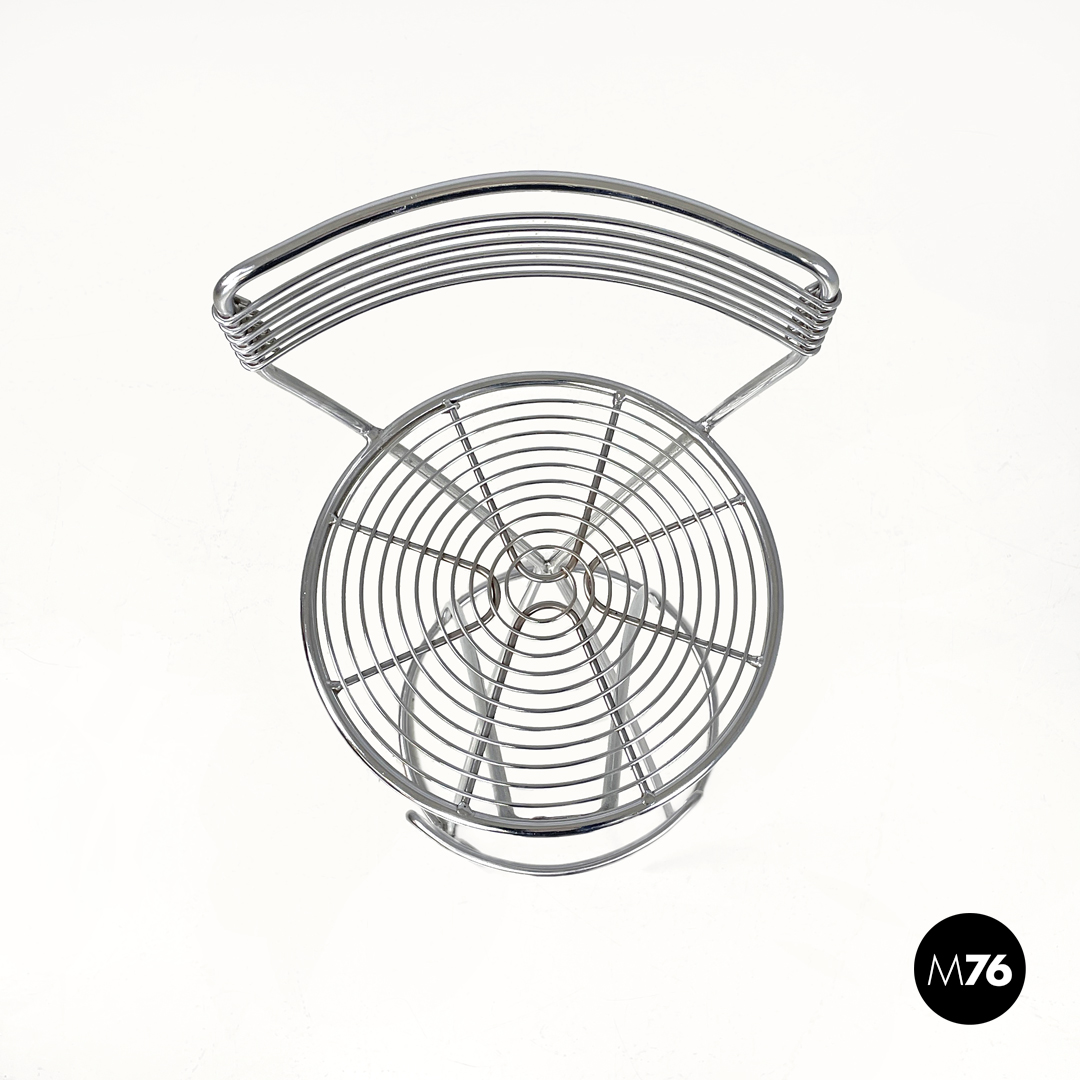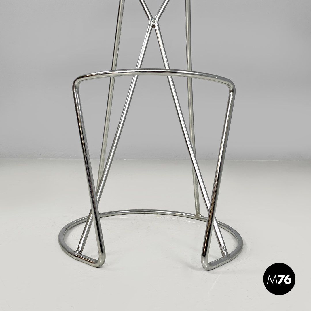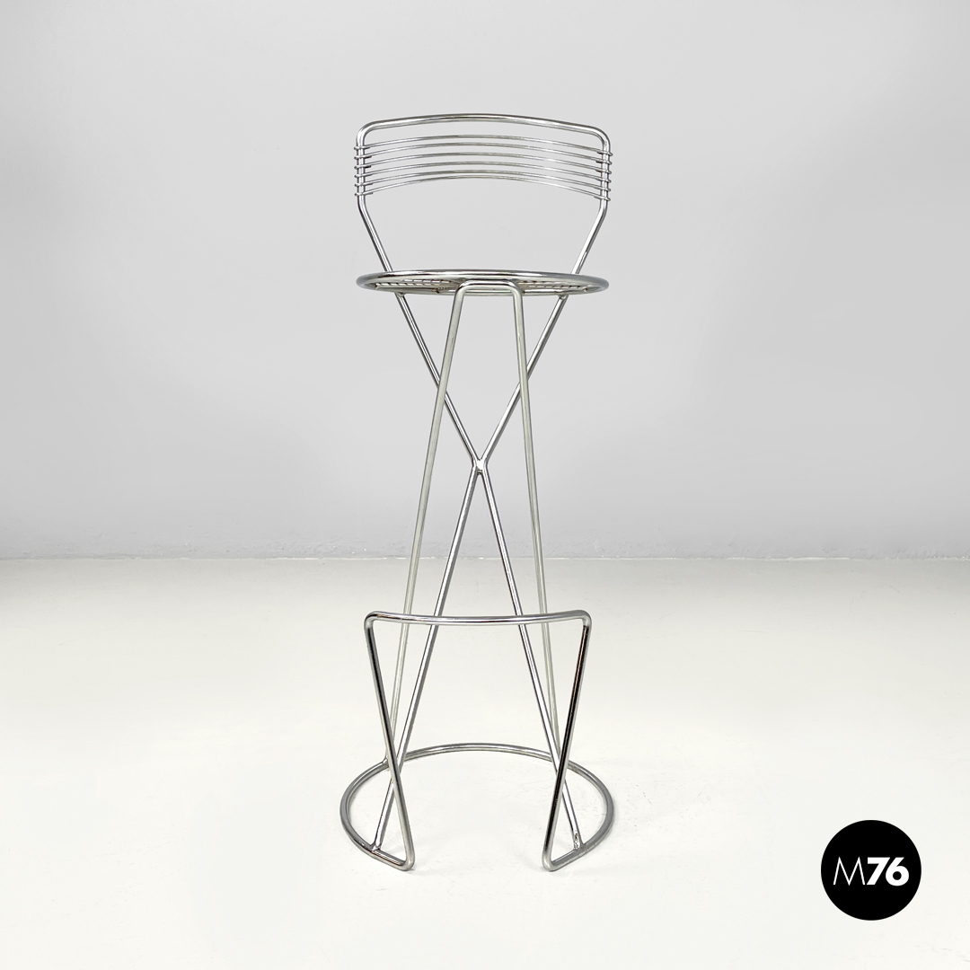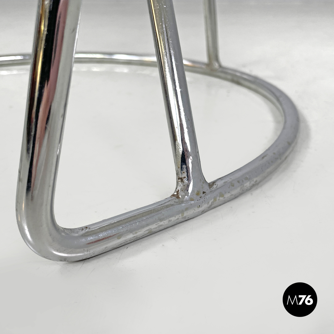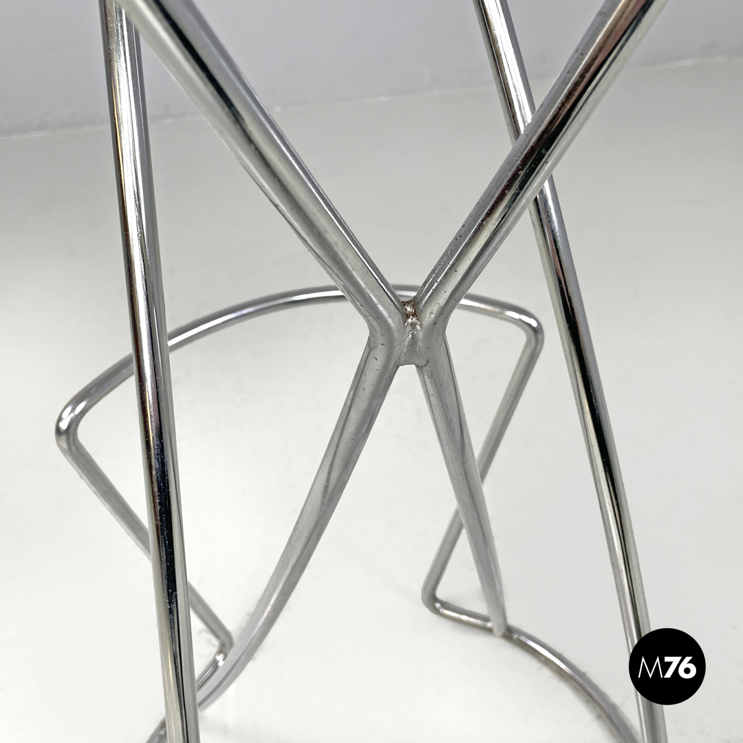 Sgabello a base tonda. La struttura è in tondino di metallo cromato la seduta è composta da un tondino che si sviluppa a spirale. Le quattro gambe si incrociano a formare due “x” la parte frontale della base presenta un poggiapiedi.