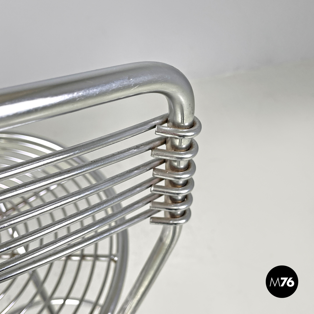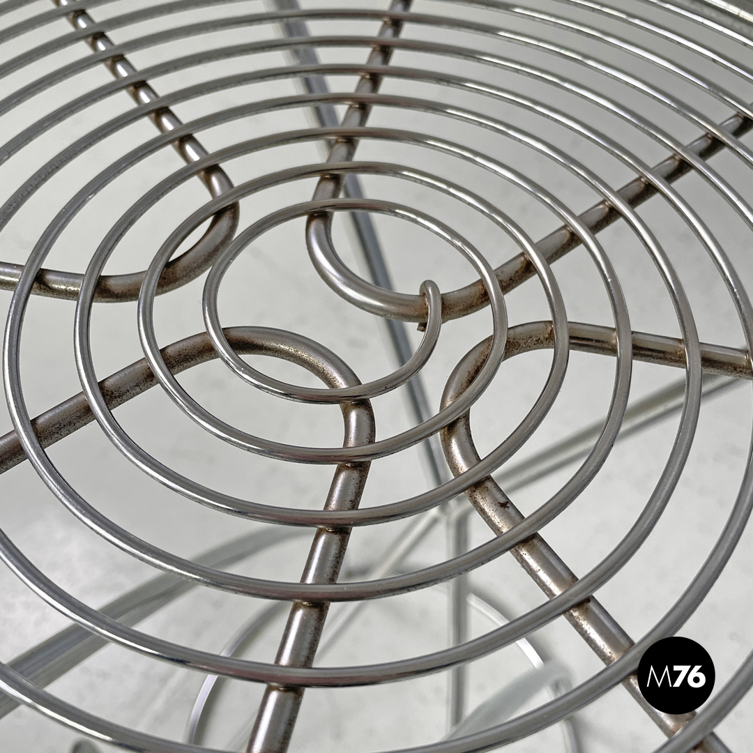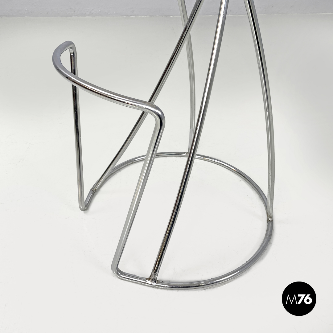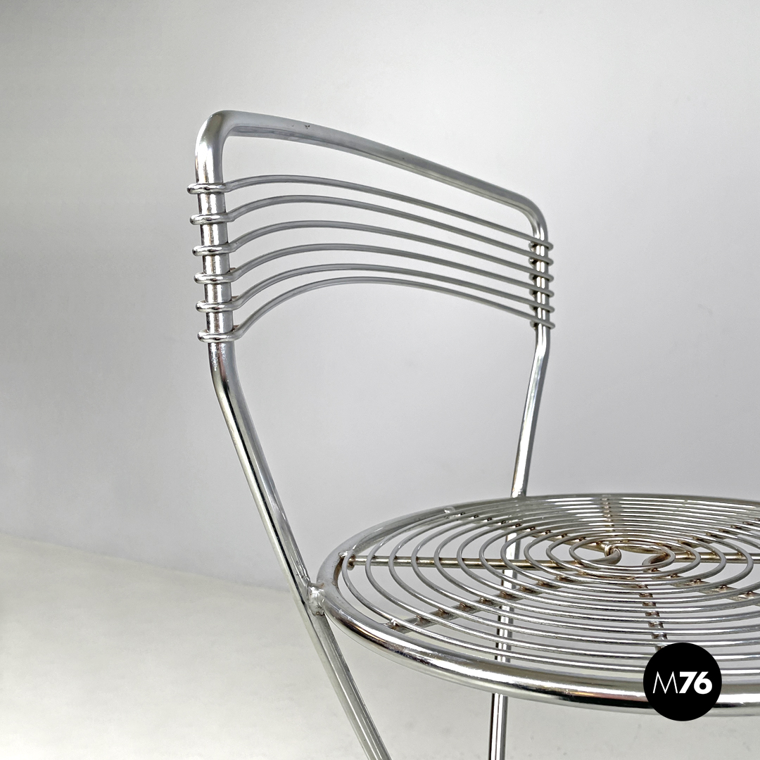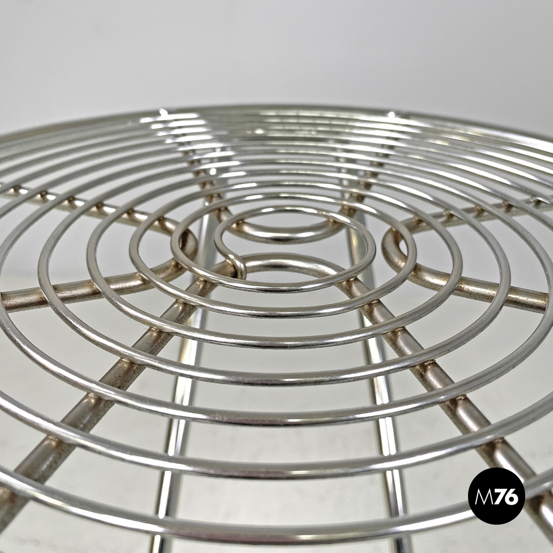 Sgabello a base tonda. La struttura è in tondino di metallo cromato la seduta è composta da un tondino che si sviluppa a spirale. Le quattro gambe si incrociano a formare due “x” la parte frontale della base presenta un poggiapiedi.