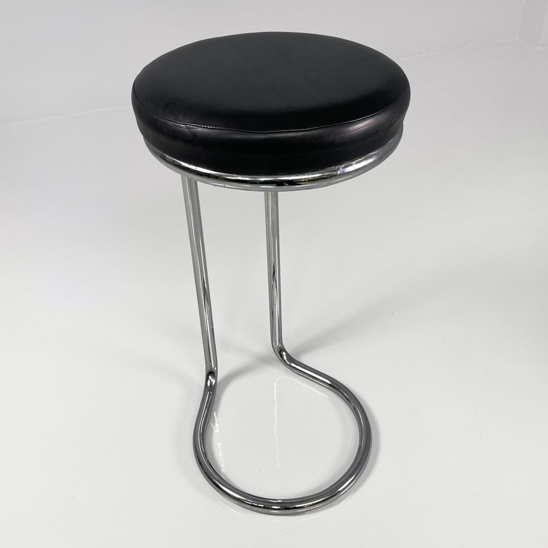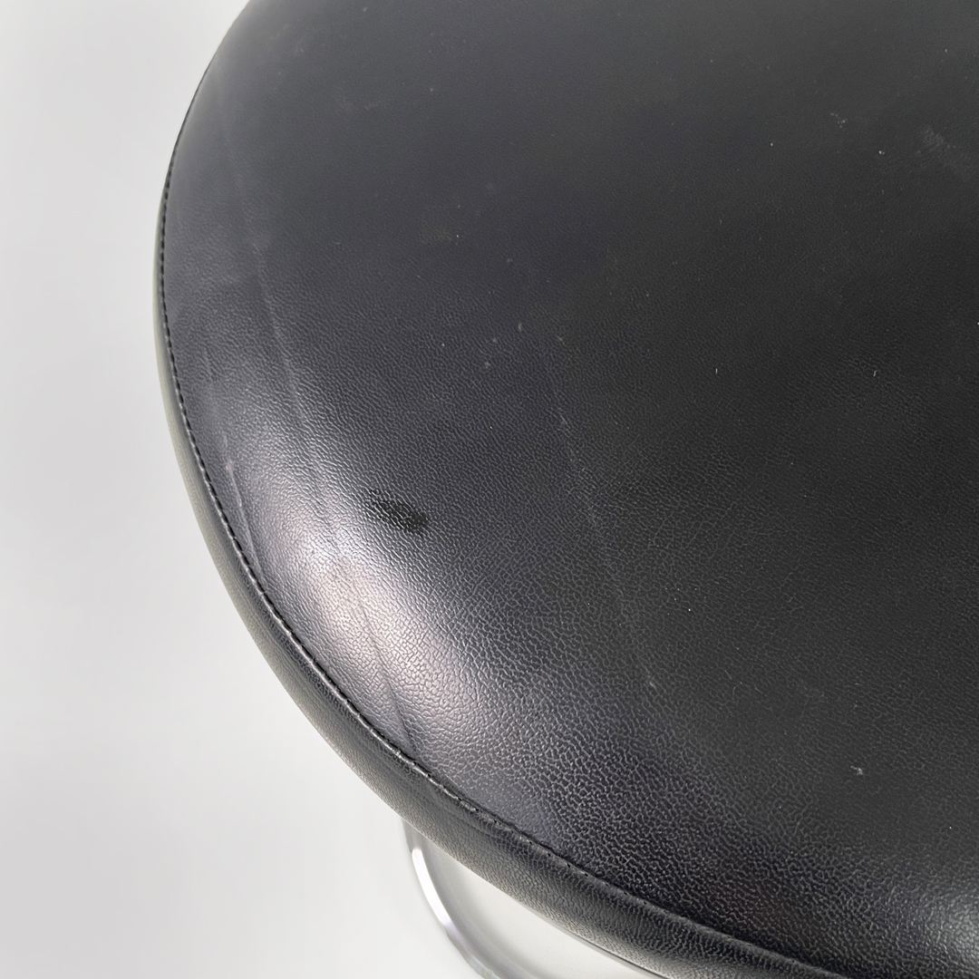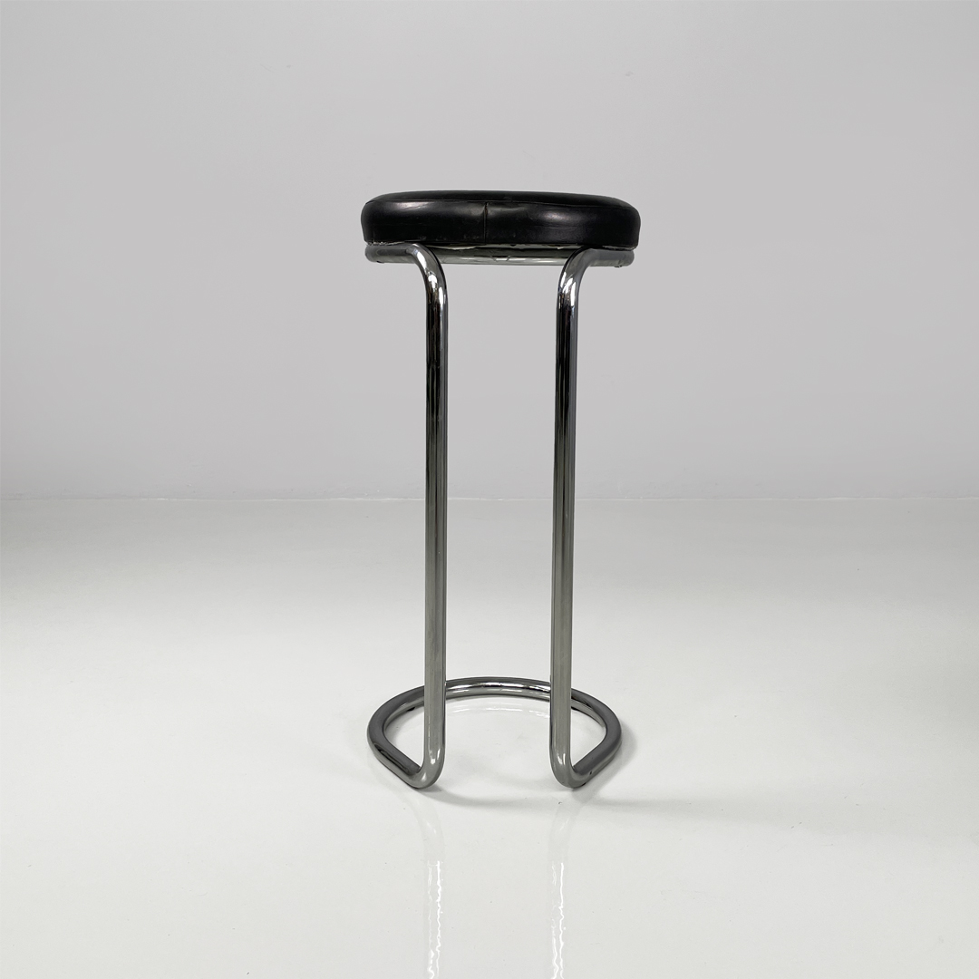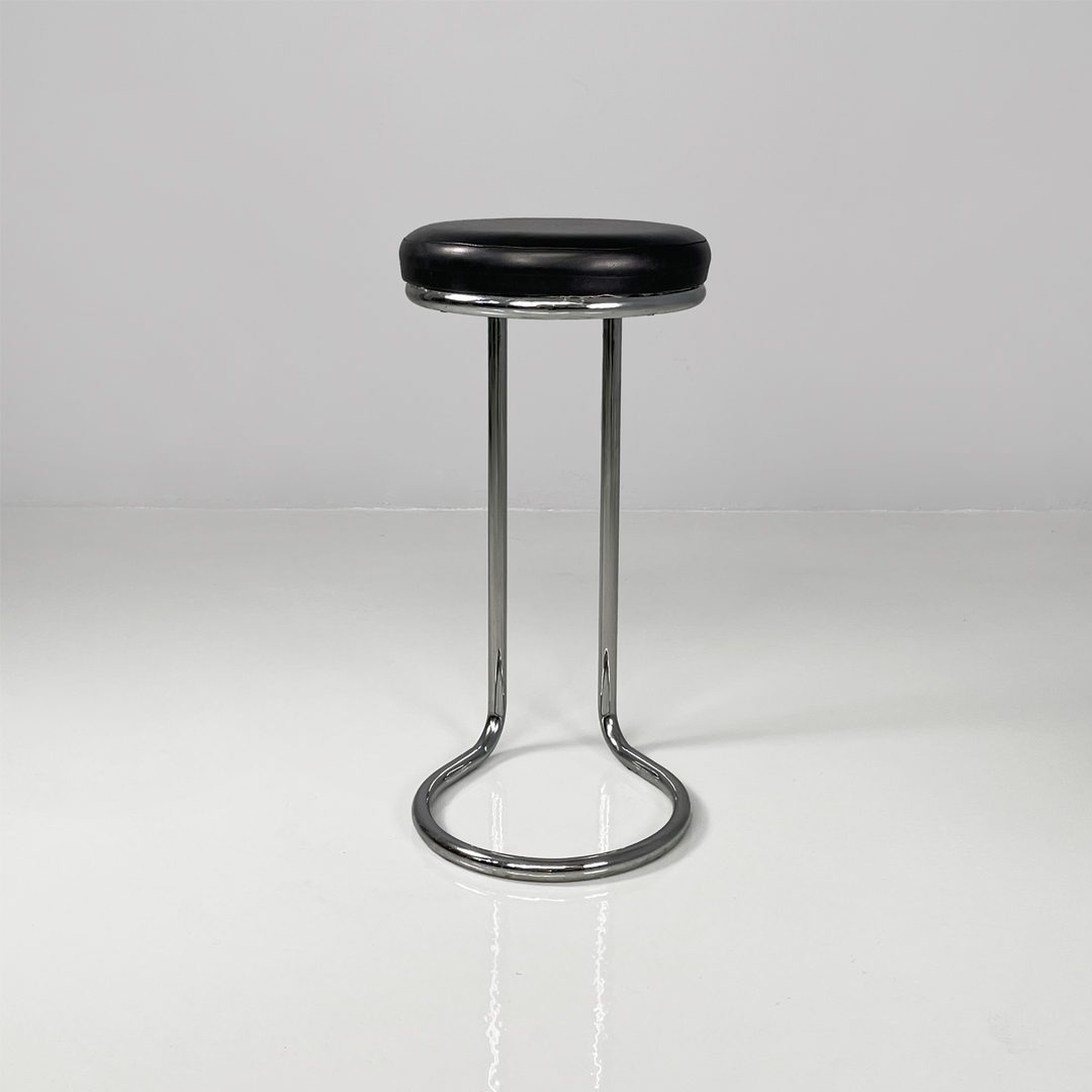 Sgabello a base tonda. La struttura è in tondino di metallo cromato, la seduta è in pelle nera.