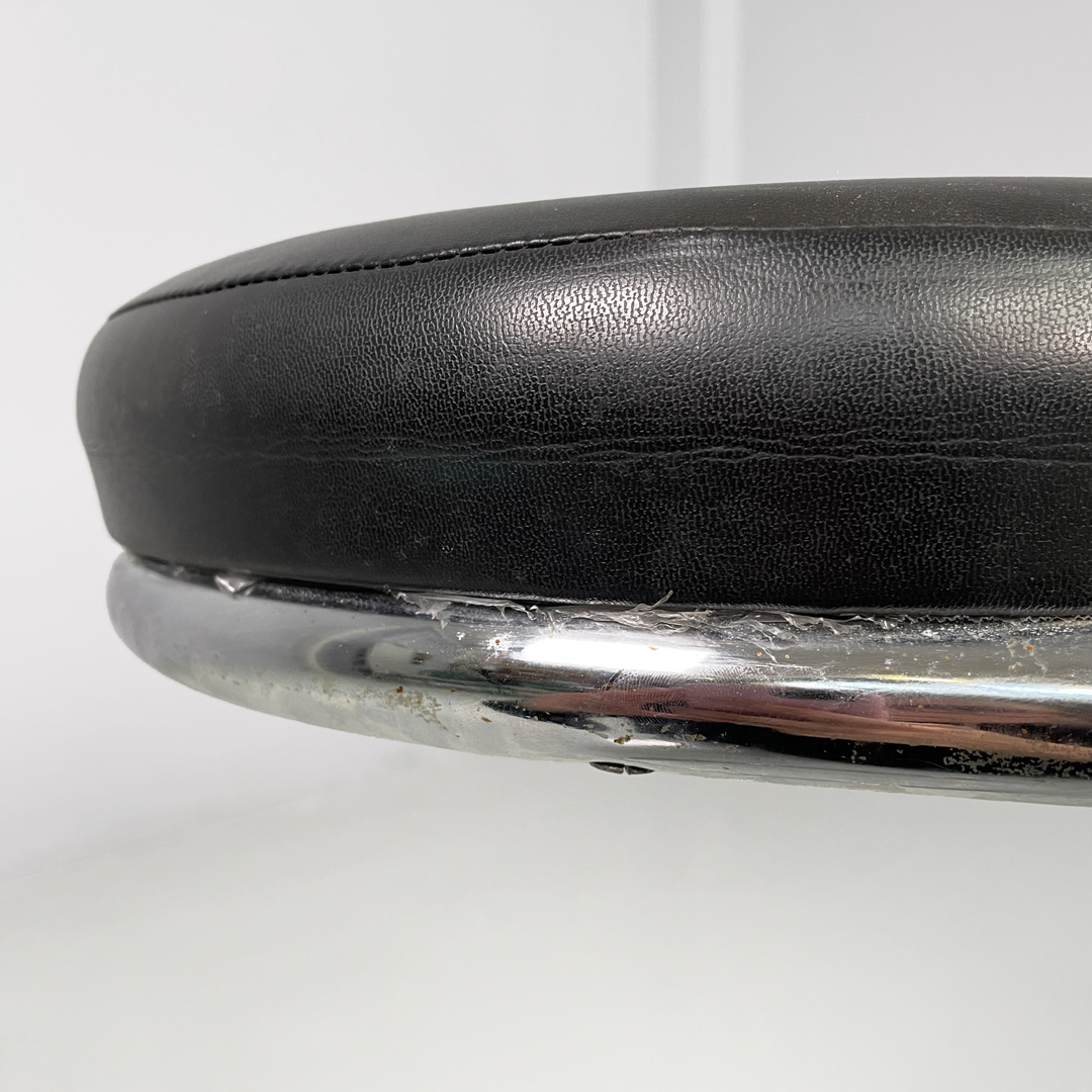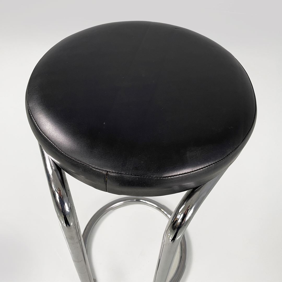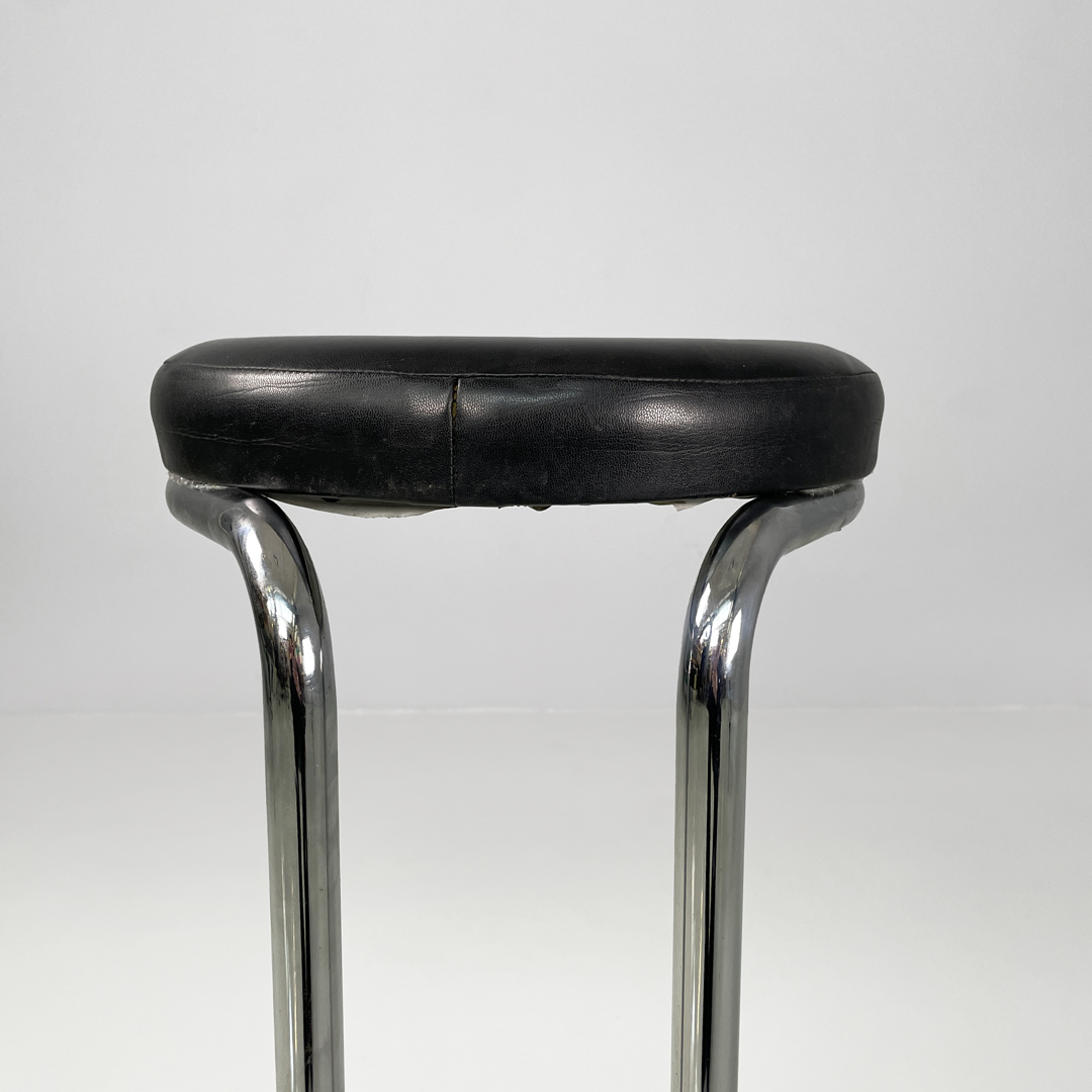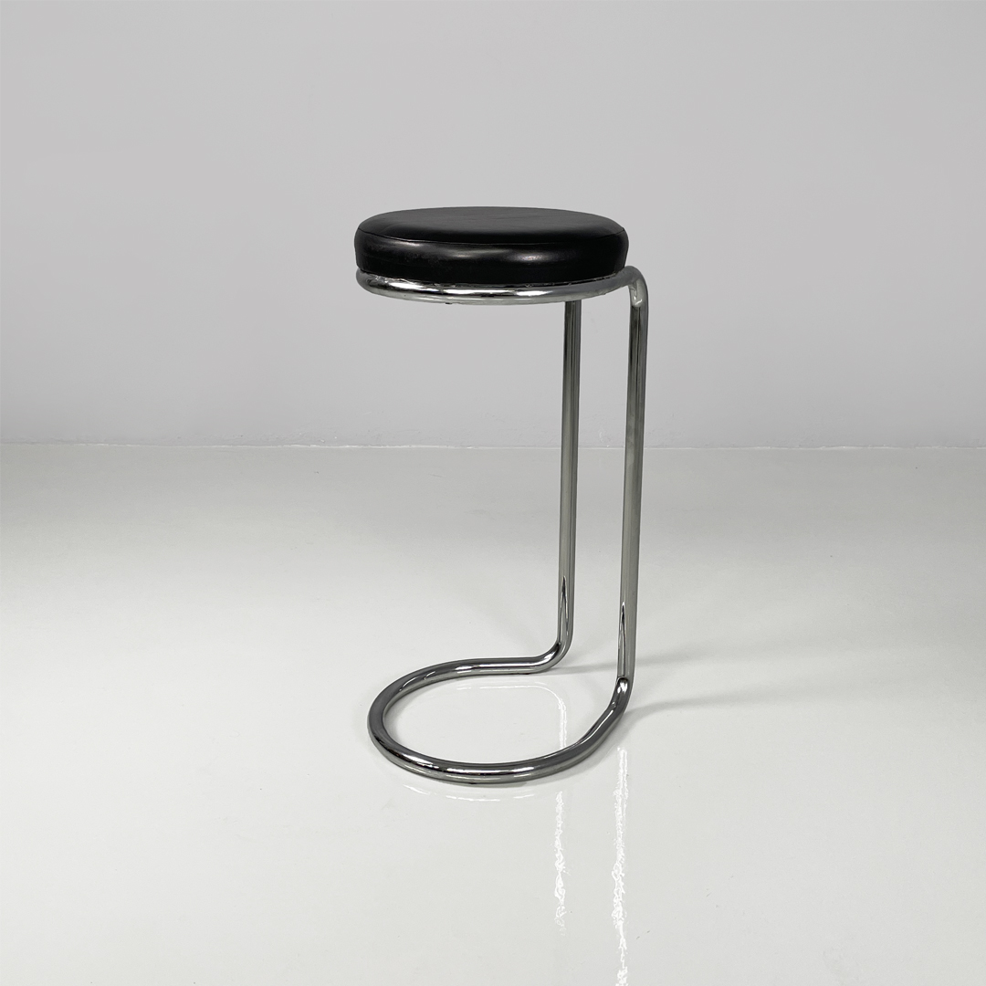 Sgabello a base tonda. La struttura è in tondino di metallo cromato, la seduta è in pelle nera.