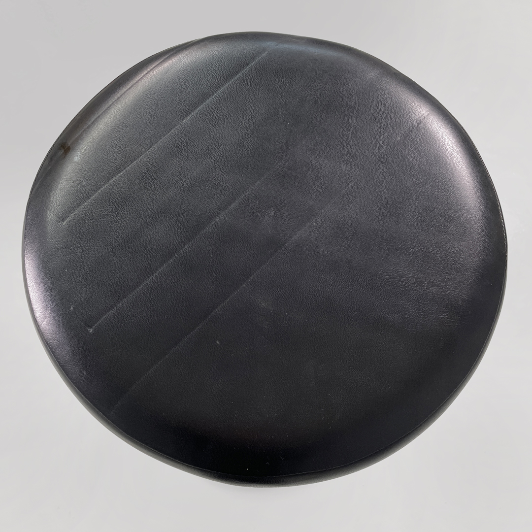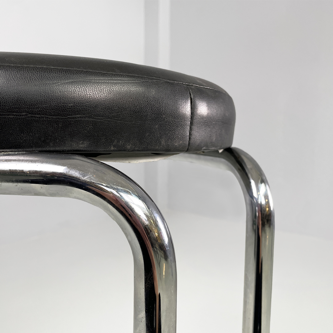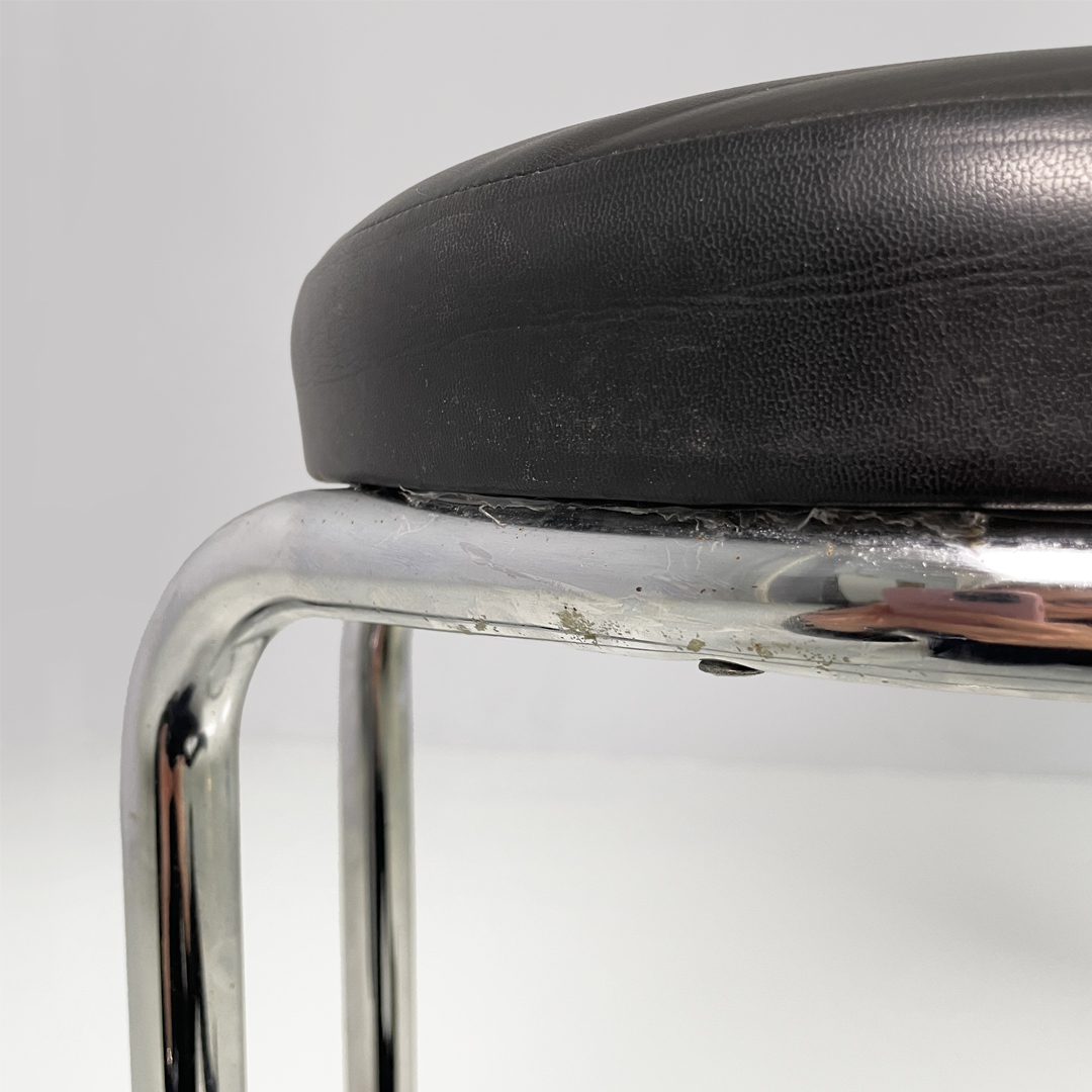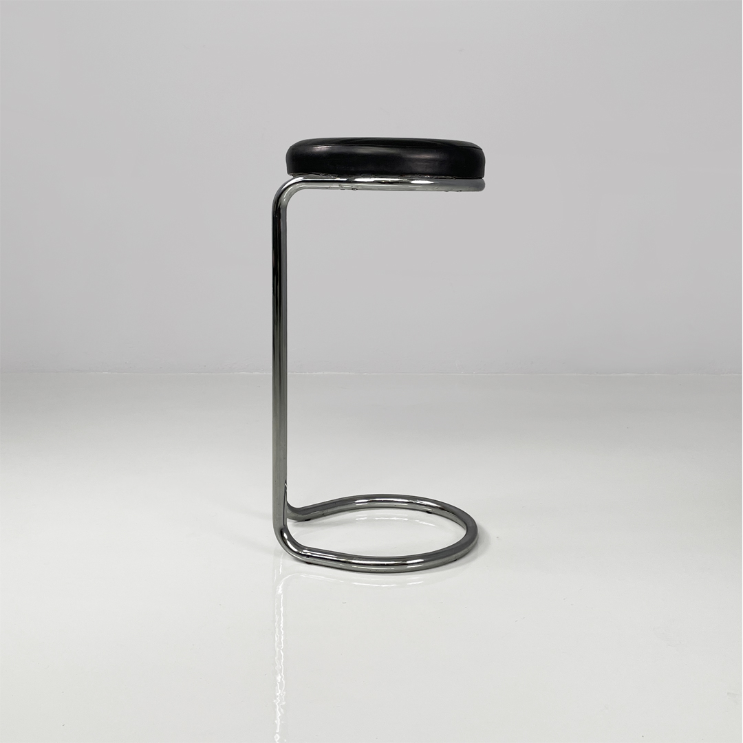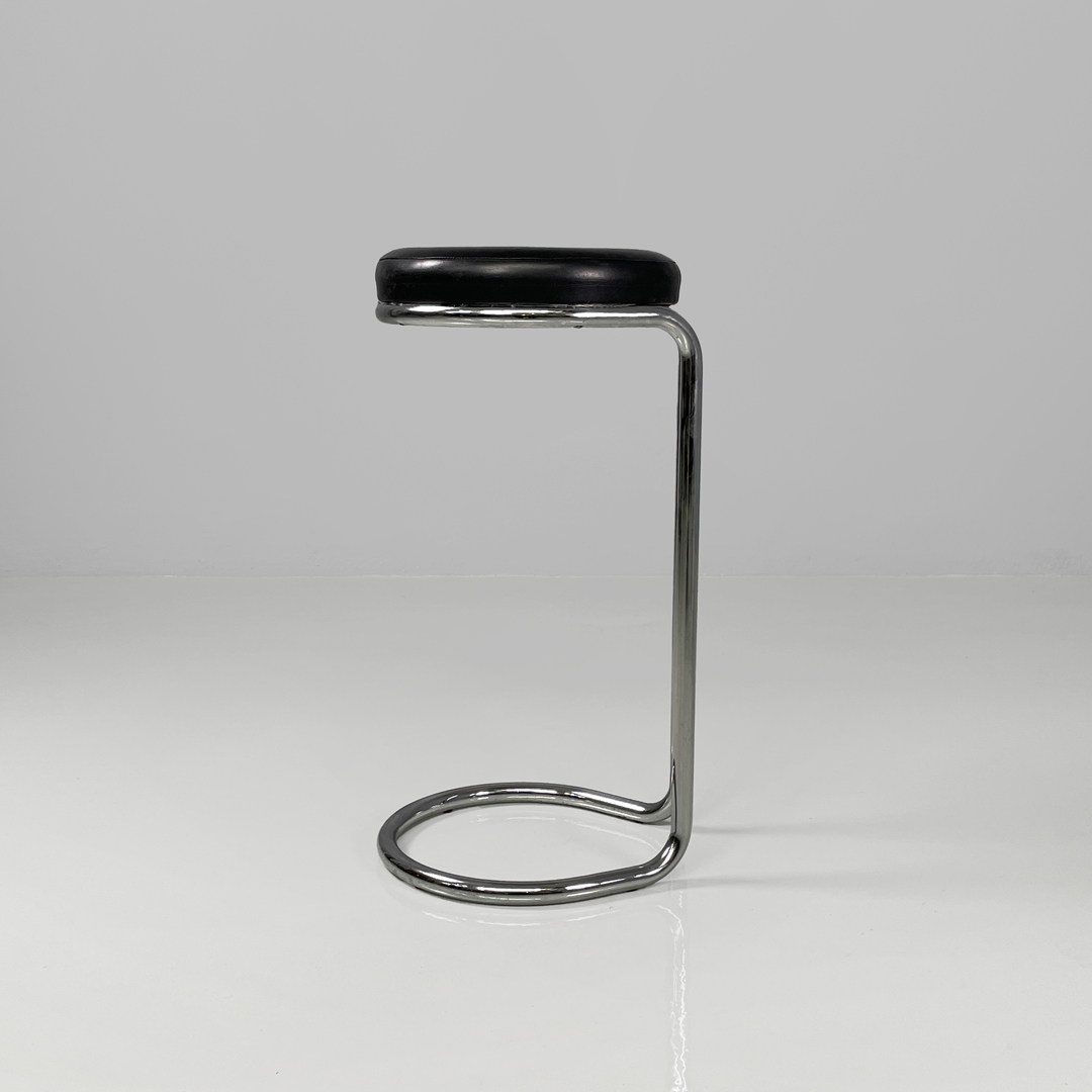 Sgabello a base tonda. La struttura è in tondino di metallo cromato, la seduta è in pelle nera.