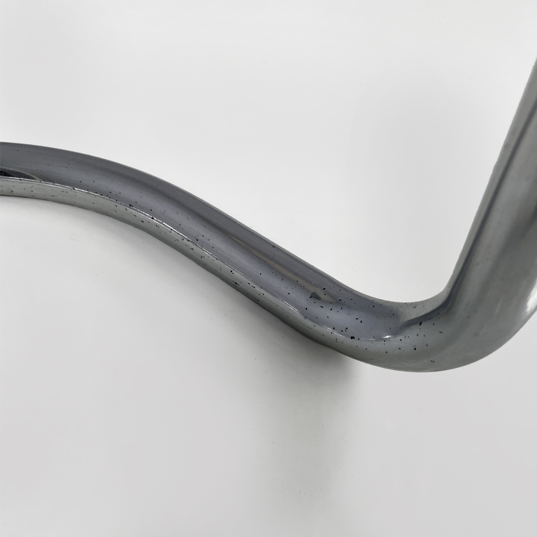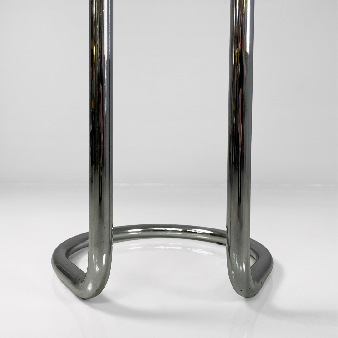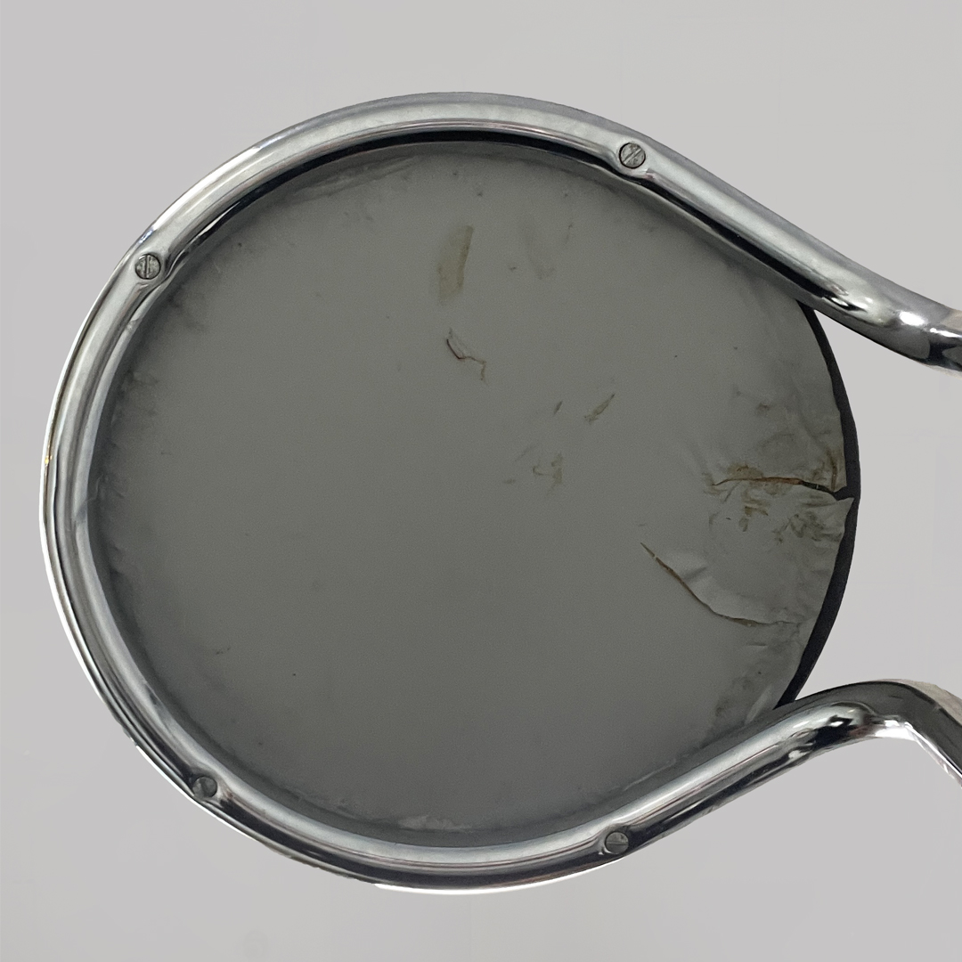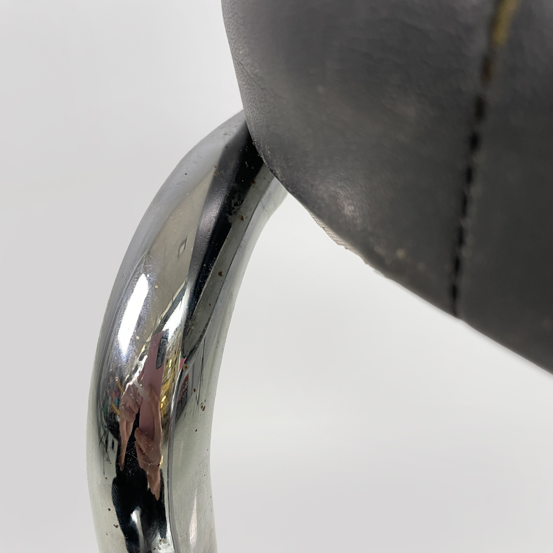 Sgabello a base tonda. La struttura è in tondino di metallo cromato, la seduta è in pelle nera.