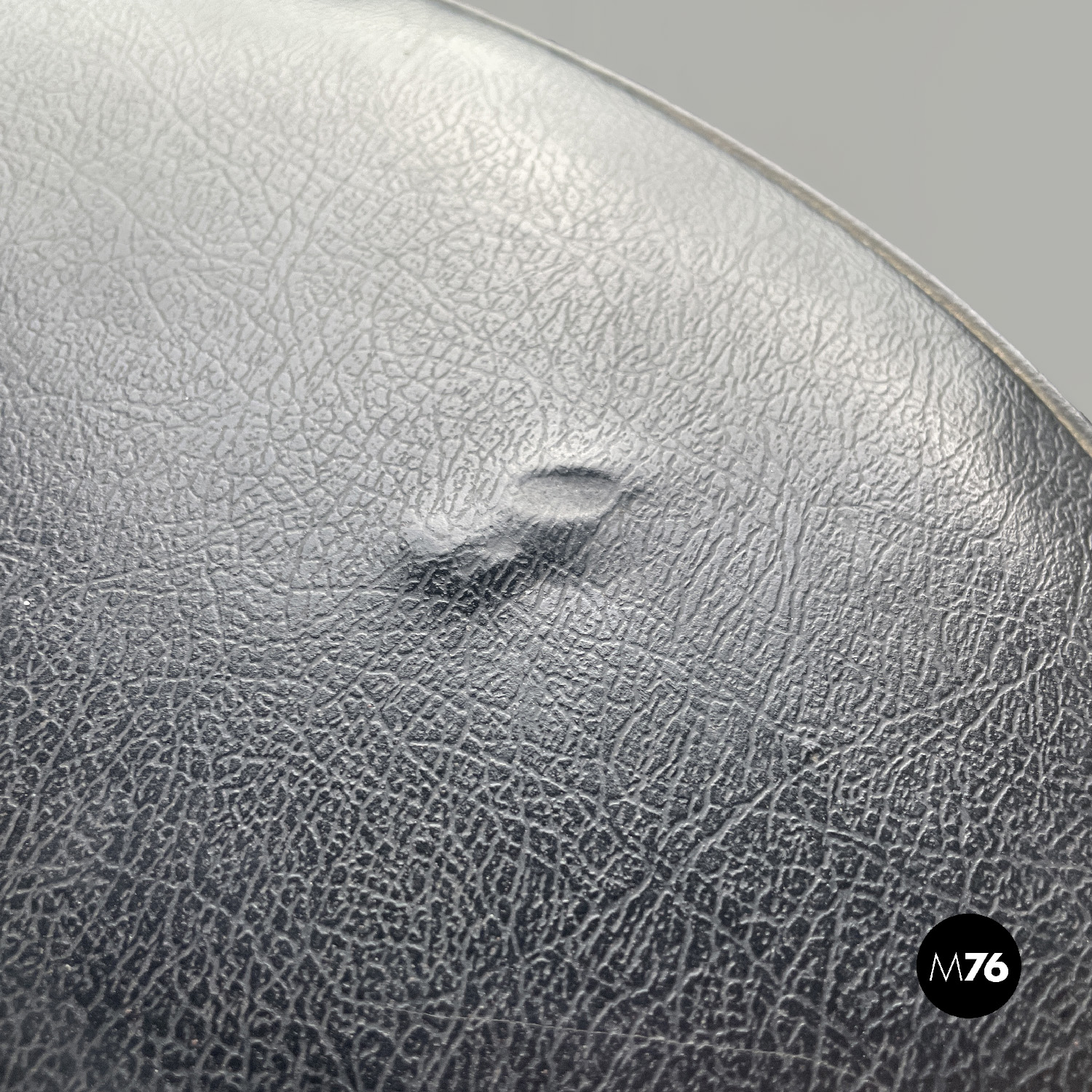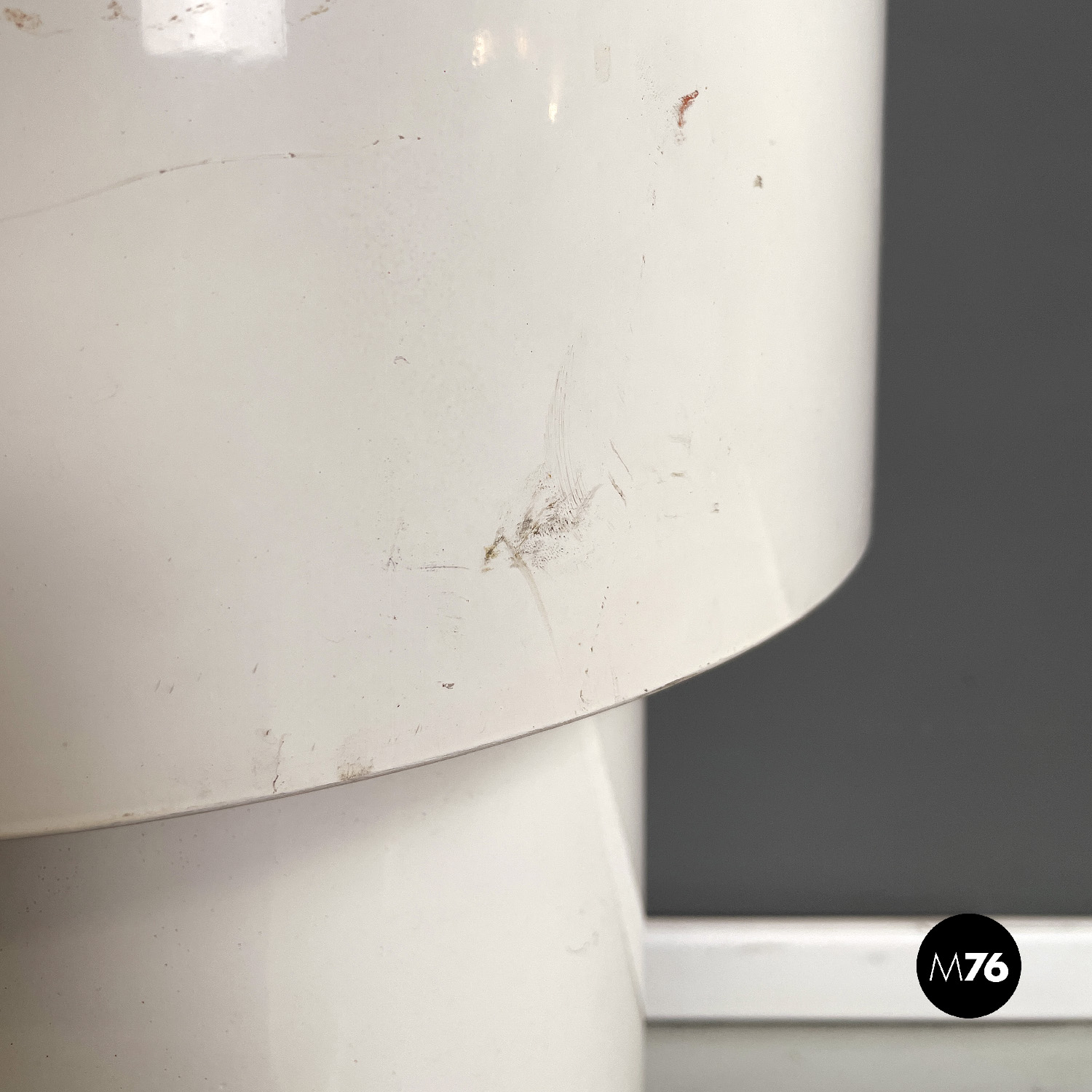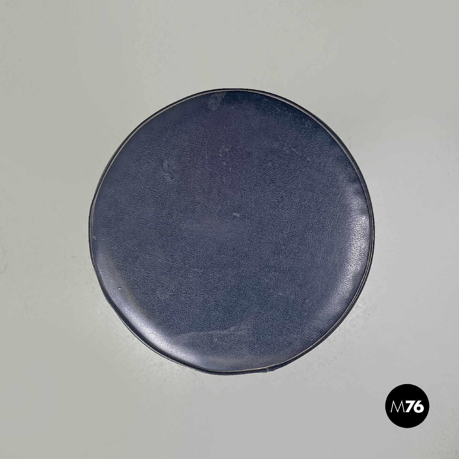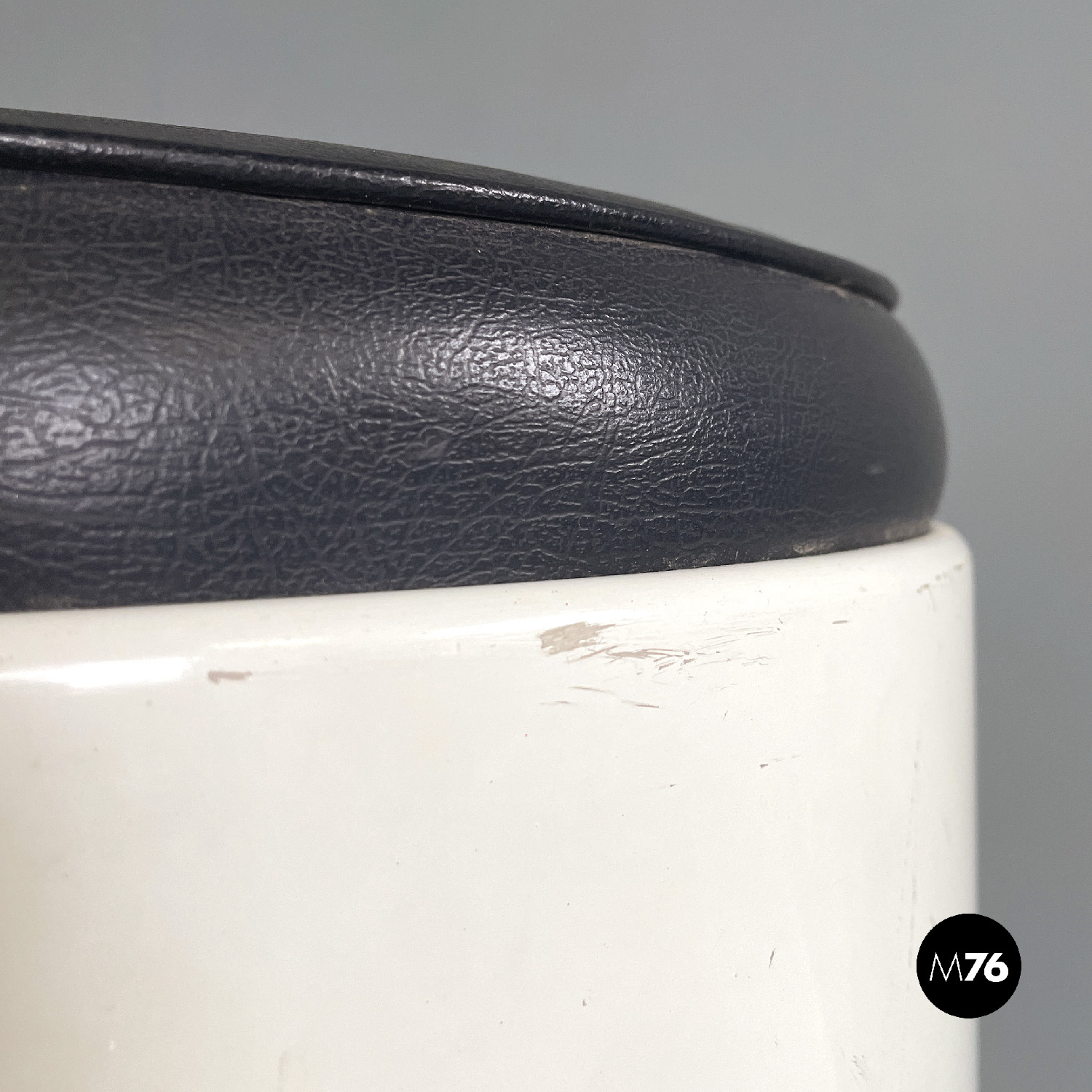 Sgabello da bar Space Age a base tonda. La struttura è in plastica spessa bianca ed è composta da un cilindro più grande tagliato che copre per metà il cilindro più piccolo che fa da struttura. La seduta è tonda ed è imbottita e rivestita di pelle nera. La base è anch’essa tonda e in legno dipinto nero.