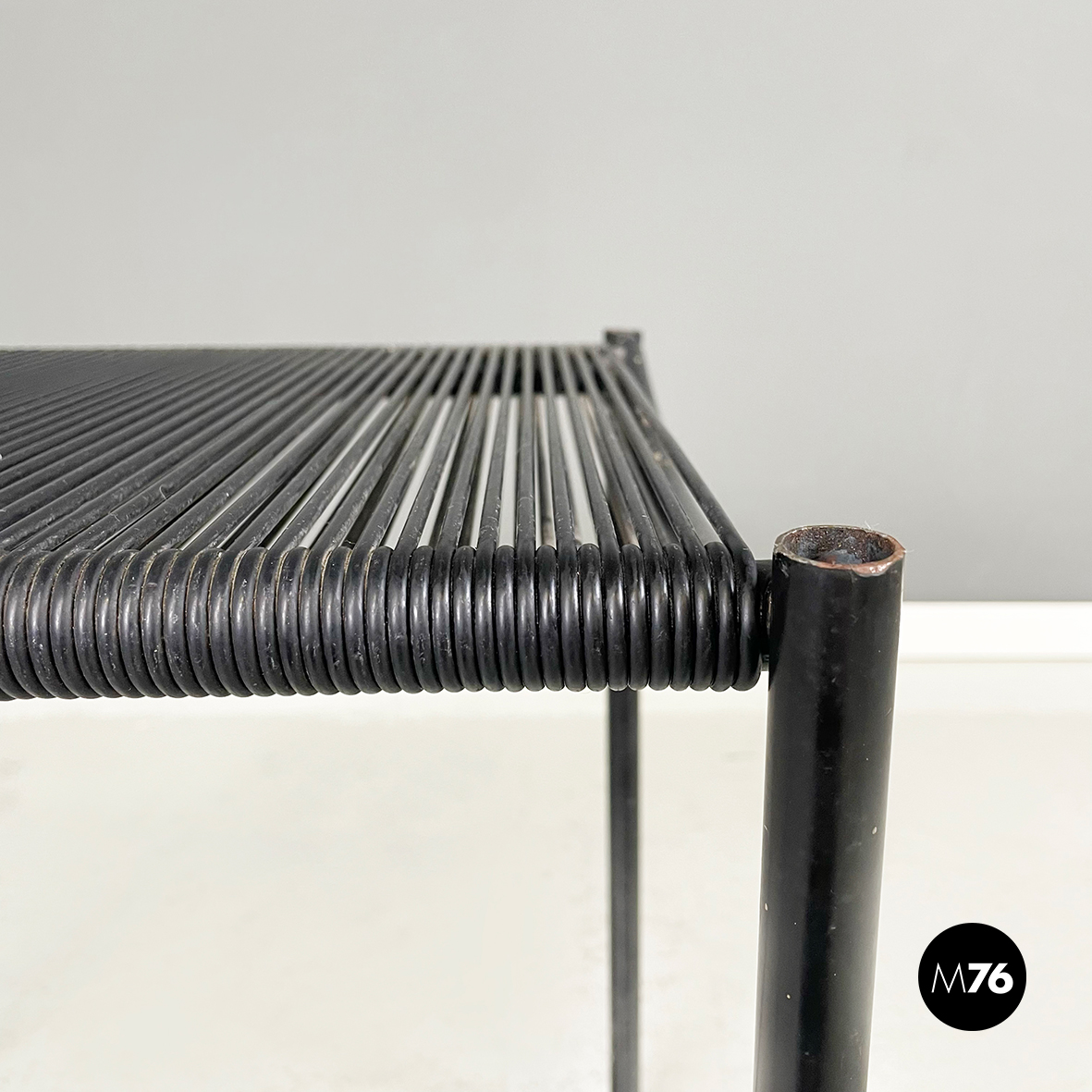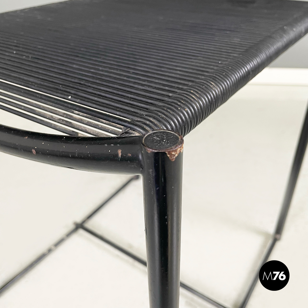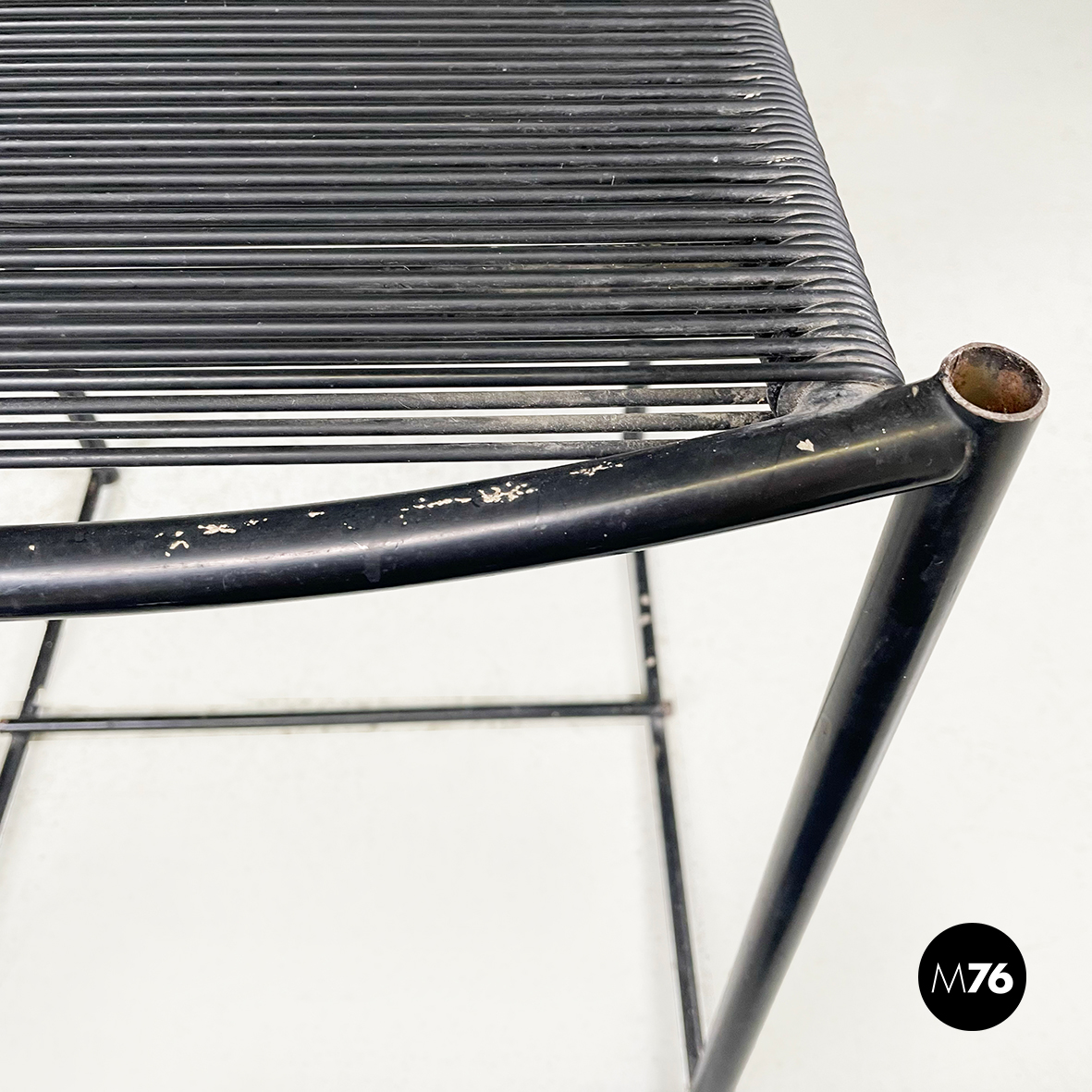 Sgabello modello Spaghetti  con seduta e schienale rettangolari ed elastici realizzati da fili di scooby nero. La struttura è in tondino di metallo verniciato nero con manico curvato dietro lo schienale.