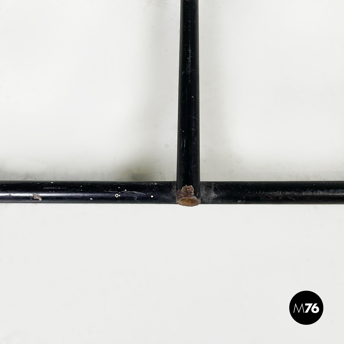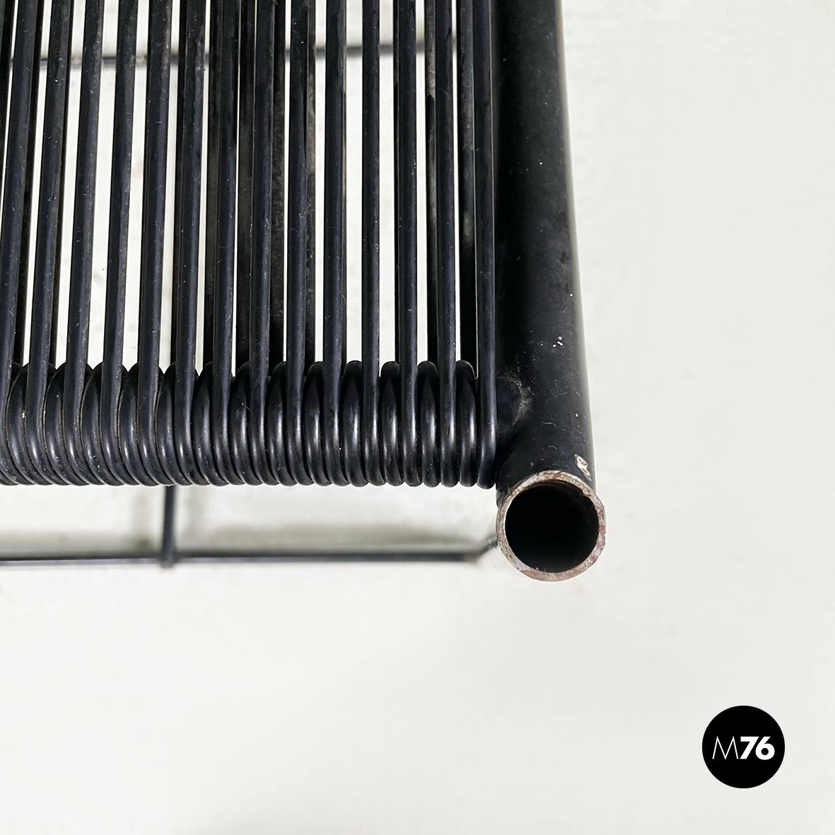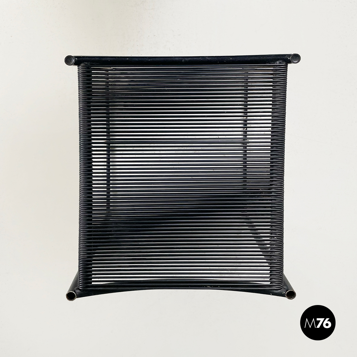Sgabello modello Spaghetti  con seduta e schienale rettangolari ed elastici realizzati da fili di scooby nero. La struttura è in tondino di metallo verniciato nero con manico curvato dietro lo schienale.
