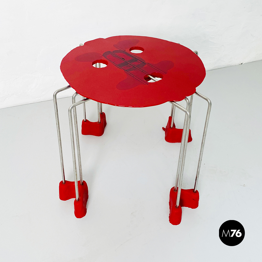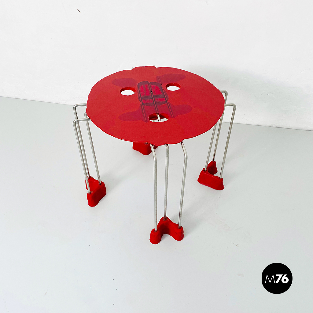 Sgabello modello Triple Play con piano in resina rigida rossa struttura in acciaio inox e piedini flessibili in resina.