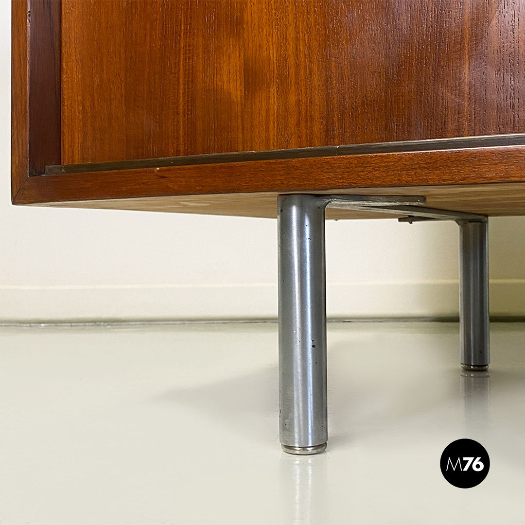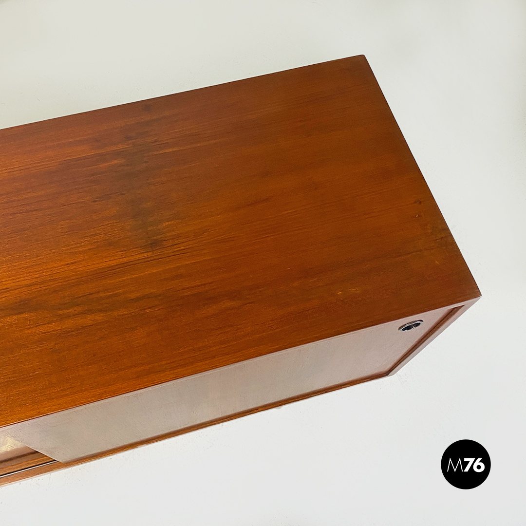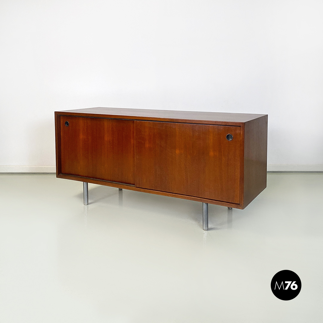 Mobile credenza o sideboard in teak con ante scorrevoli. Maniglie tonde in metallo e zampe in tubolare d’acciaio a sezione tonda.