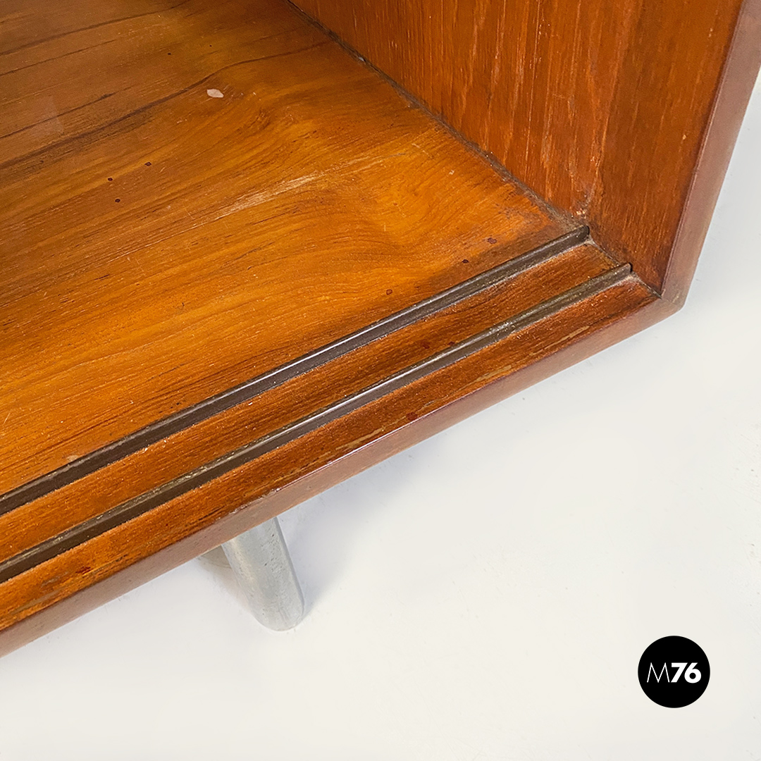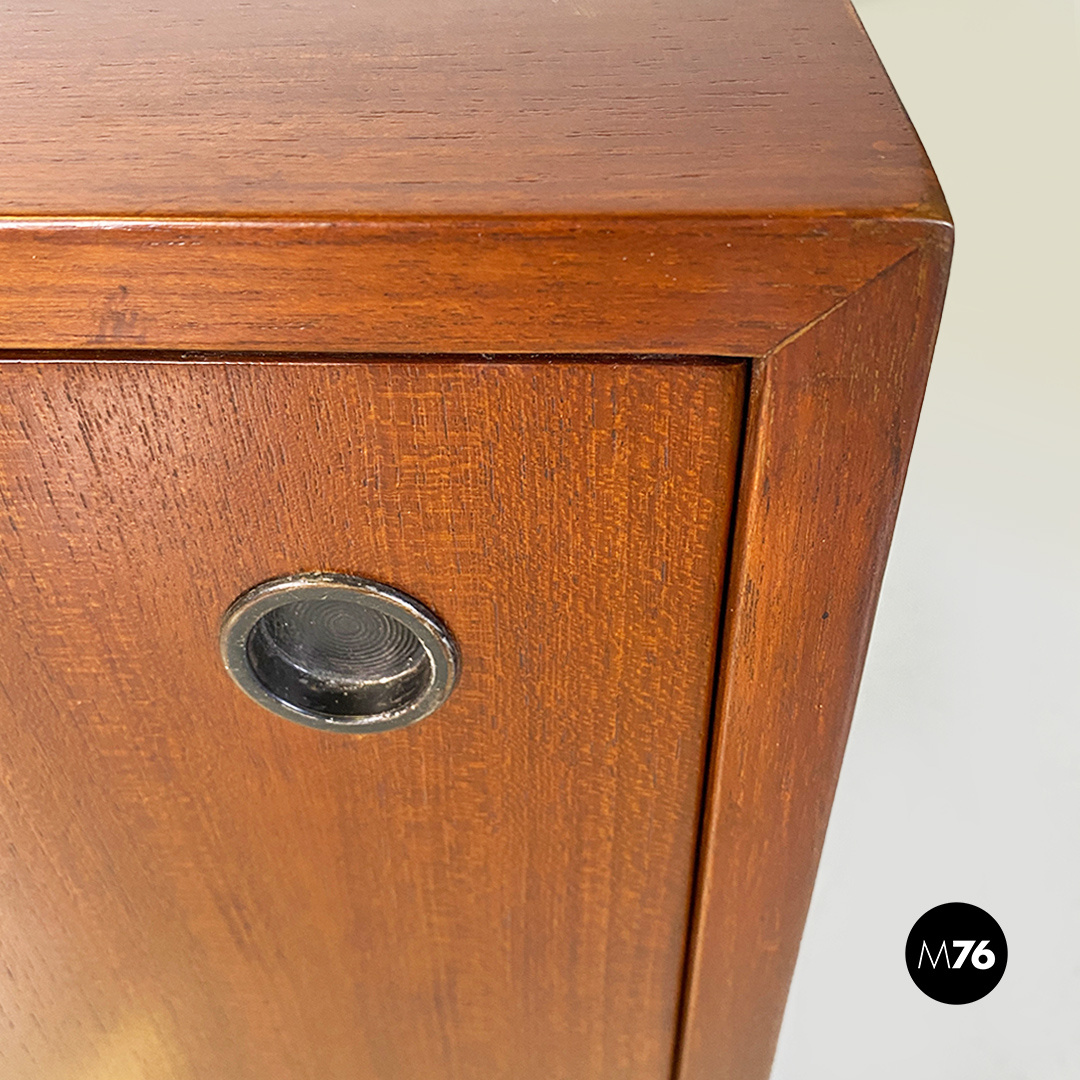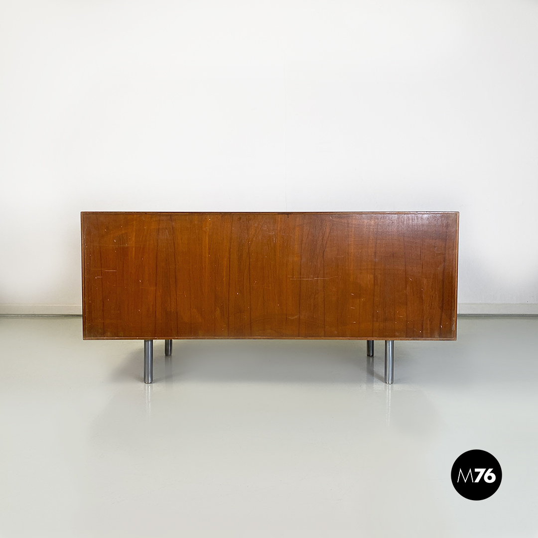Mobile credenza o sideboard in teak con ante scorrevoli. Maniglie tonde in metallo e zampe in tubolare d’acciaio a sezione tonda.