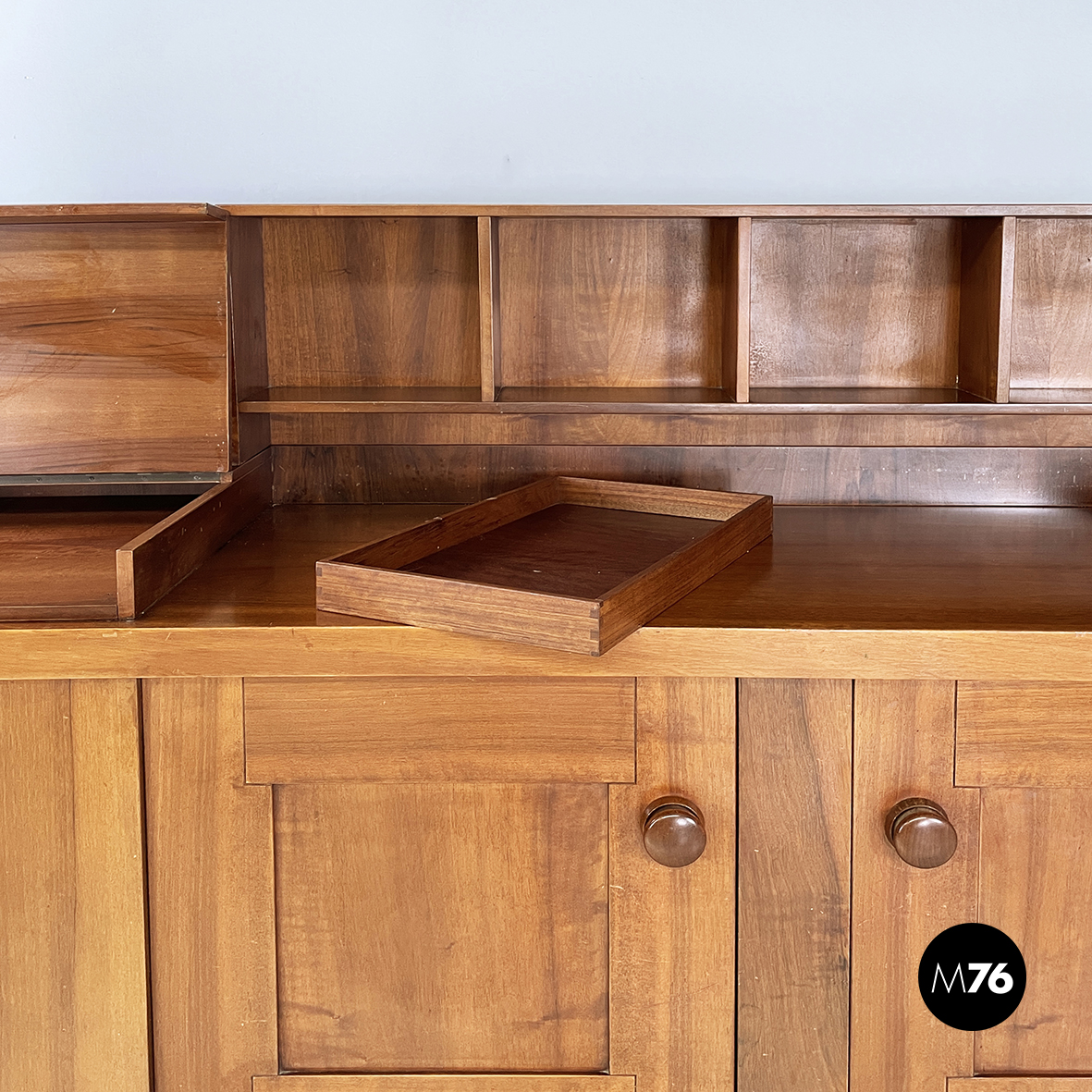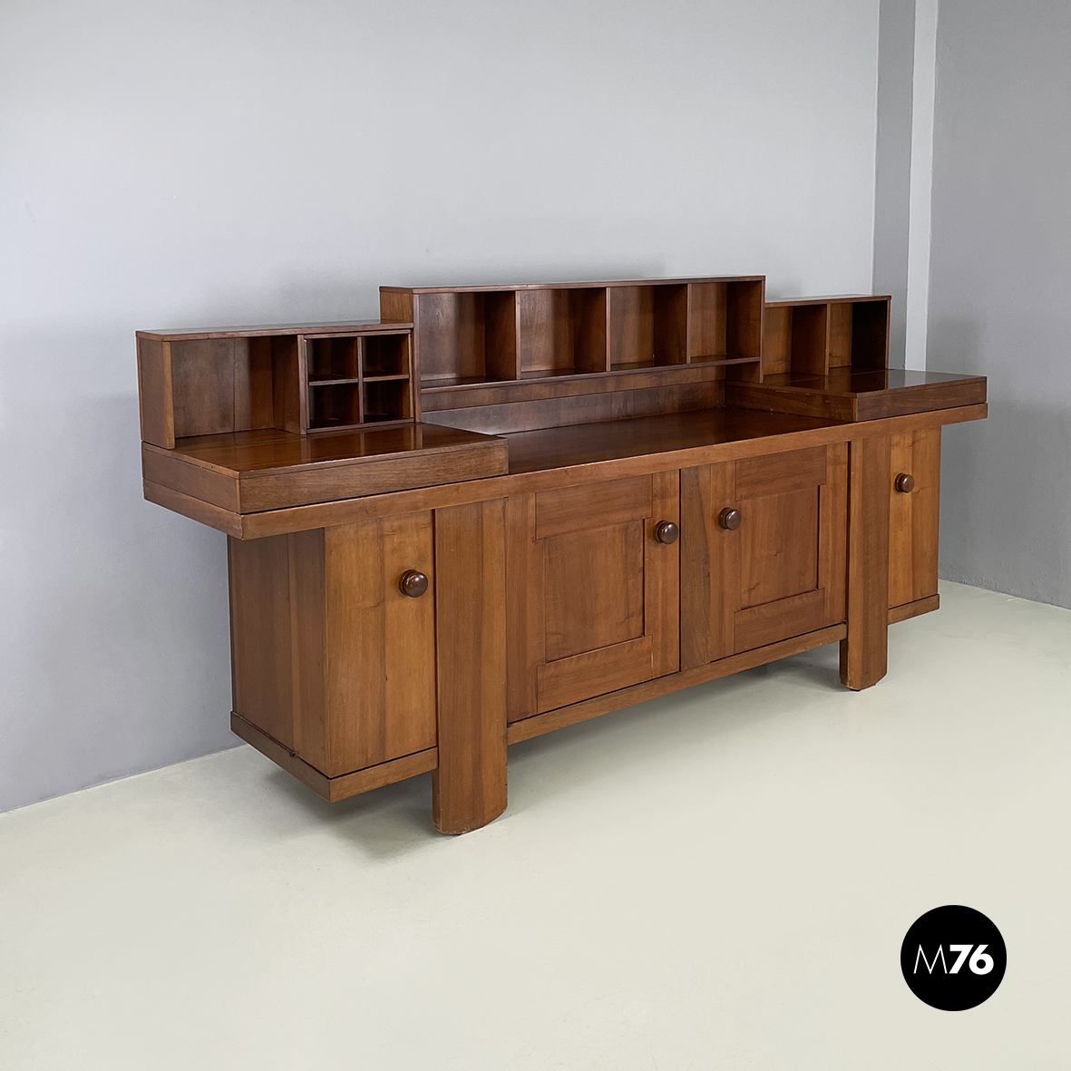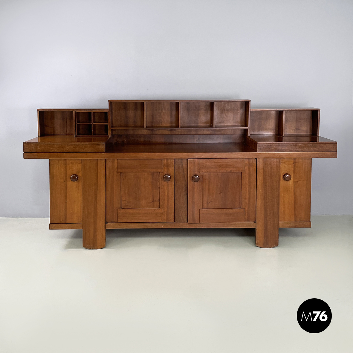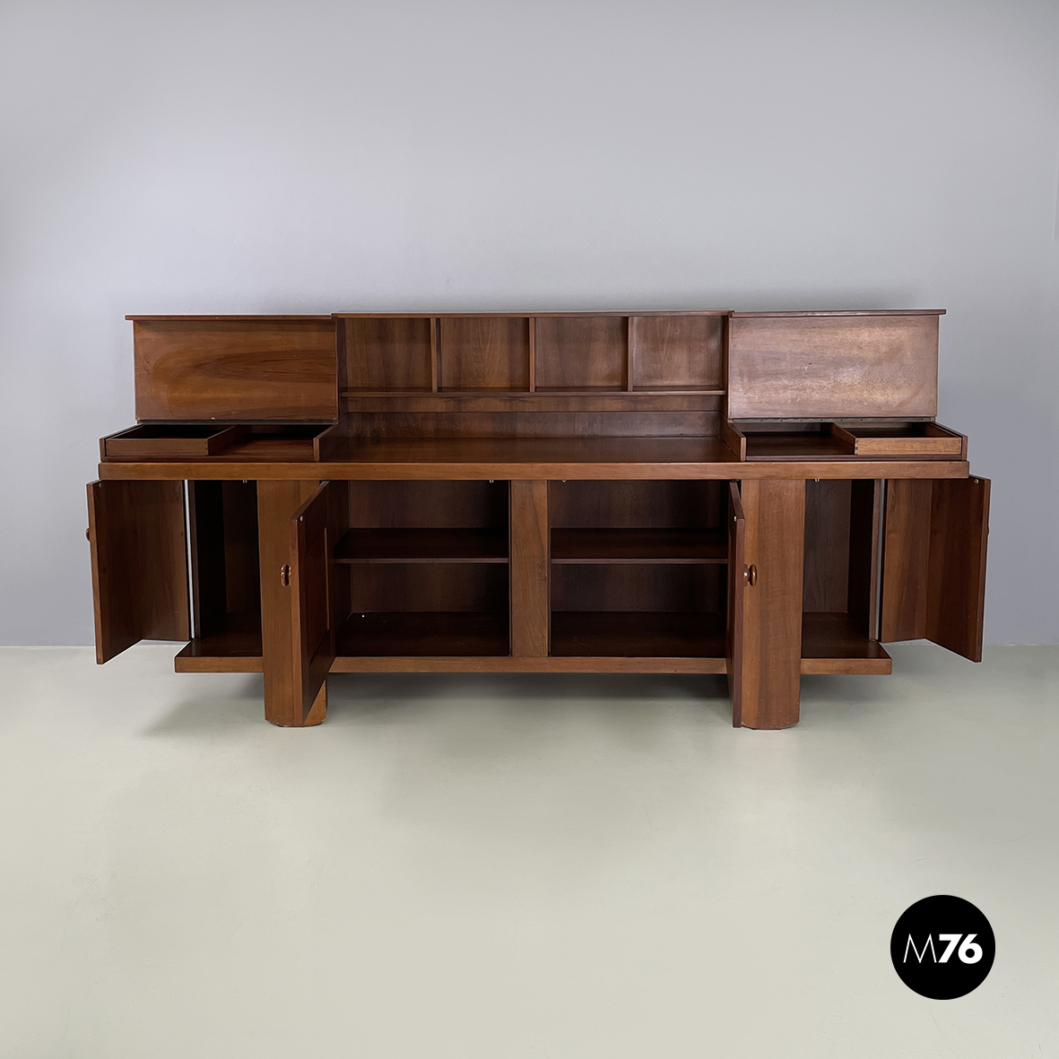 Sideboard a base rettangolare interamente in legno. Nella parte superiore presenta 8 vani quadrati ed aperti e due scompartimenti a ribalta. Un vano presenta un divisorio il quale può essere posizionato a piacere. All’interno dei due scompartimenti è presente un vassoio estraibile. Nella parte inferiore ai lati sono presenti due vani angolari con anta a battente e con mensola interna. Al centro il mobile presenta un doppio vano con apertura a battente e mensola interna. Maniglie tonde. Le zampe della credenza presentano una forma arrotondata.