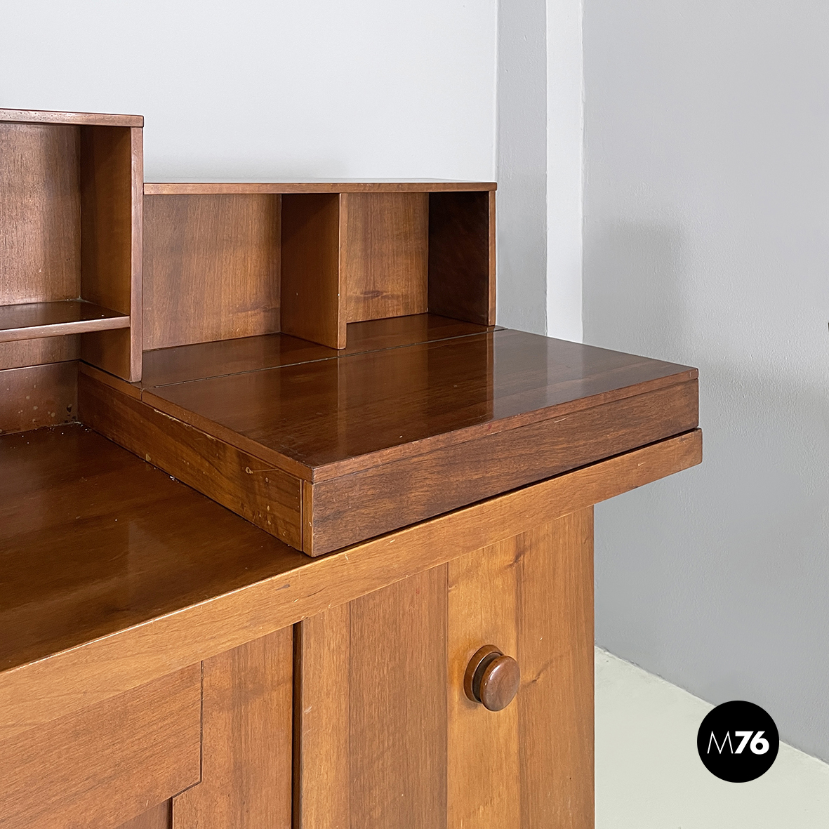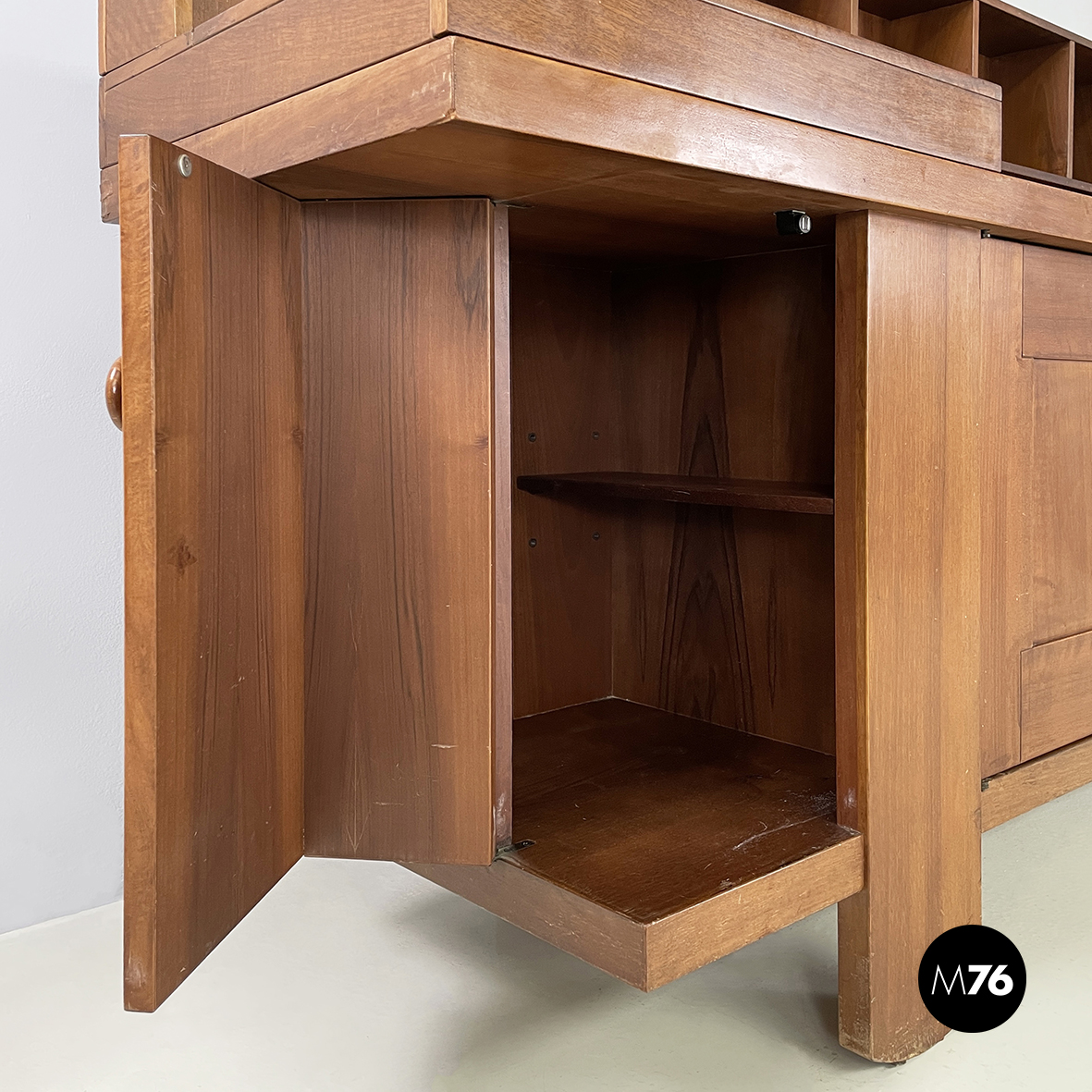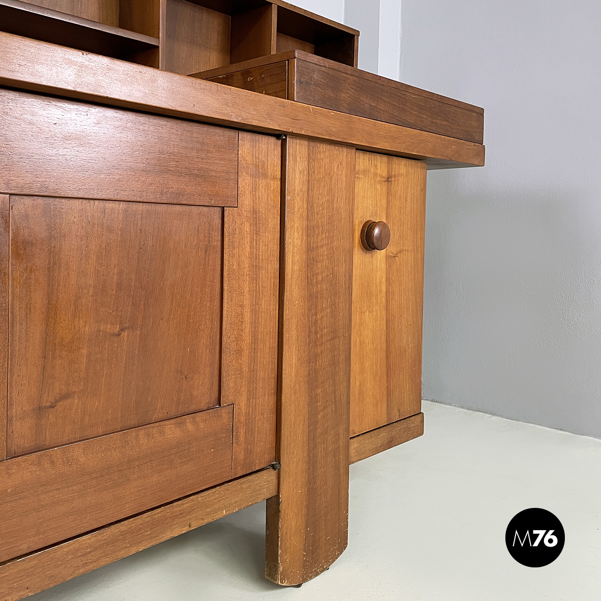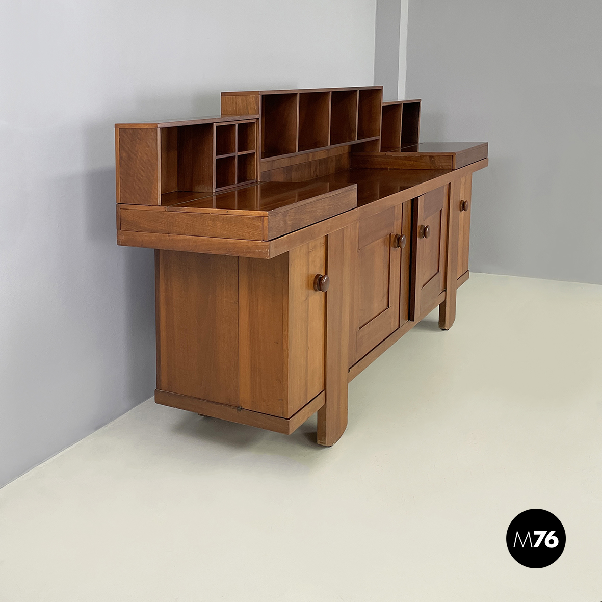 Sideboard a base rettangolare interamente in legno. Nella parte superiore presenta 8 vani quadrati ed aperti e due scompartimenti a ribalta. Un vano presenta un divisorio il quale può essere posizionato a piacere. All’interno dei due scompartimenti è presente un vassoio estraibile. Nella parte inferiore ai lati sono presenti due vani angolari con anta a battente e con mensola interna. Al centro il mobile presenta un doppio vano con apertura a battente e mensola interna. Maniglie tonde. Le zampe della credenza presentano una forma arrotondata.