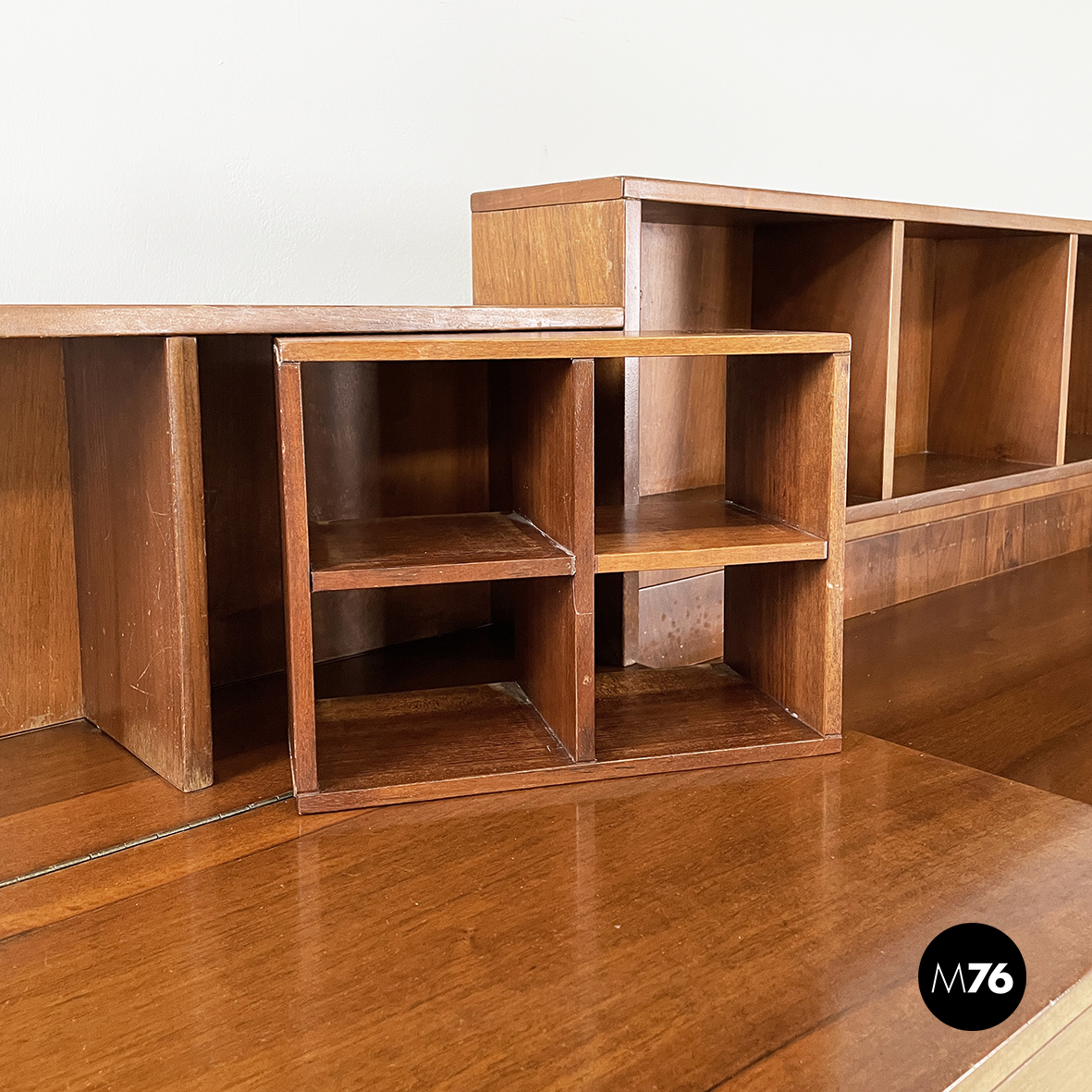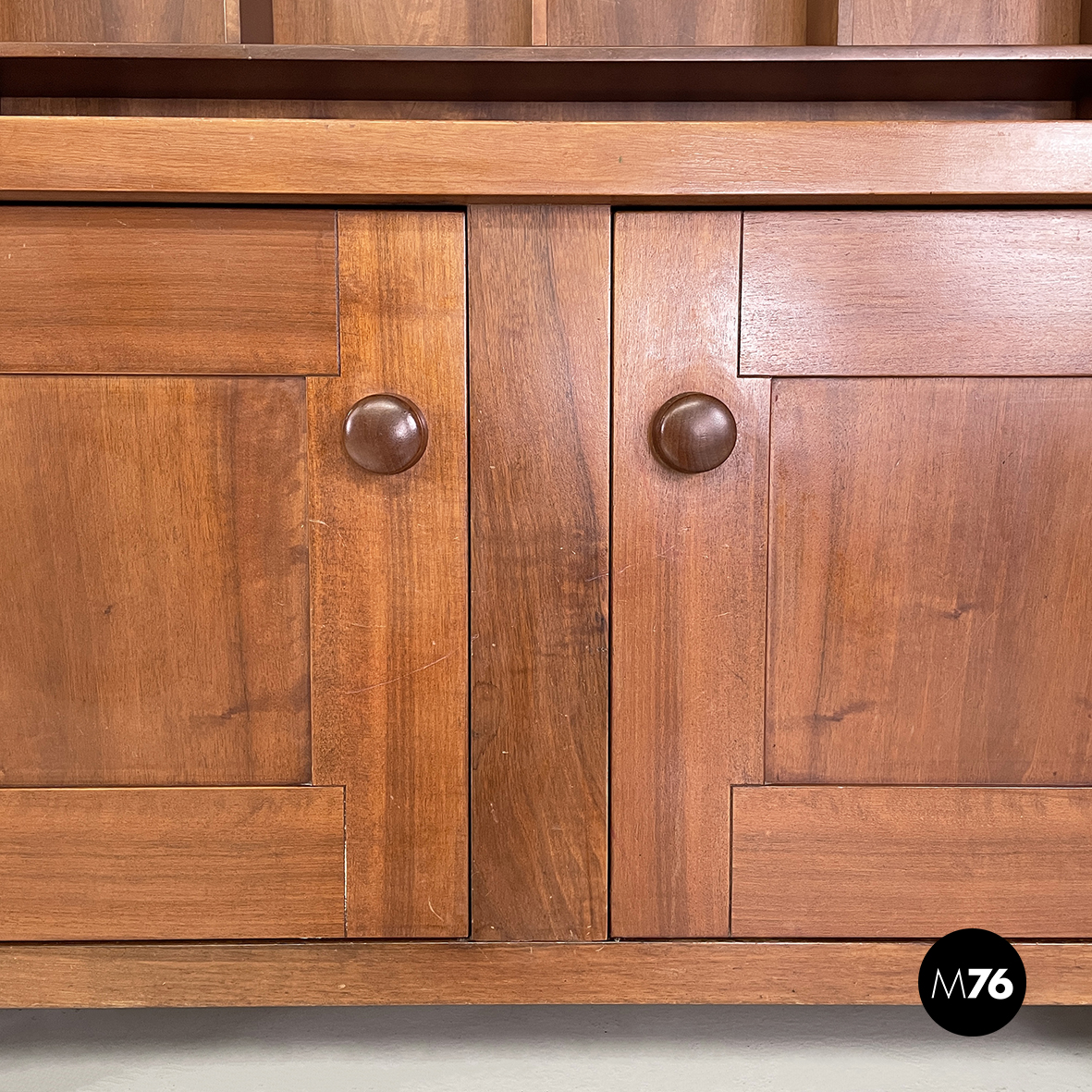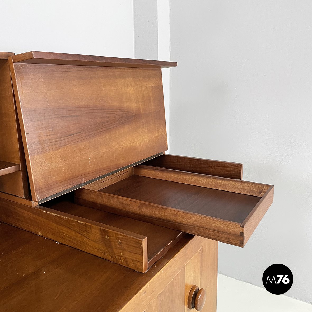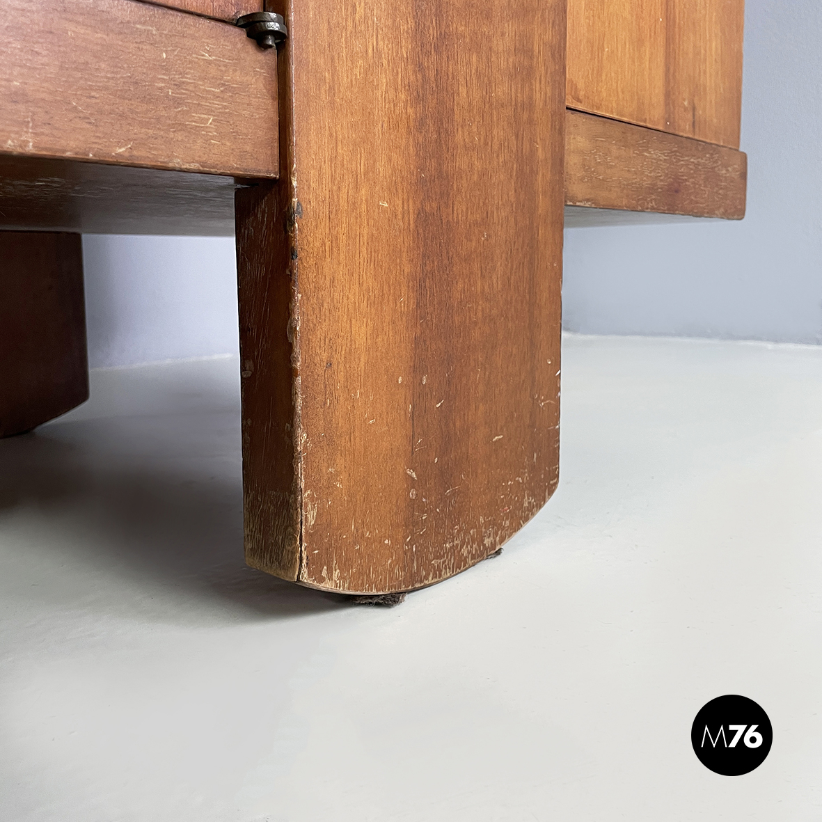 Sideboard a base rettangolare interamente in legno. Nella parte superiore presenta 8 vani quadrati ed aperti e due scompartimenti a ribalta. Un vano presenta un divisorio il quale può essere posizionato a piacere. All’interno dei due scompartimenti è presente un vassoio estraibile. Nella parte inferiore ai lati sono presenti due vani angolari con anta a battente e con mensola interna. Al centro il mobile presenta un doppio vano con apertura a battente e mensola interna. Maniglie tonde. Le zampe della credenza presentano una forma arrotondata.