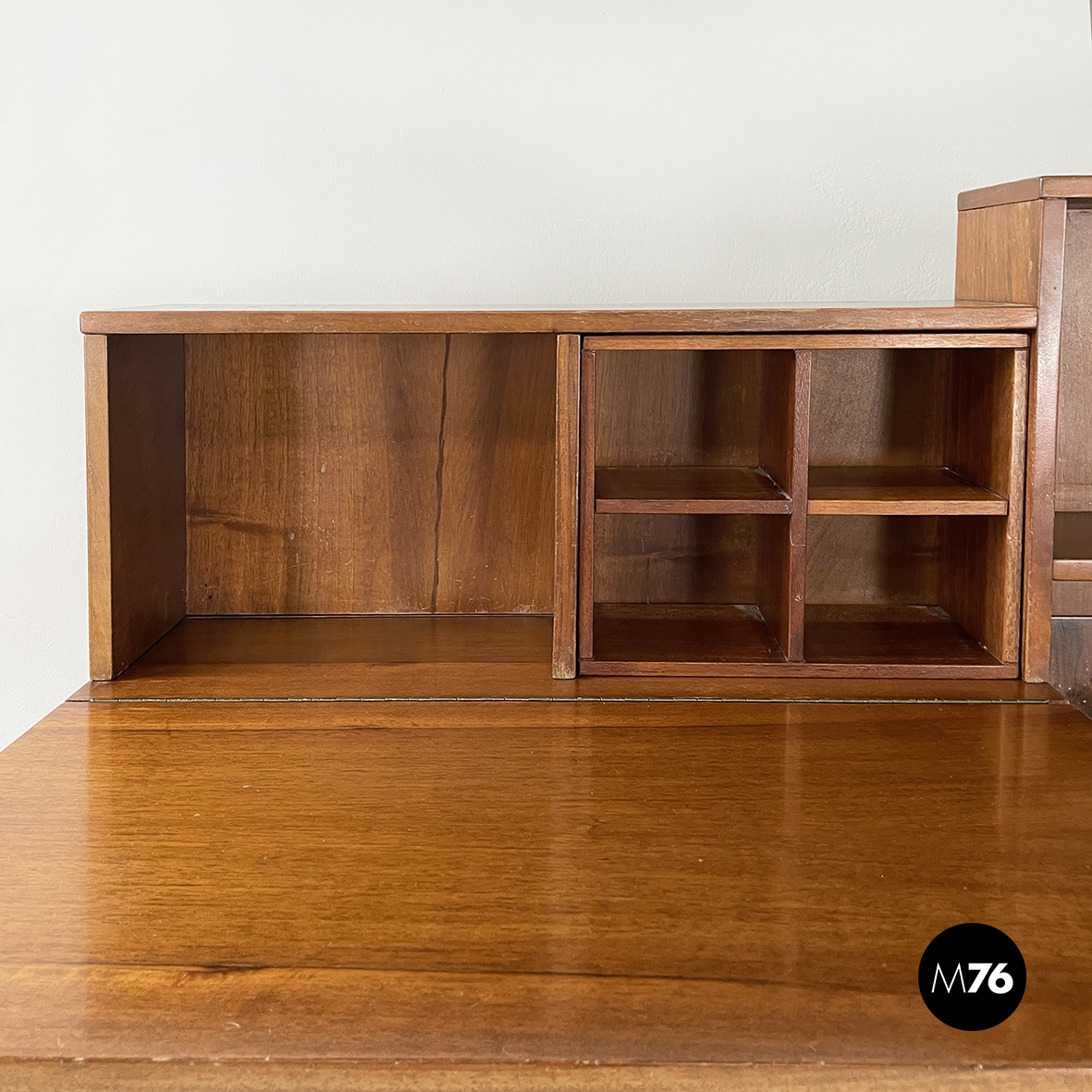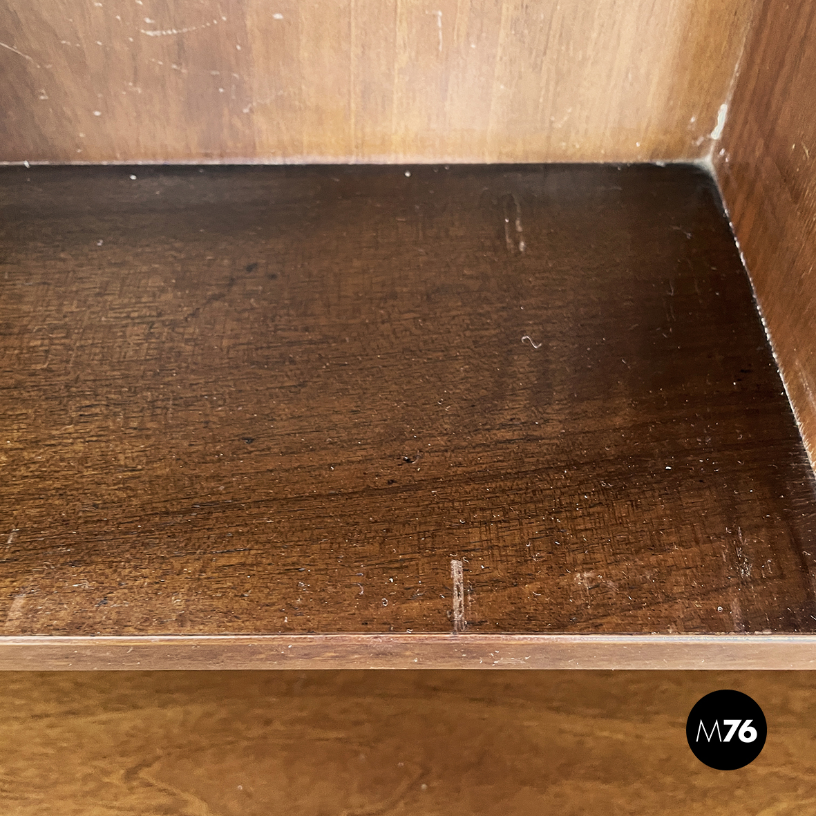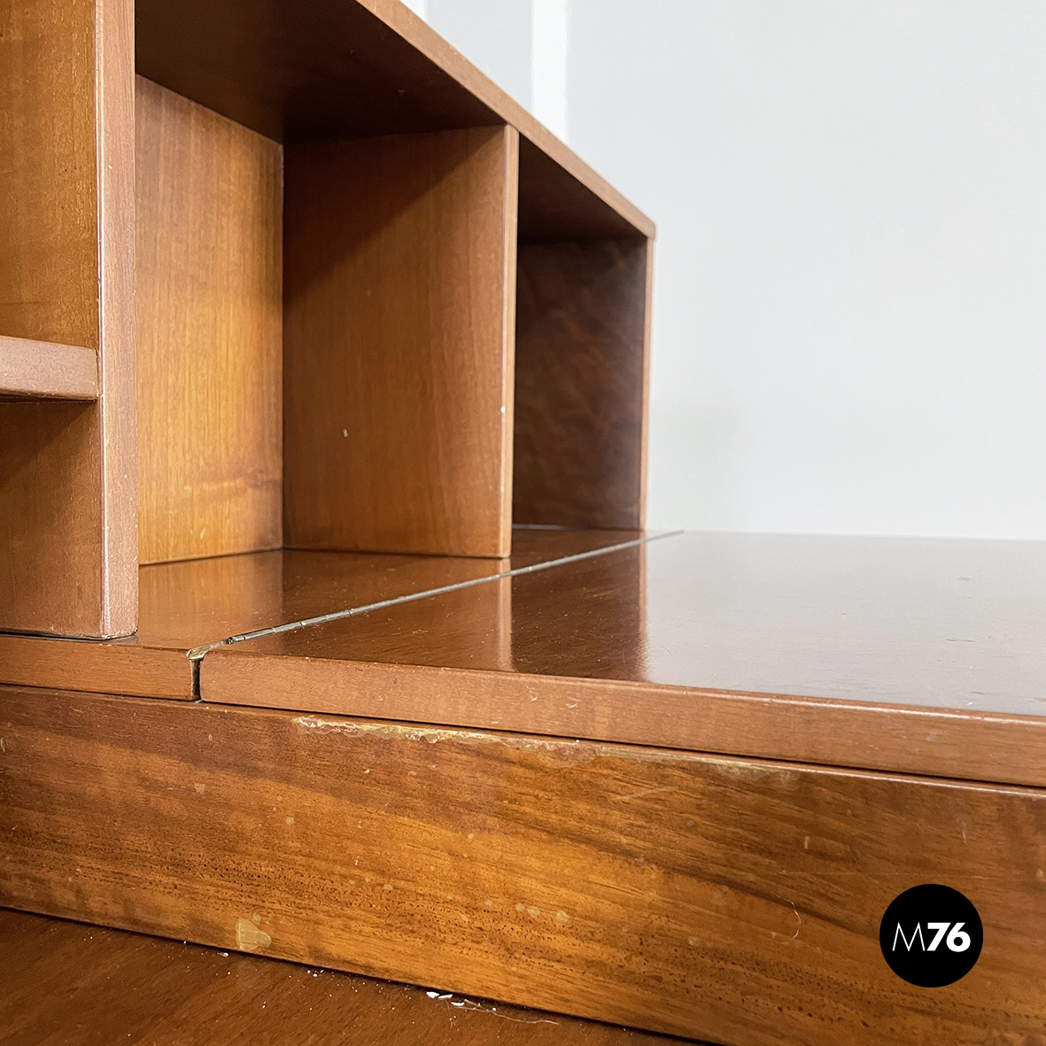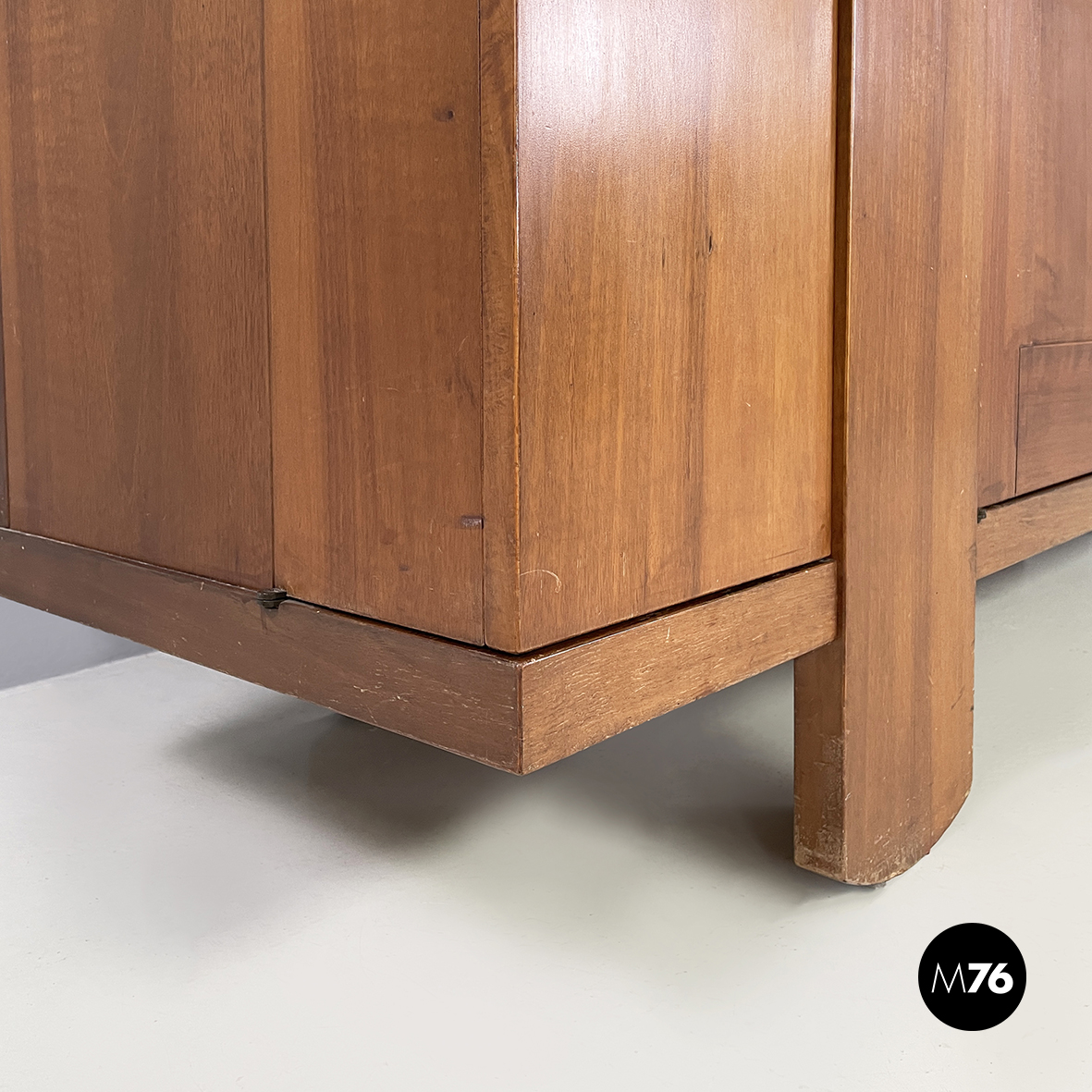 Sideboard a base rettangolare interamente in legno. Nella parte superiore presenta 8 vani quadrati ed aperti e due scompartimenti a ribalta. Un vano presenta un divisorio il quale può essere posizionato a piacere. All’interno dei due scompartimenti è presente un vassoio estraibile. Nella parte inferiore ai lati sono presenti due vani angolari con anta a battente e con mensola interna. Al centro il mobile presenta un doppio vano con apertura a battente e mensola interna. Maniglie tonde. Le zampe della credenza presentano una forma arrotondata.