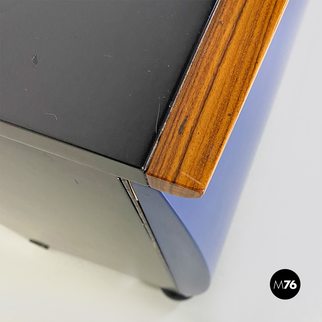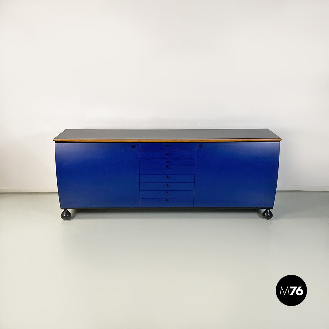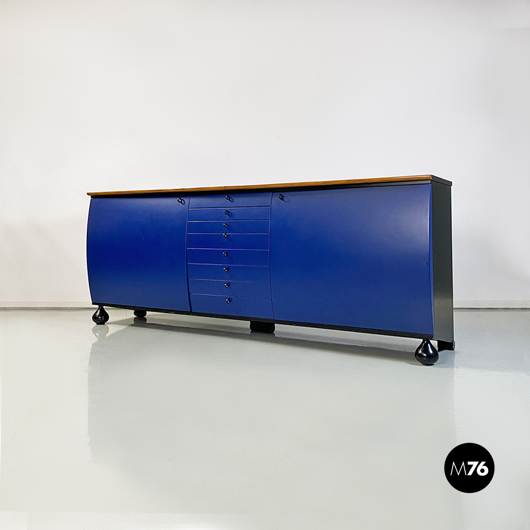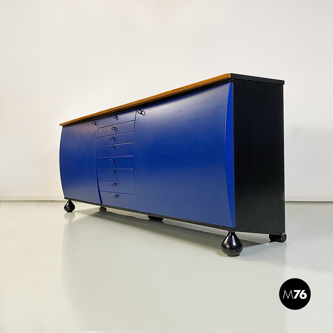 Sideboard o credenza in legno massello con profilo curvo composta da una fila di cassetti centrali di diverse altezze ante a battente laterali speculari e mensole d’appoggio interne. Il piano e i fianchi del contenitore hanno una finitura nera mentre il profilo frontale è color legno naturale e tutto il fronte del mobile è blu opaco.