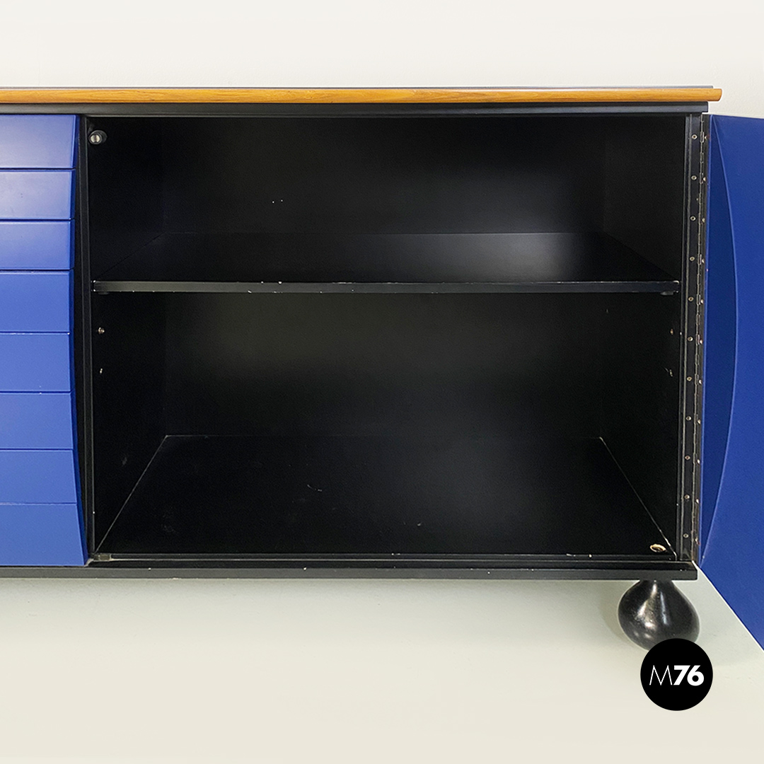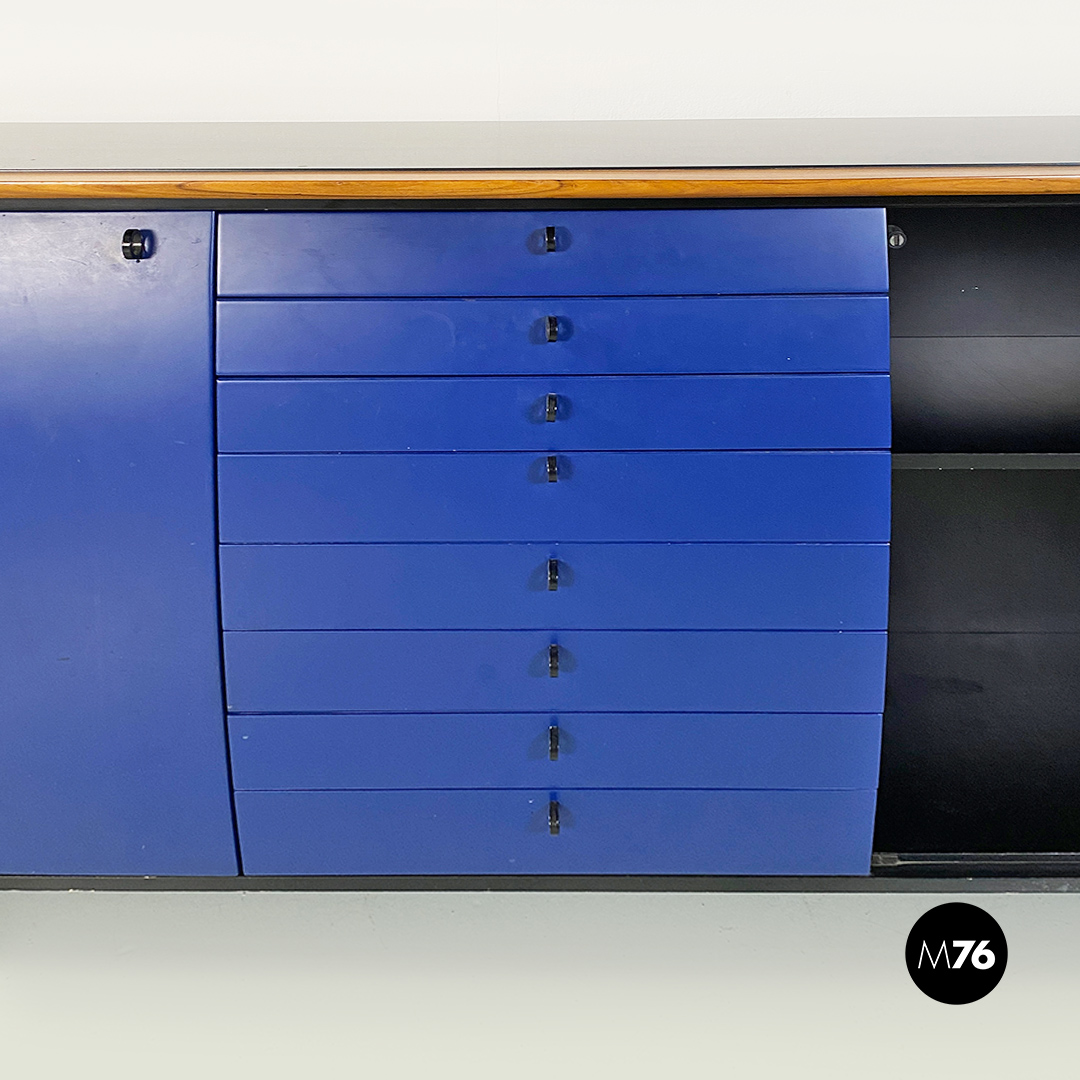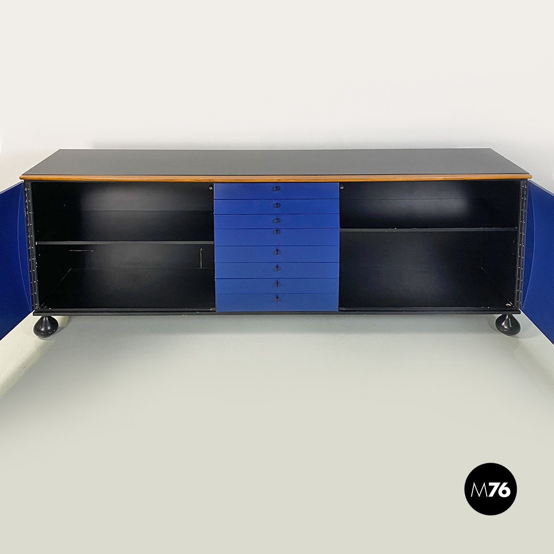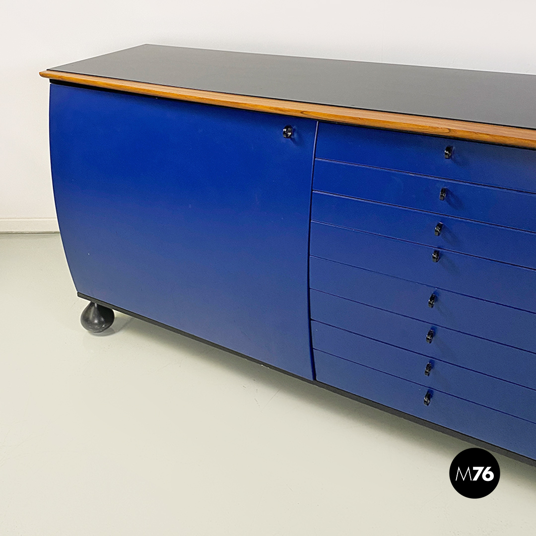 Sideboard o credenza in legno massello con profilo curvo composta da una fila di cassetti centrali di diverse altezze ante a battente laterali speculari e mensole d’appoggio interne. Il piano e i fianchi del contenitore hanno una finitura nera mentre il profilo frontale è color legno naturale e tutto il fronte del mobile è blu opaco.