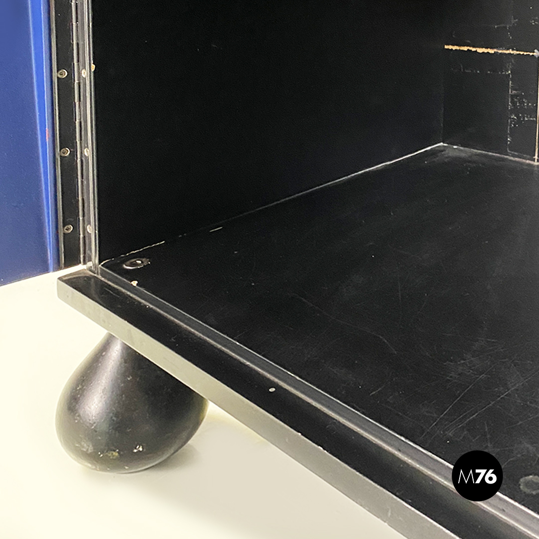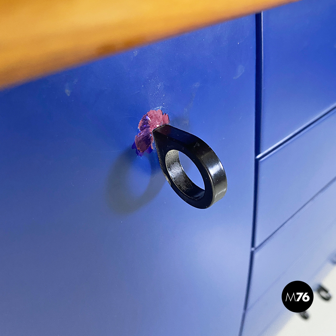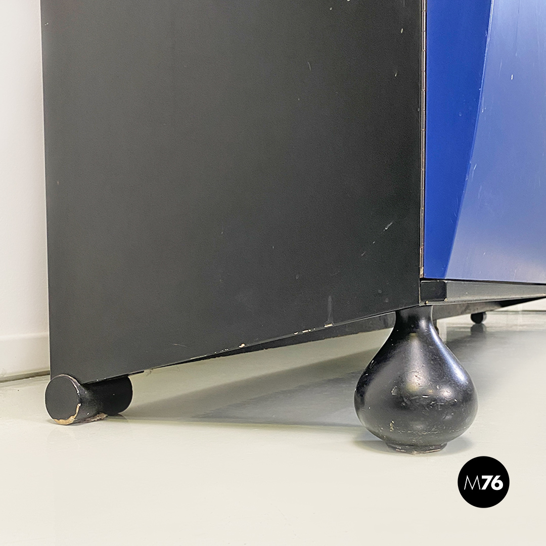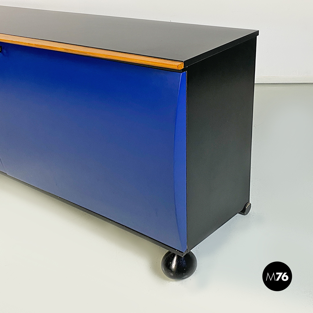 Sideboard o credenza in legno massello con profilo curvo composta da una fila di cassetti centrali di diverse altezze ante a battente laterali speculari e mensole d’appoggio interne. Il piano e i fianchi del contenitore hanno una finitura nera mentre il profilo frontale è color legno naturale e tutto il fronte del mobile è blu opaco.