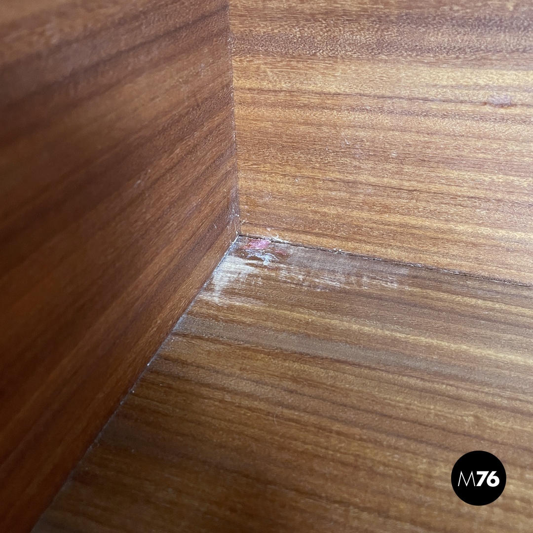 Sideboard a base rettangolare in legno. Presenta due ante a scorrimento con maniglie tonde in ottone all’interno si trovano quattro vani divisi con una mensola orizzontale e una parete verticale centrale. Con quattro piedini a sezione circolare.