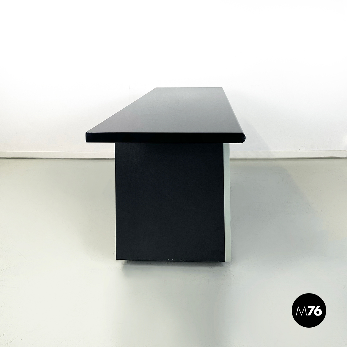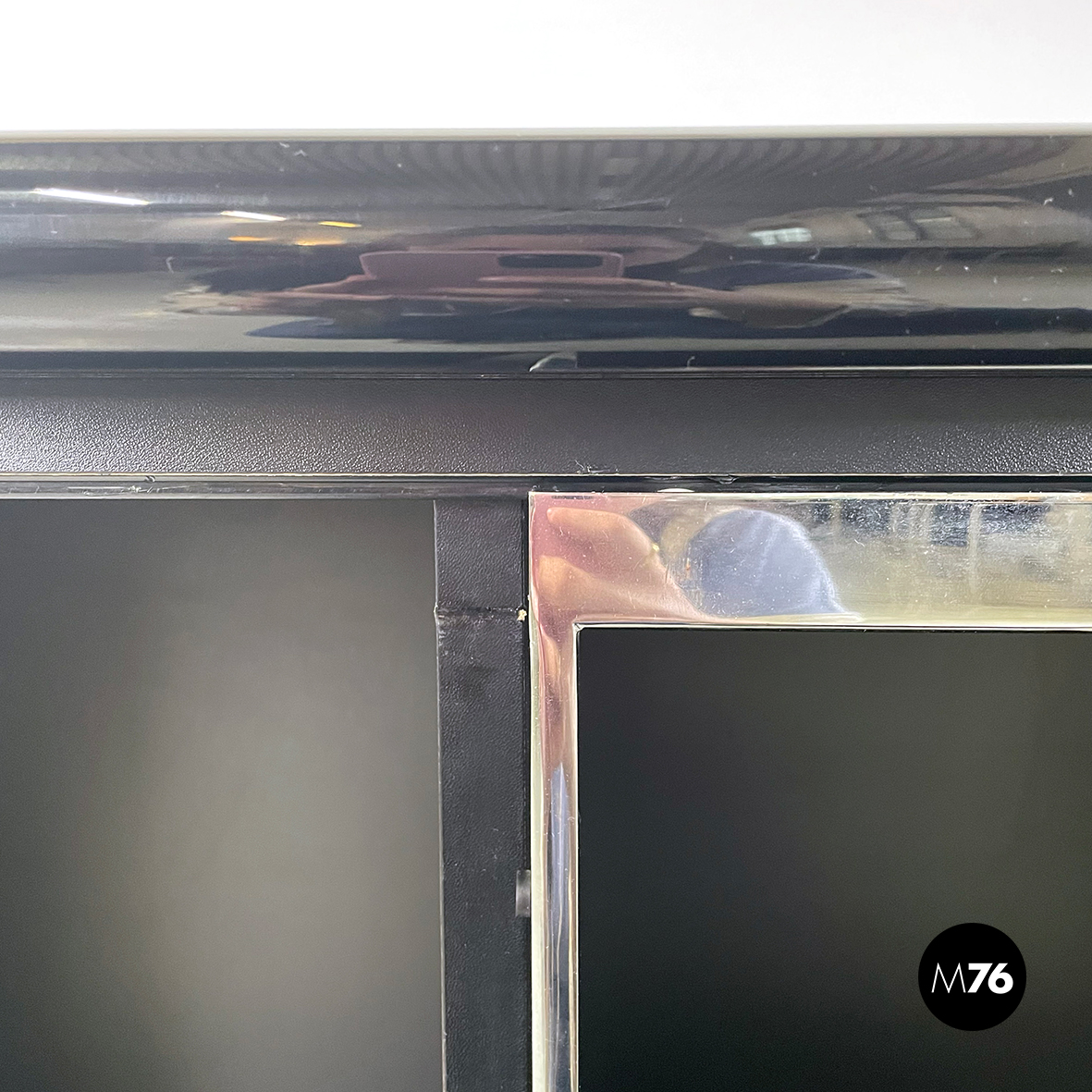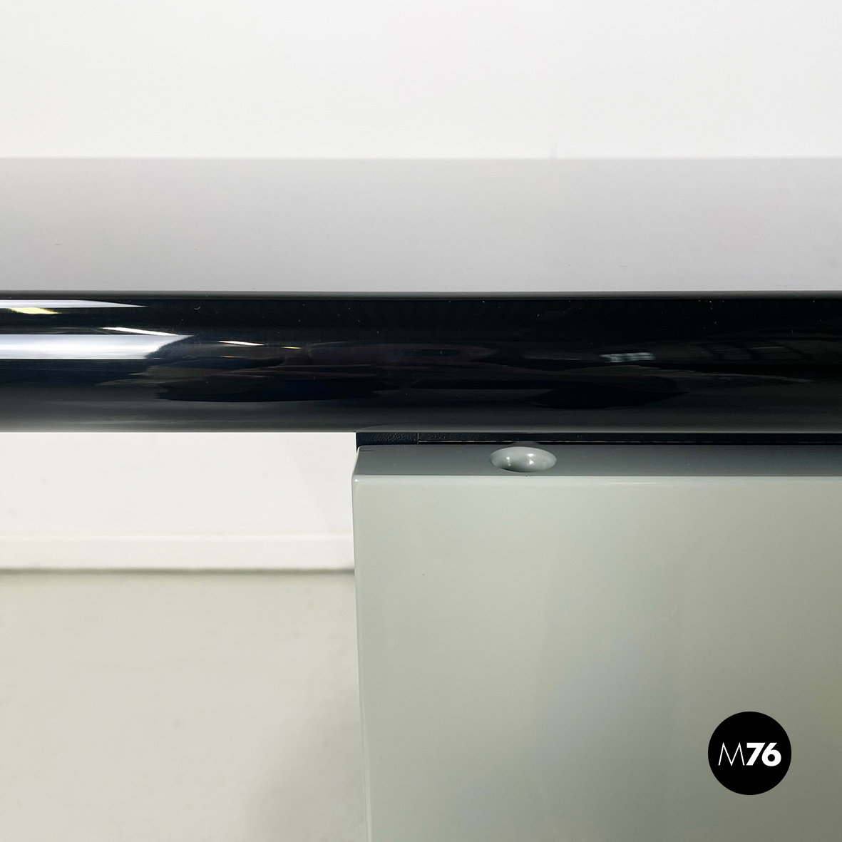 Sideboard modello Sheraton in legno laccato in grigio chiaro e nero. Il piano rettangolare presenta il bordo frontale smussato. Sul fronte presenta 2 vani di cui uno presenta il profilo in metallo cromato. La particolarità del sideboard sta nella sua doppia apertura: combina l’apertura a scorrimento e quella a battente.