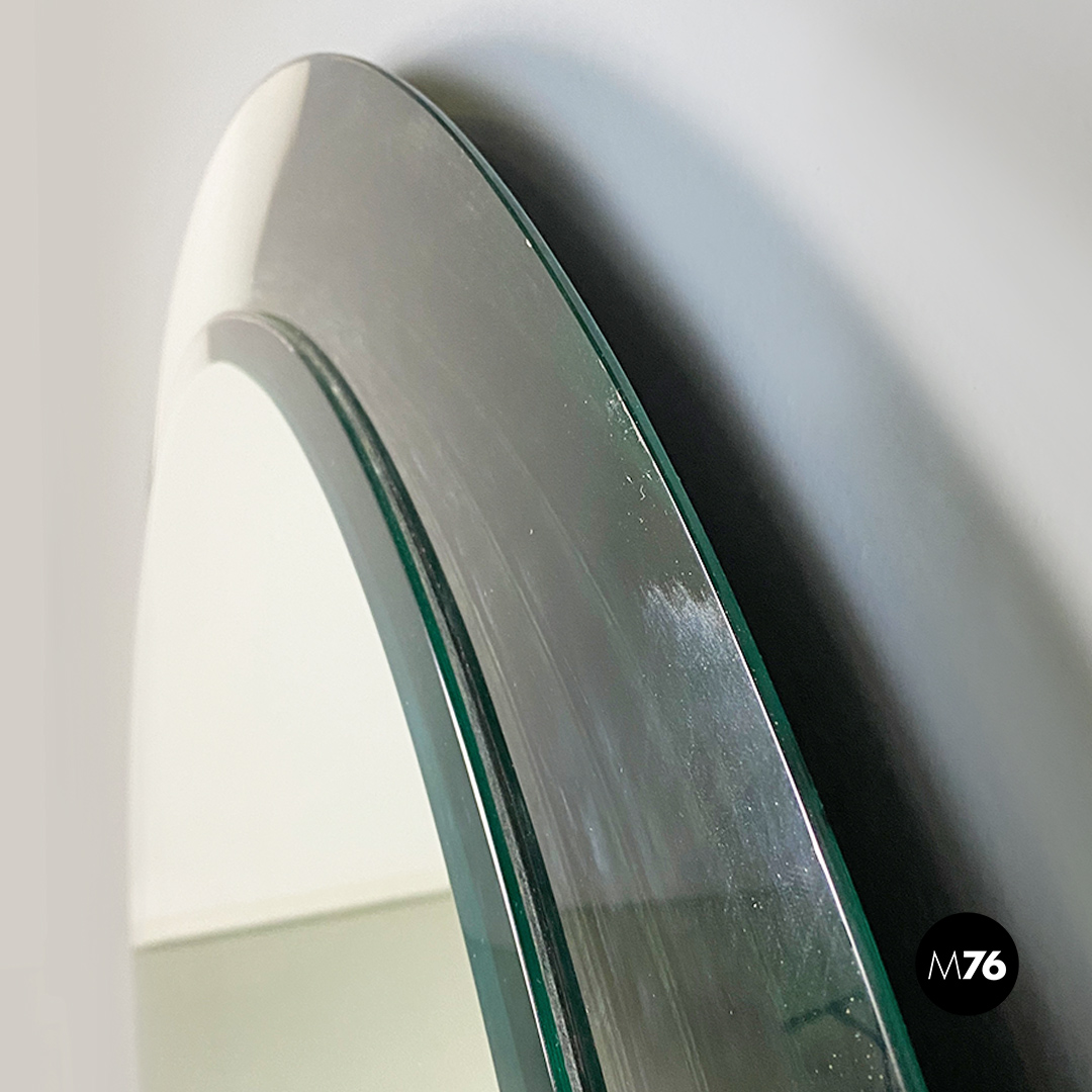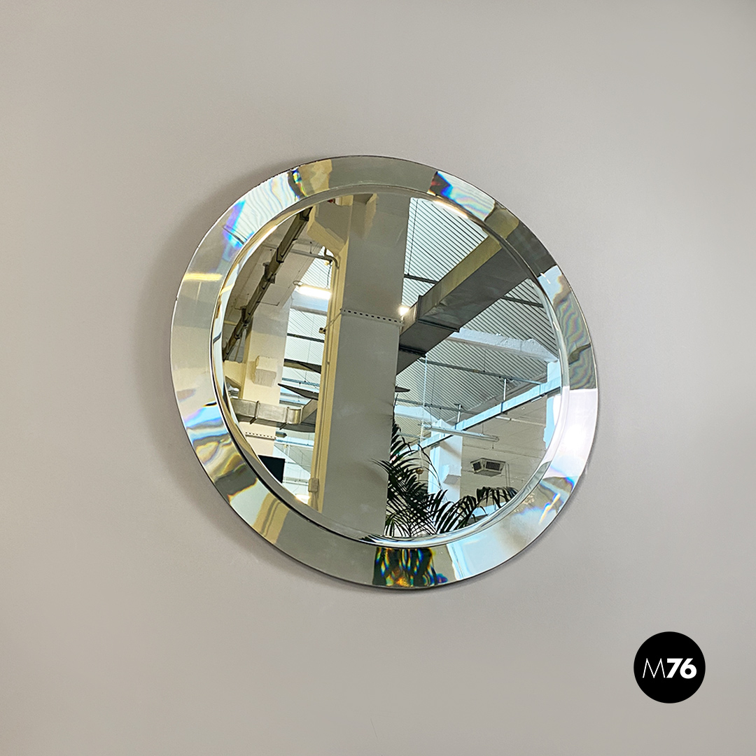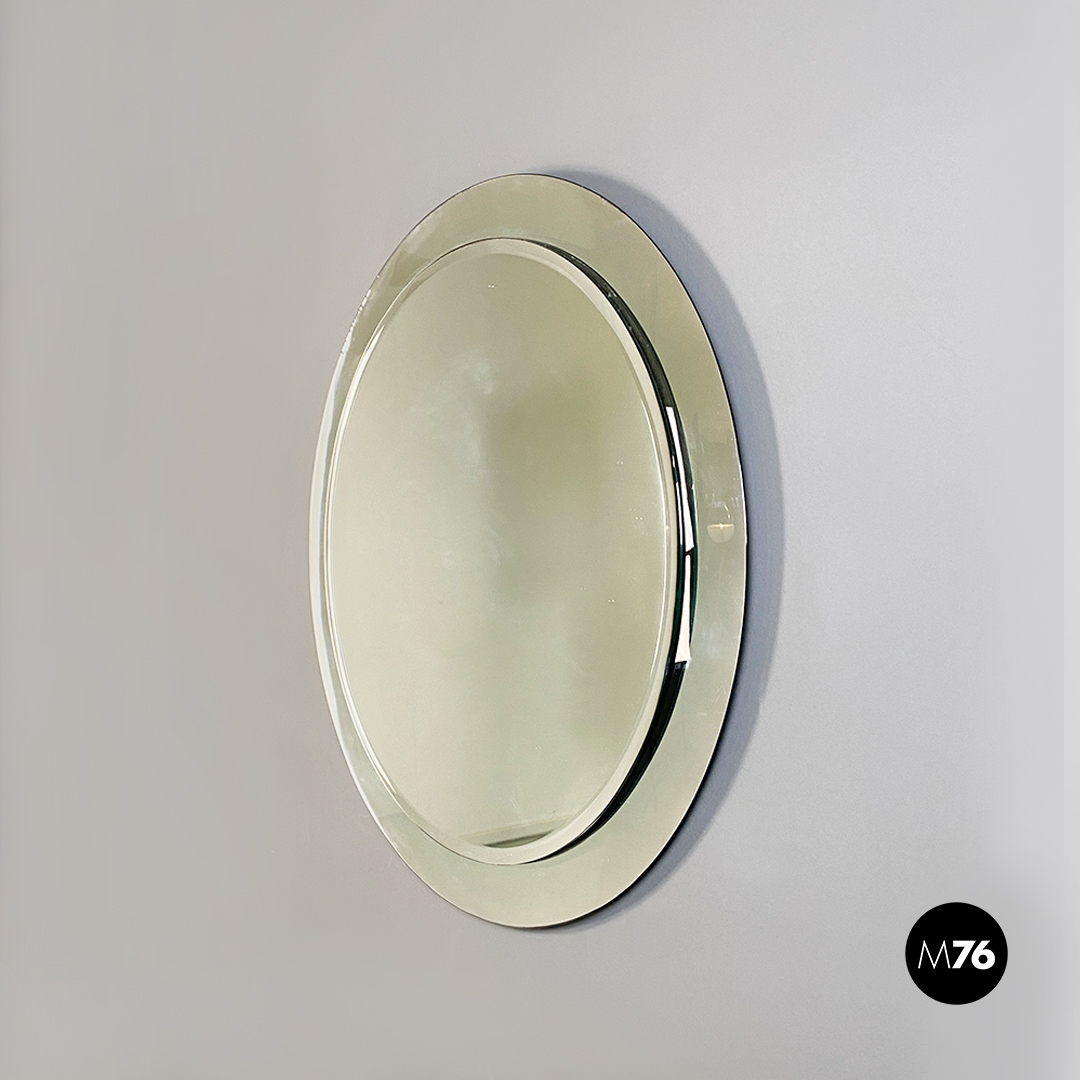Specchio di forma tonda con doppio vetro bisellato di cui uno centrale ed un secondo a cornice. Entrambi ancorati ad un piano tondo in massello posto sul retro.