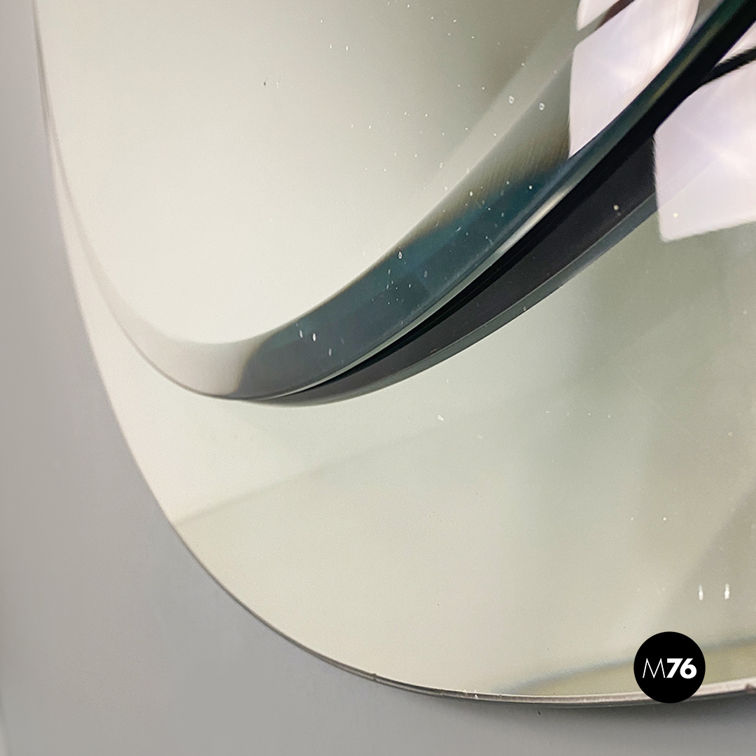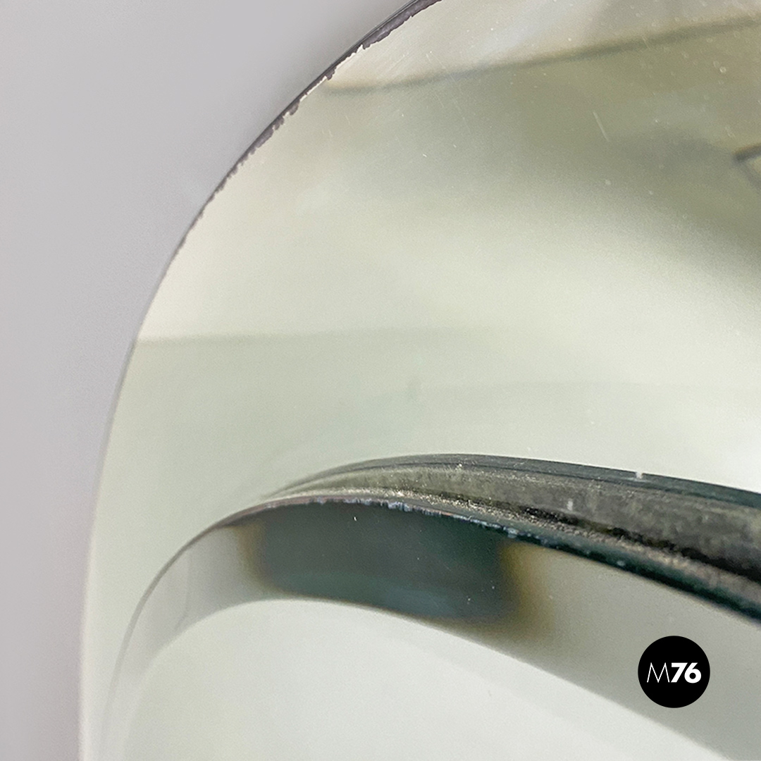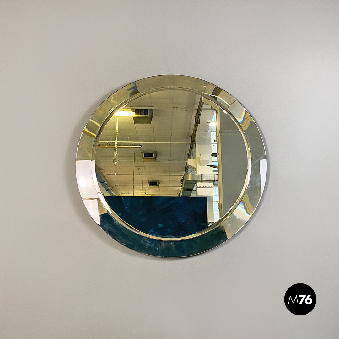 Specchio di forma tonda con doppio vetro bisellato di cui uno centrale ed un secondo a cornice. Entrambi ancorati ad un piano tondo in massello posto sul retro.