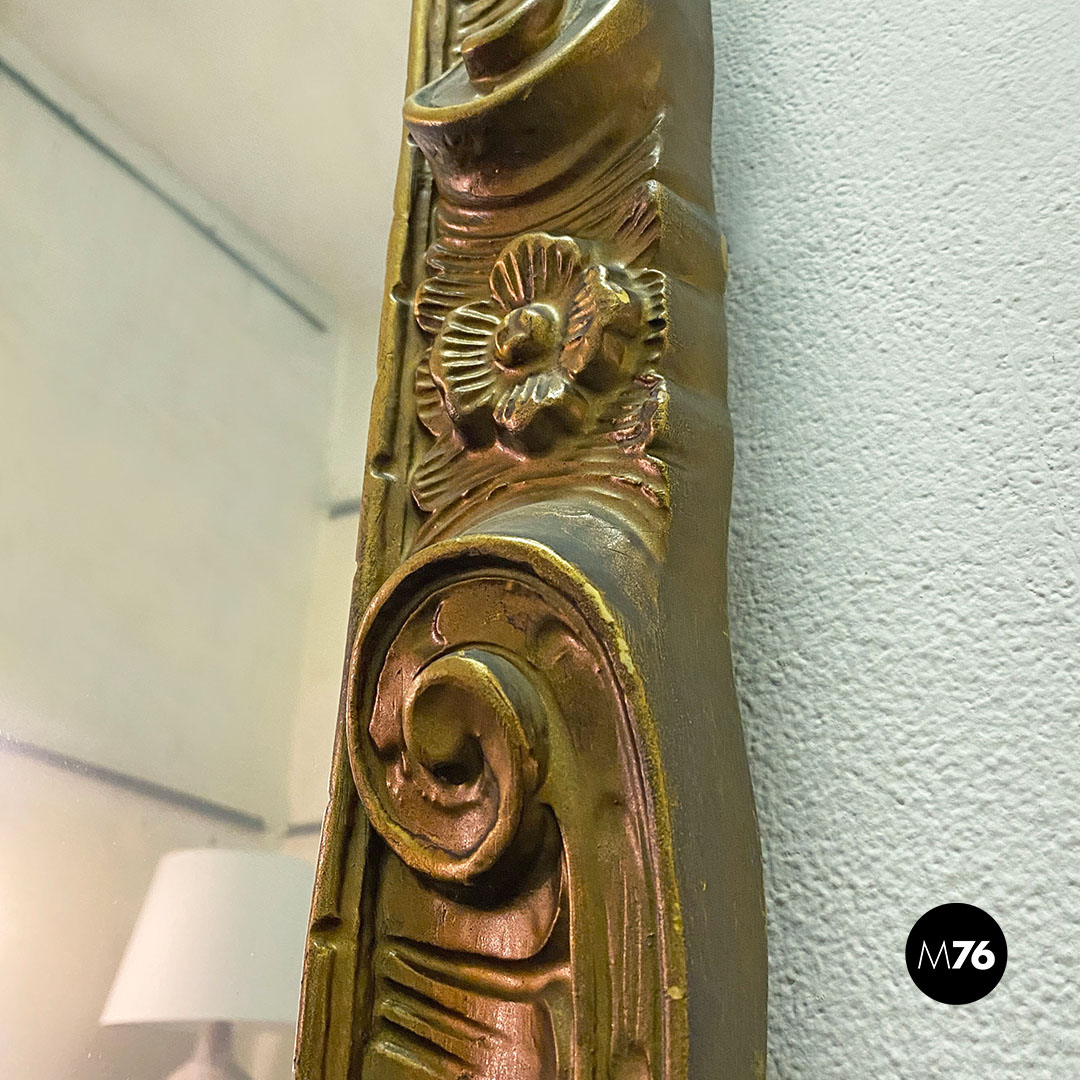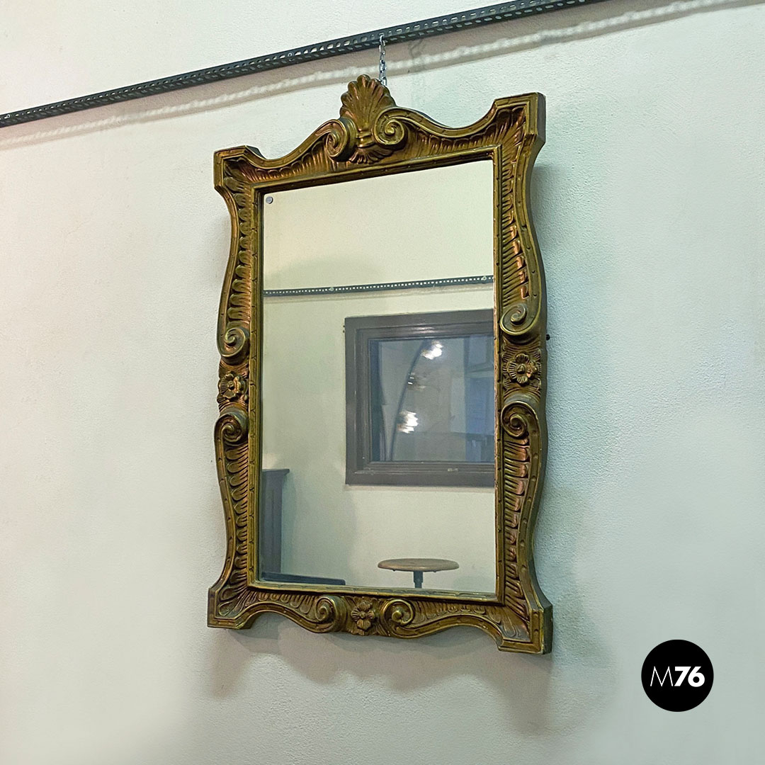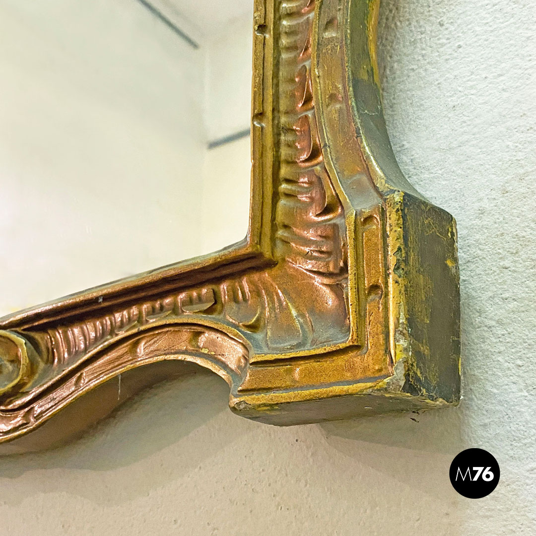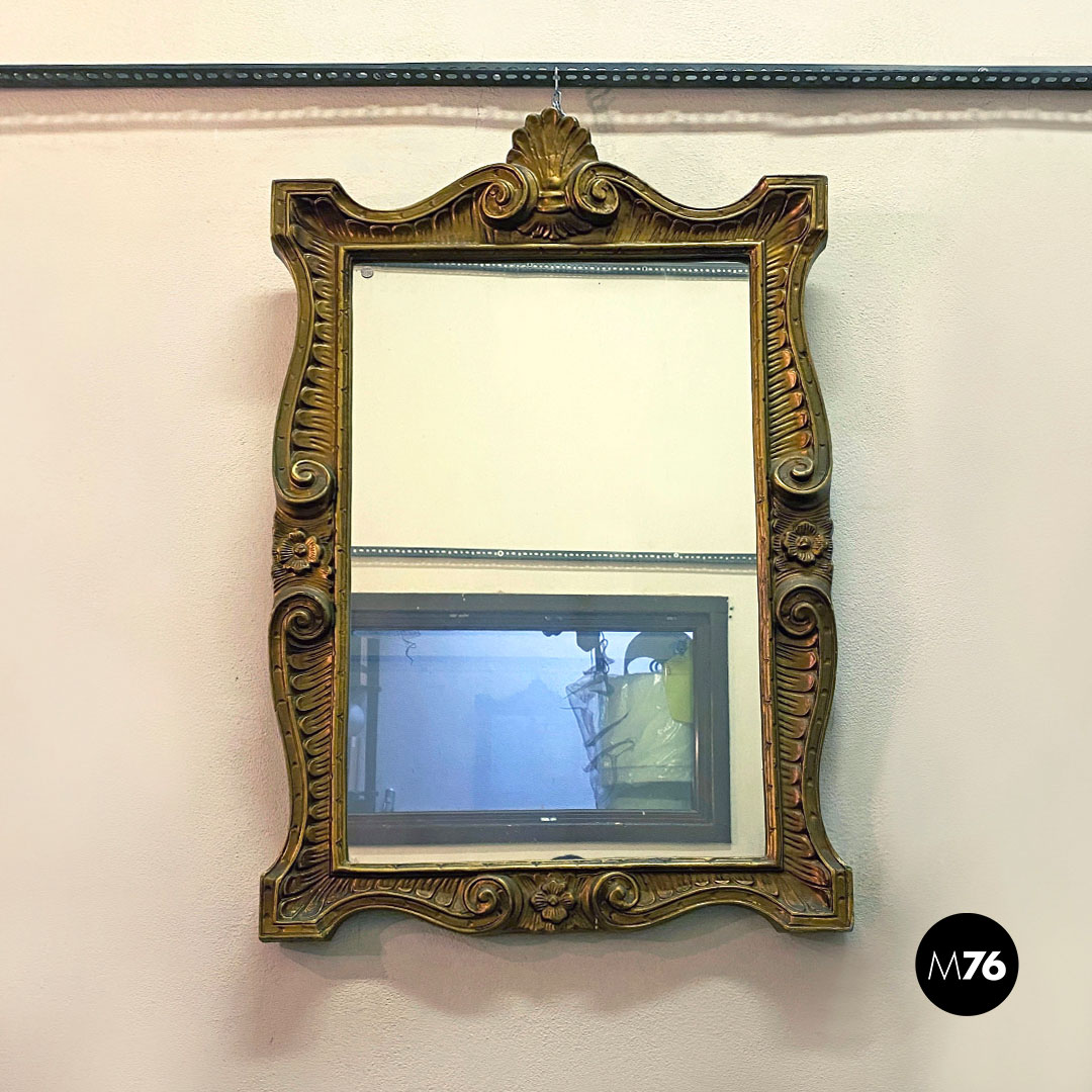 Specchio in stile con cornice dorata dal disegno mosso in legno verniciato oro.