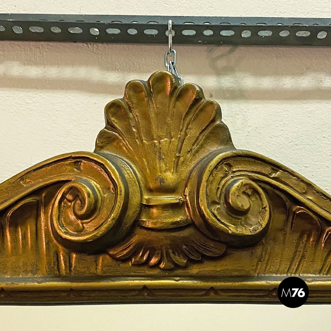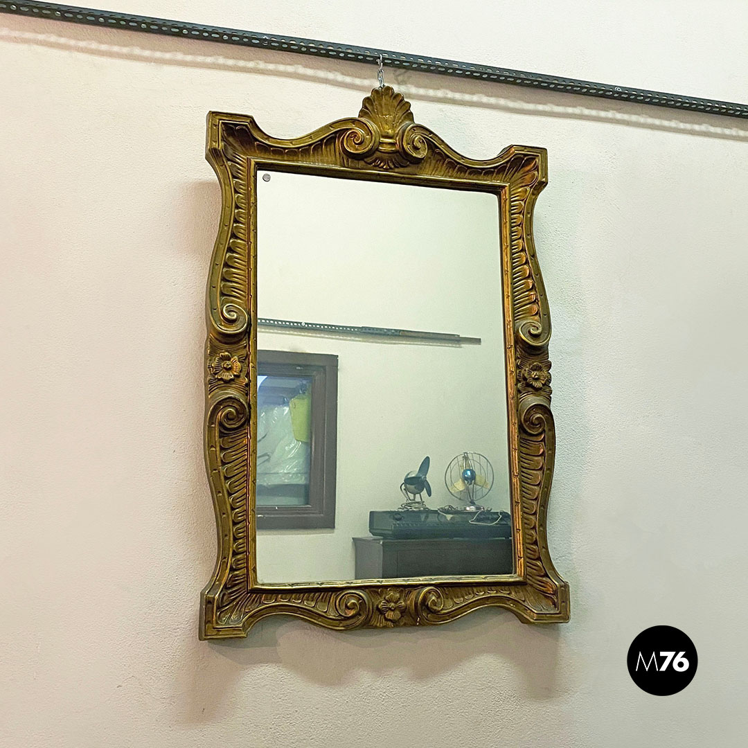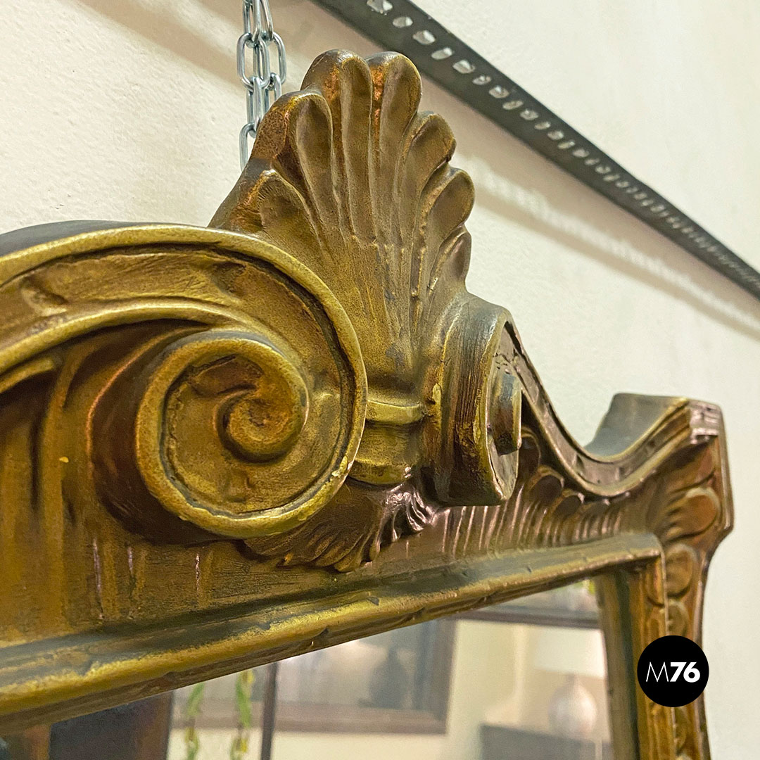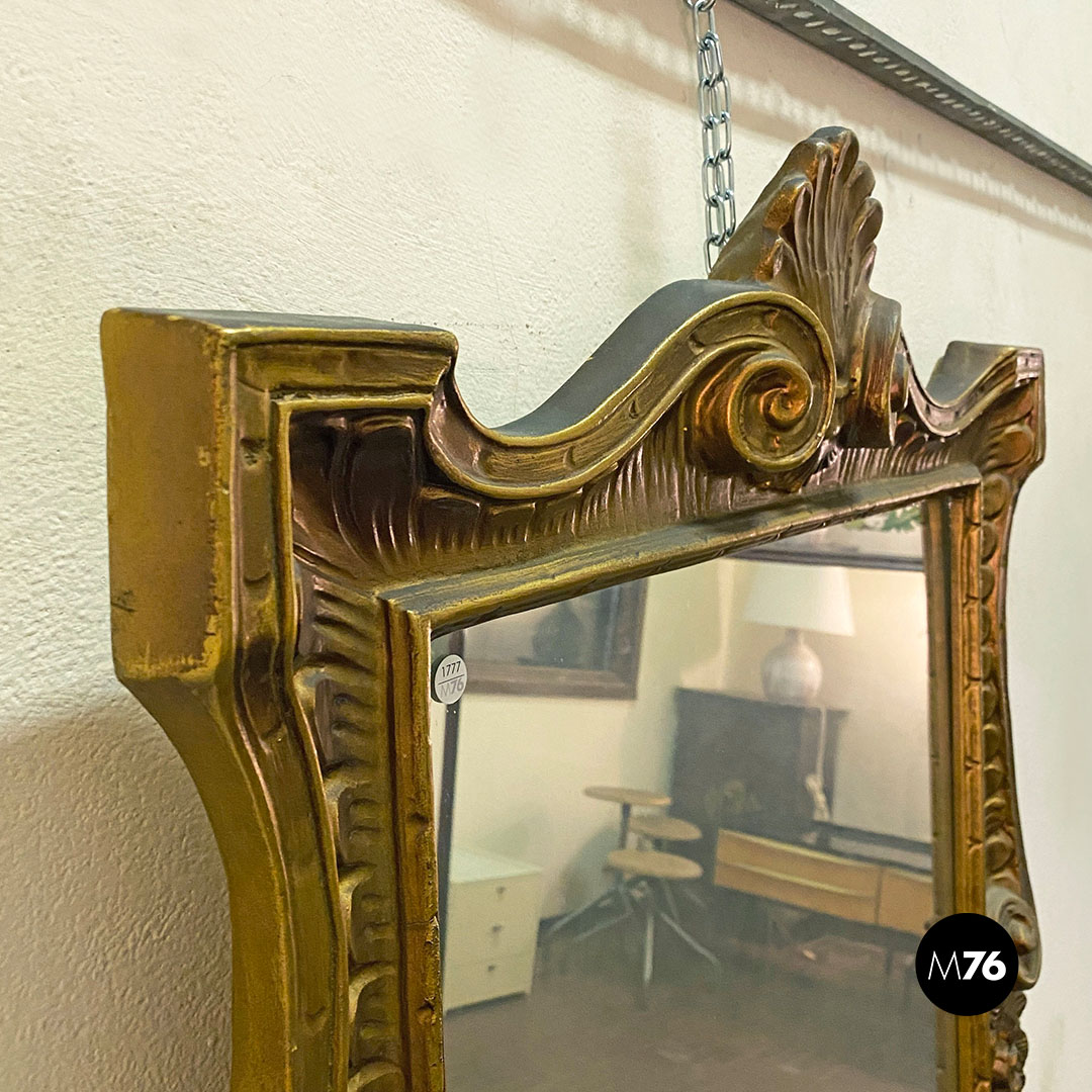 Specchio in stile con cornice dorata dal disegno mosso in legno verniciato oro.