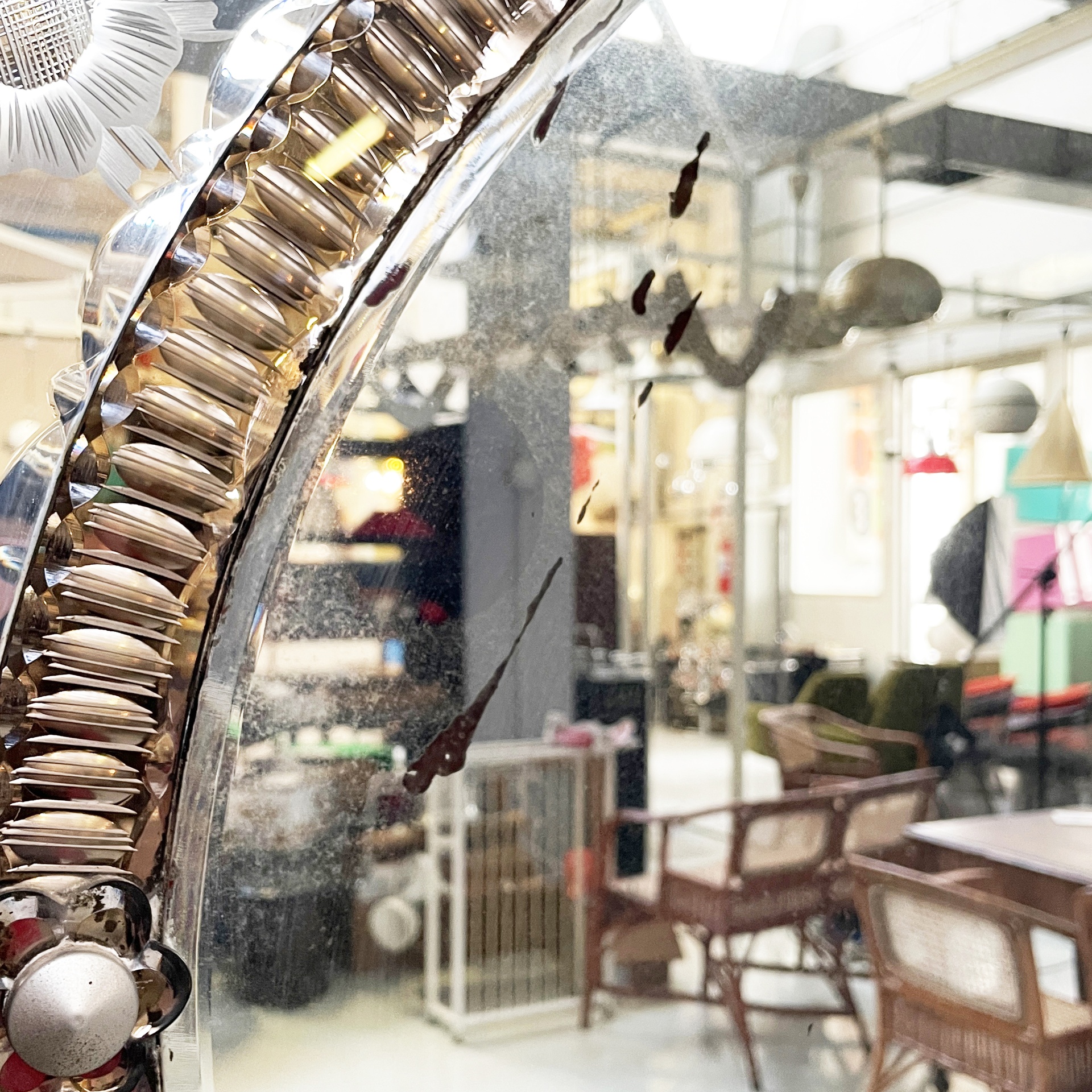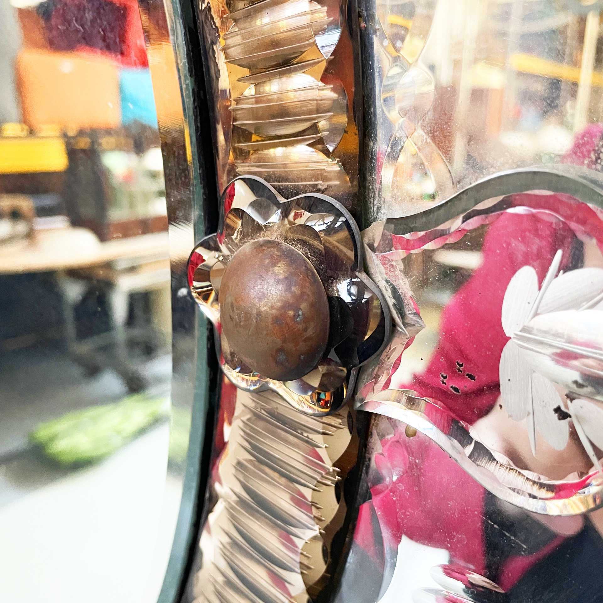 Specchio da parete ovale con i acidature a forma di fiori e foglie. Sul profilo ondulato ci sono decori a forma di foglia in specchio e fiori in vetro rosa con interno tondo in metallo. All’interno della specchiera è presente una decorazione in vetro rosato. Nella parte superiore è presente un gancio in ottone. Appartenente al periodo Art Nouveau.