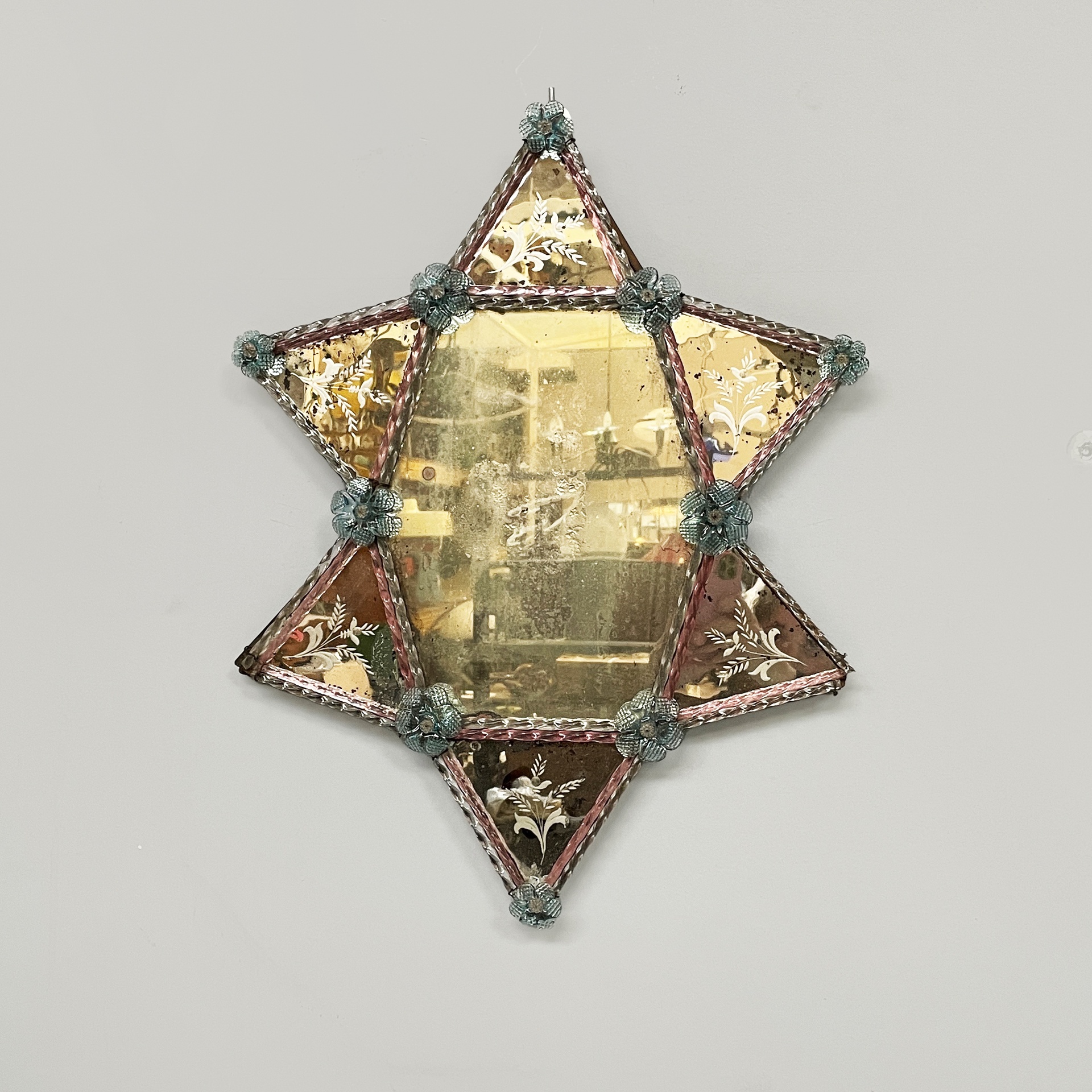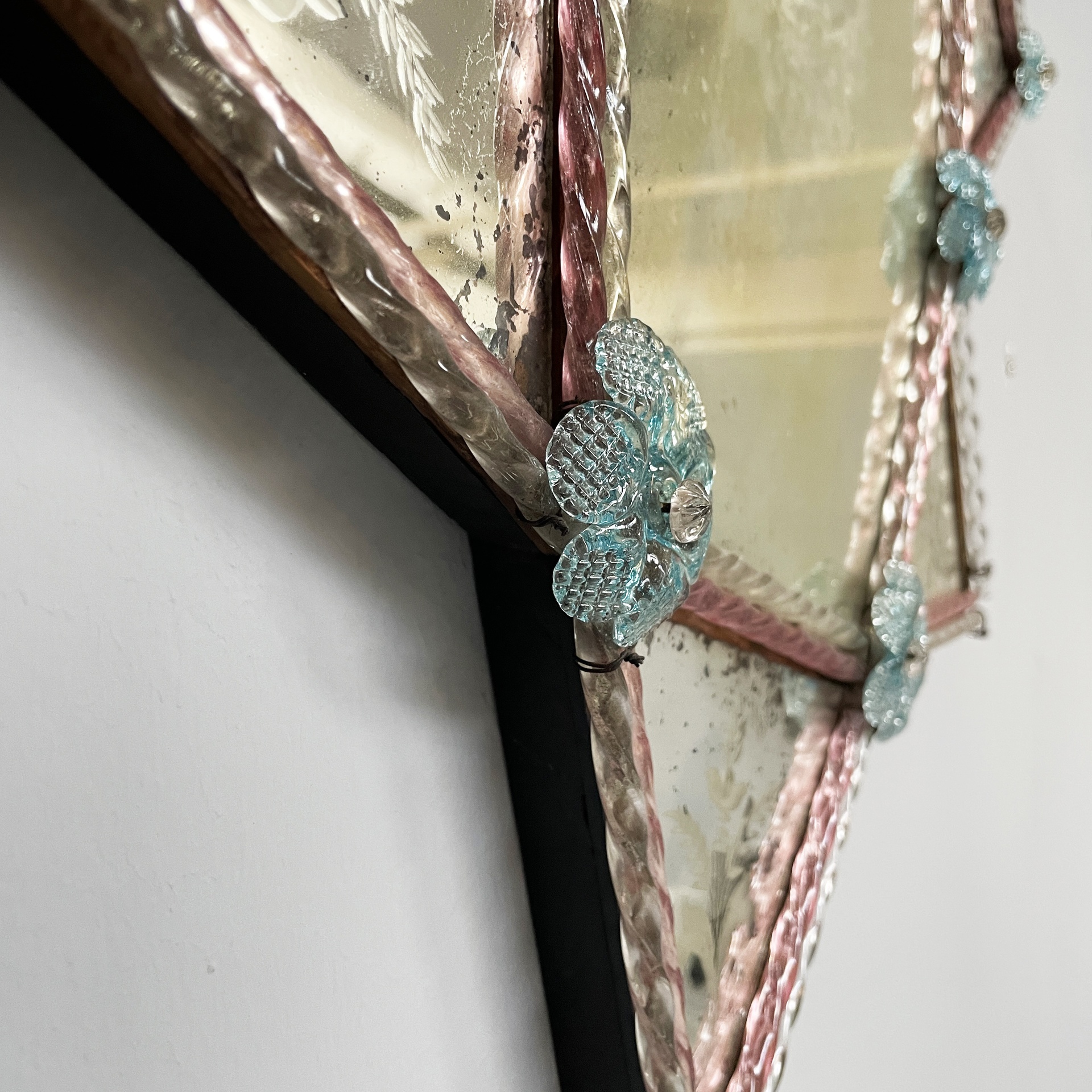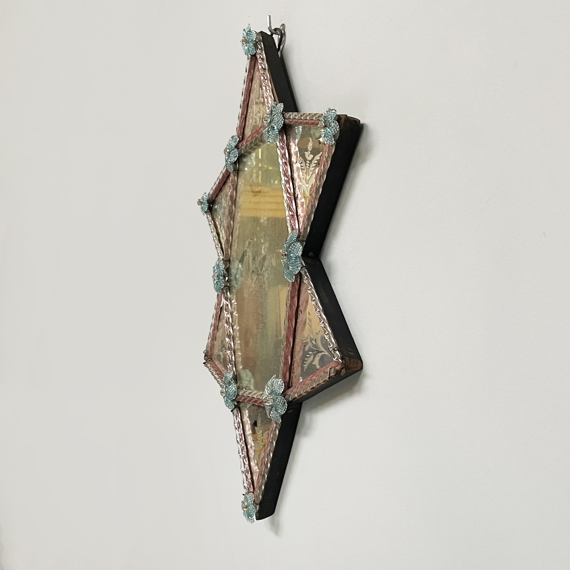 Specchio da parete geometrico con decorazioni in vetro colorato. Lo specchio centrale esagonale presenta sui lati degli specchi triangolari con acidature. Sui profili degli specchi sono presenti decorazioni in vetro trasparente e rosa. Agli angoli sono presenti dei fiori in vetro azzurro.