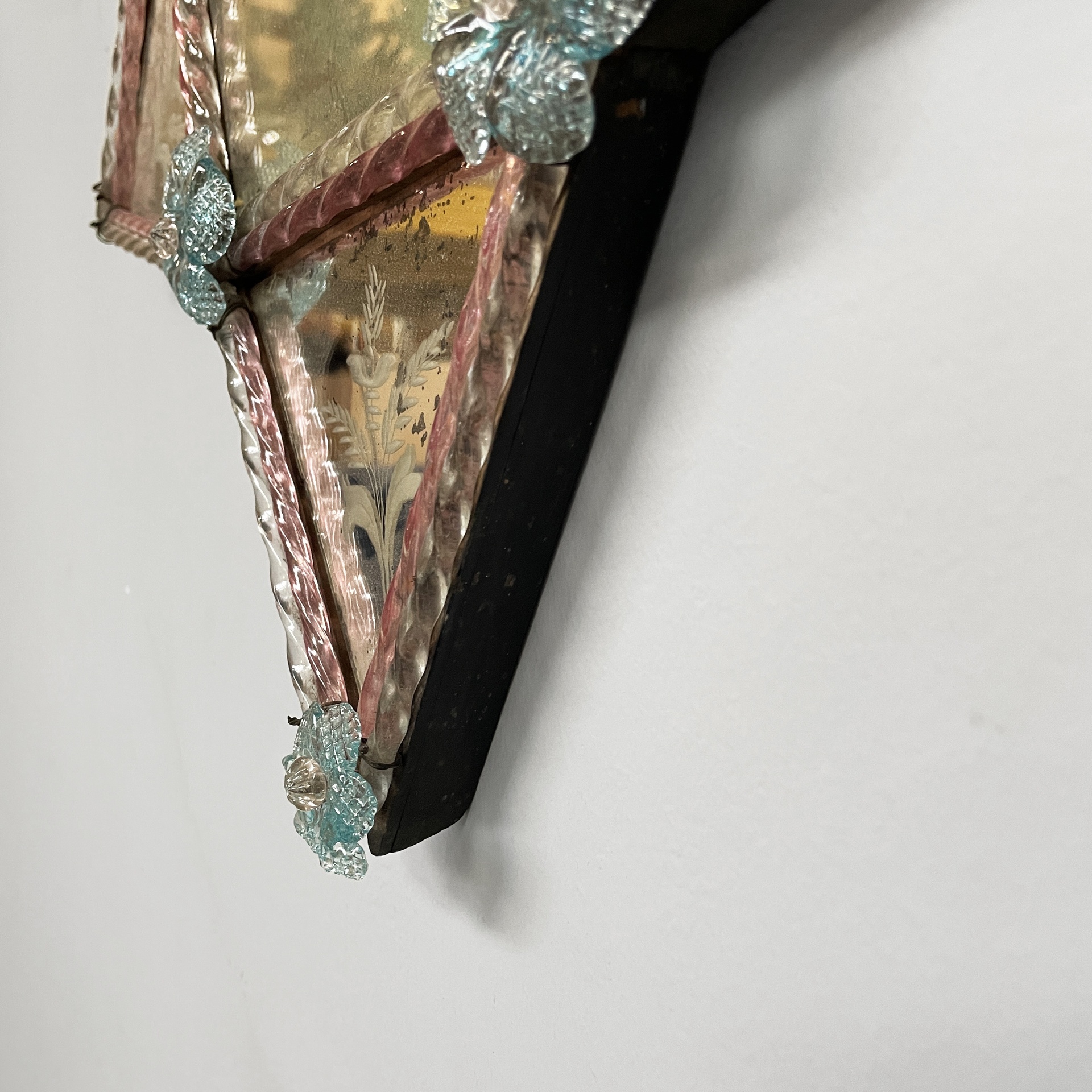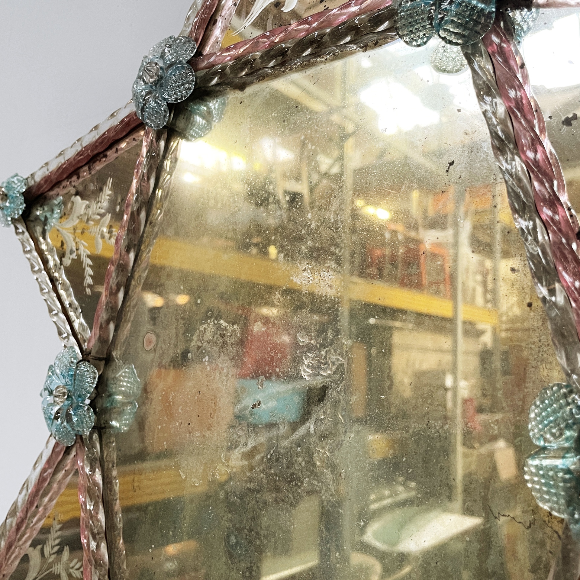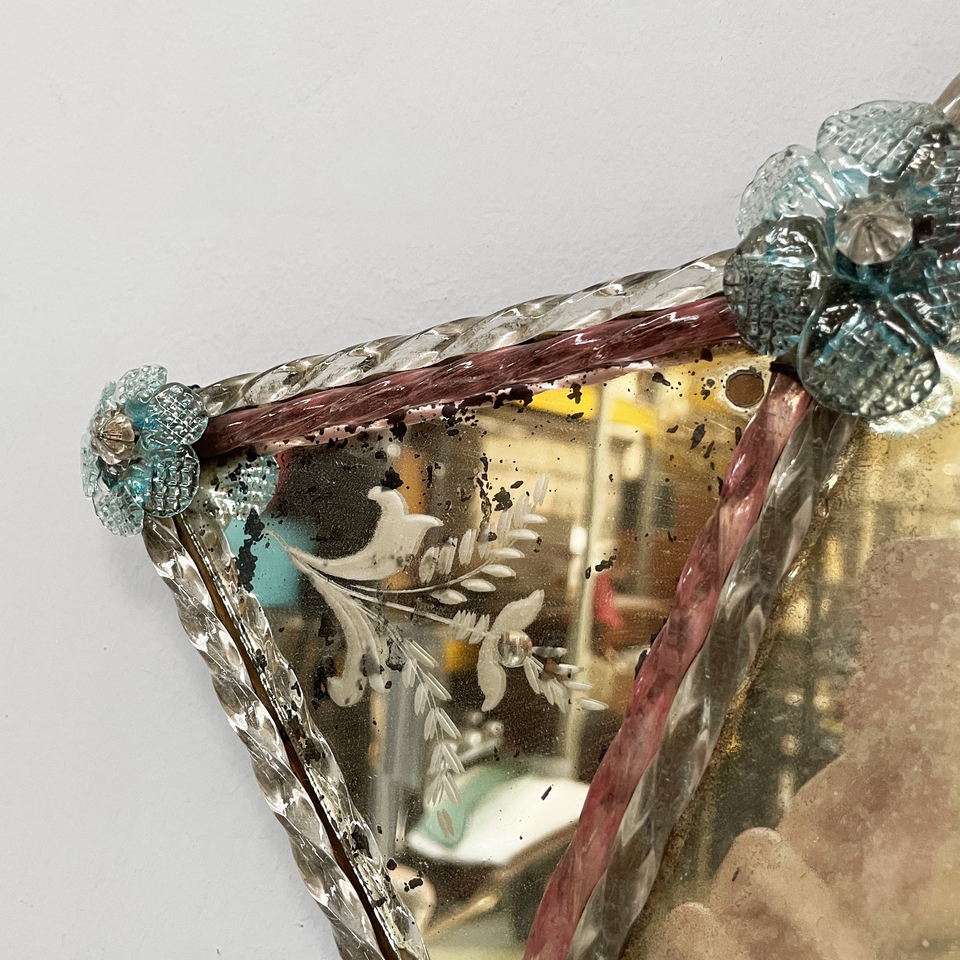 Condizioni vintage. Lo specchio presenta numerosi segni dati dal tempo e piccole mancanze. Due fiori in vetro mancanti.