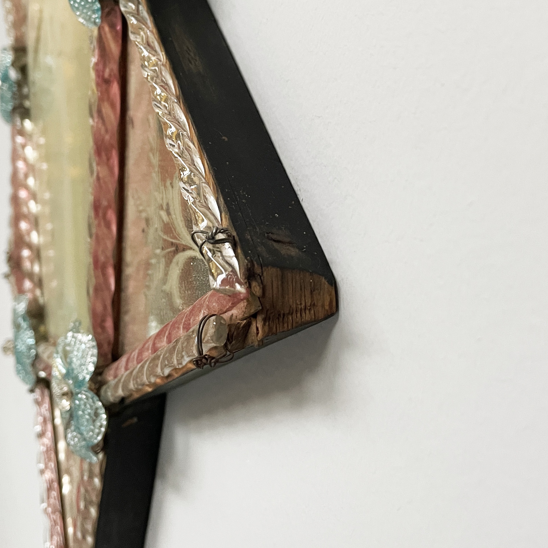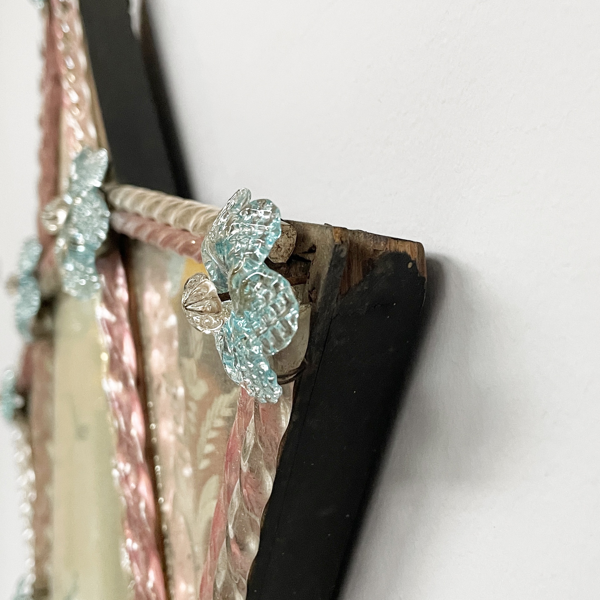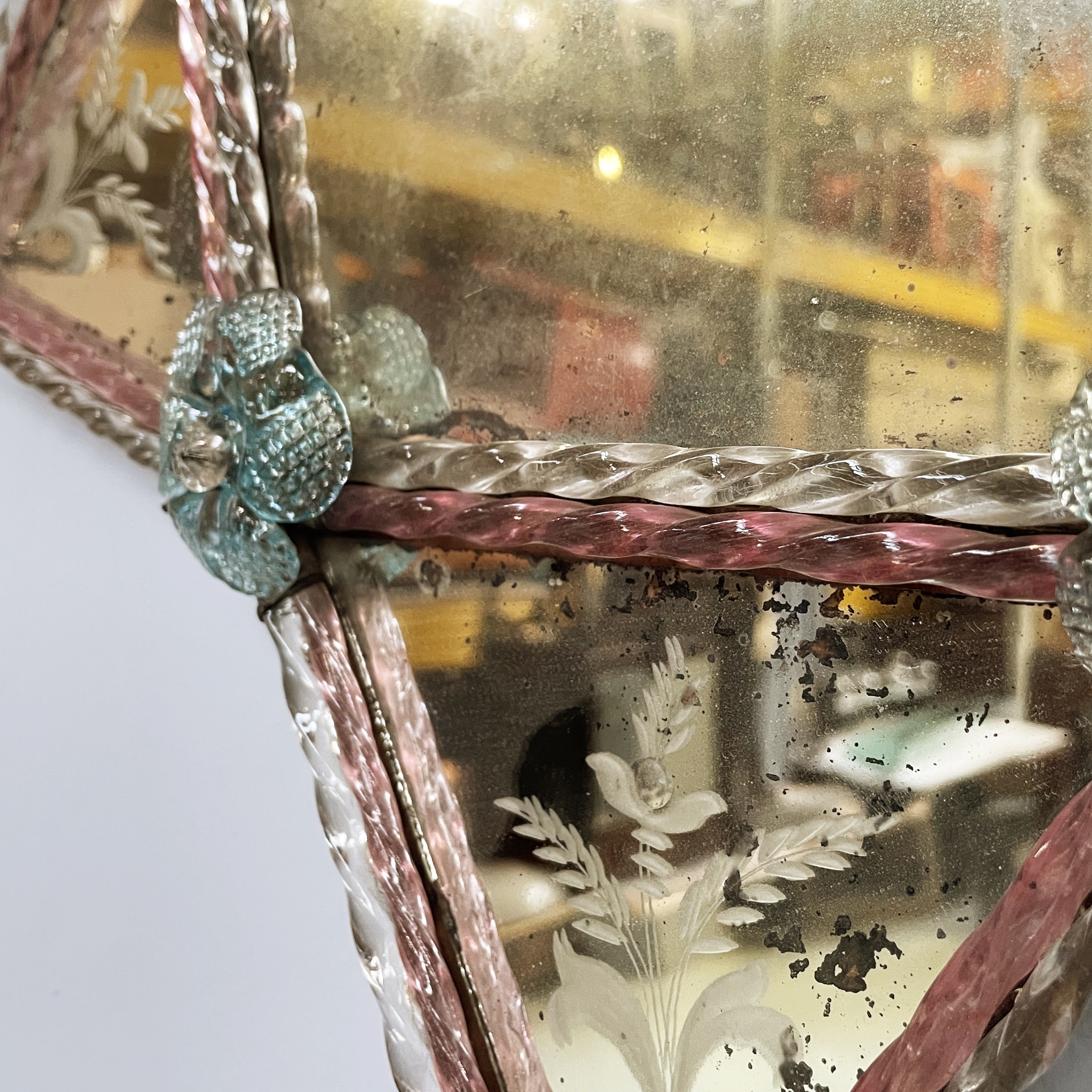 Condizioni vintage. Lo specchio presenta numerosi segni dati dal tempo e piccole mancanze. Due fiori in vetro mancanti.