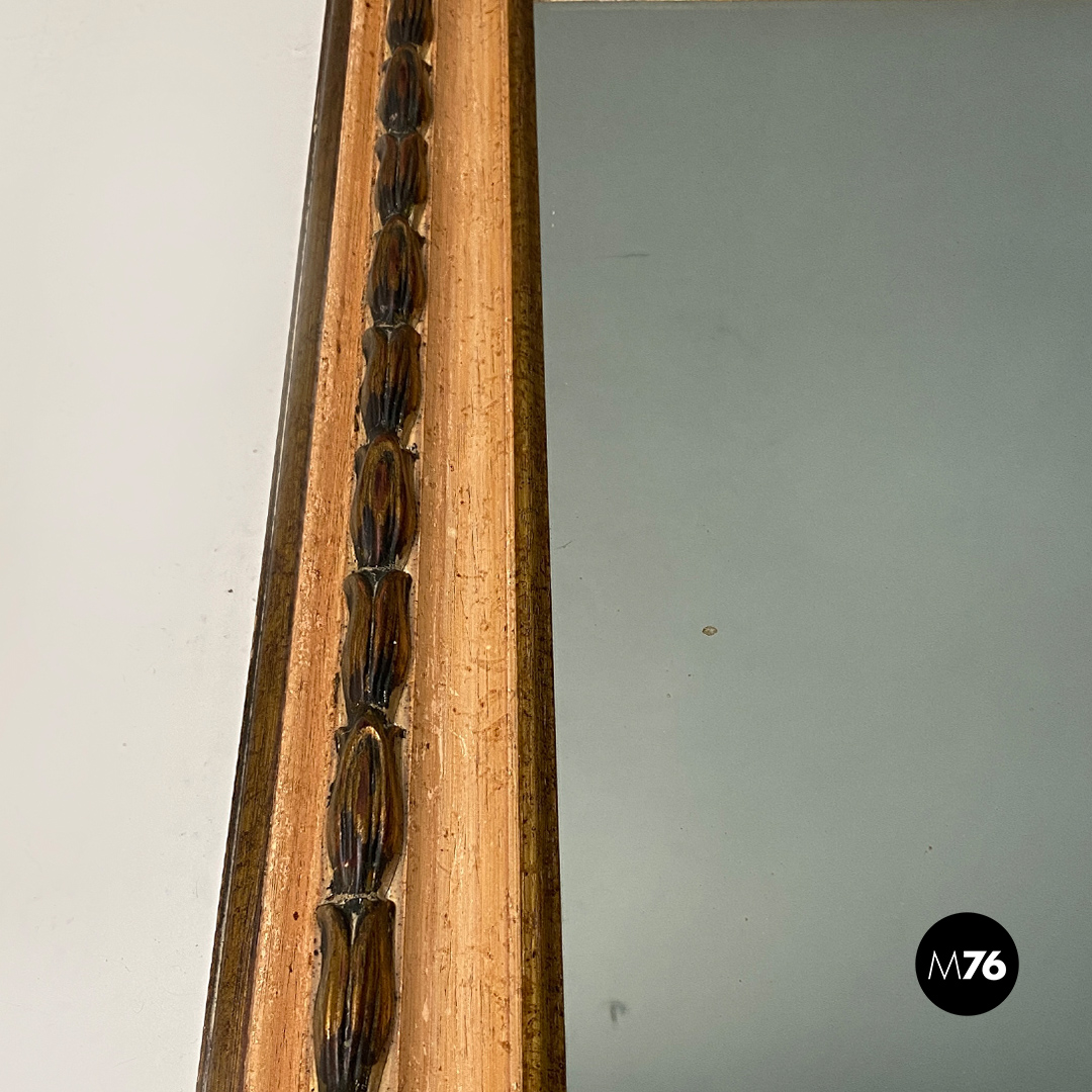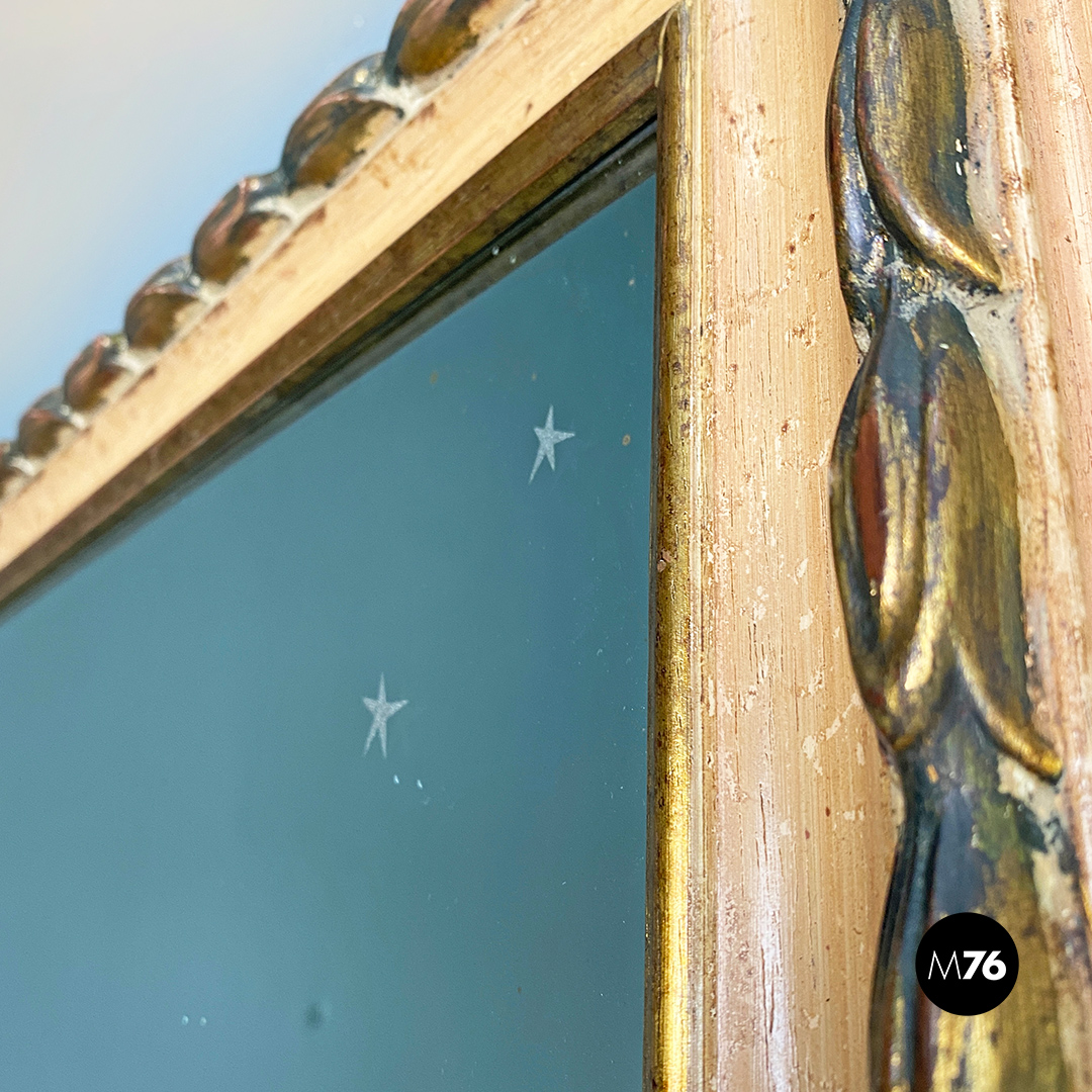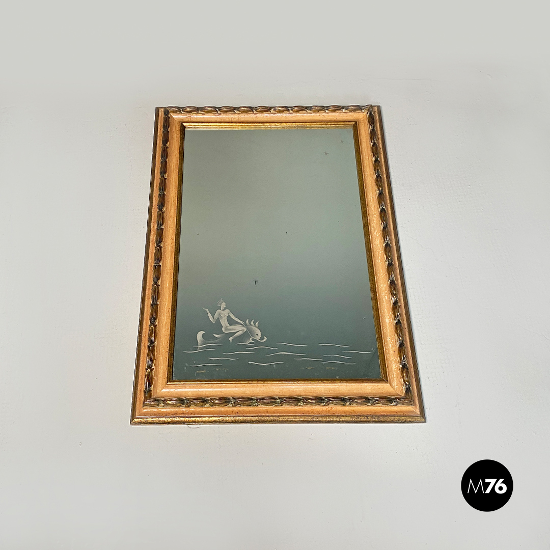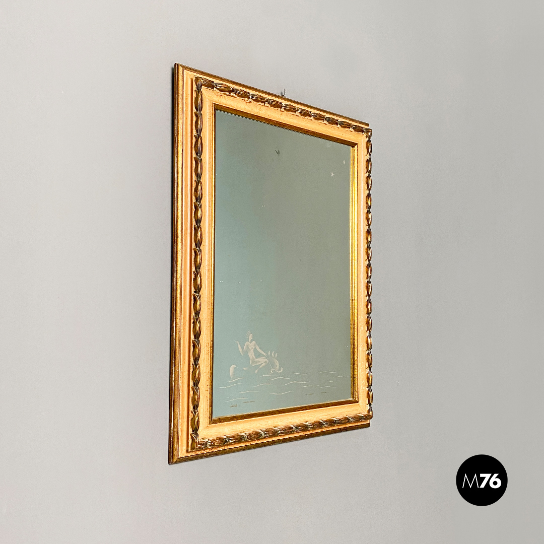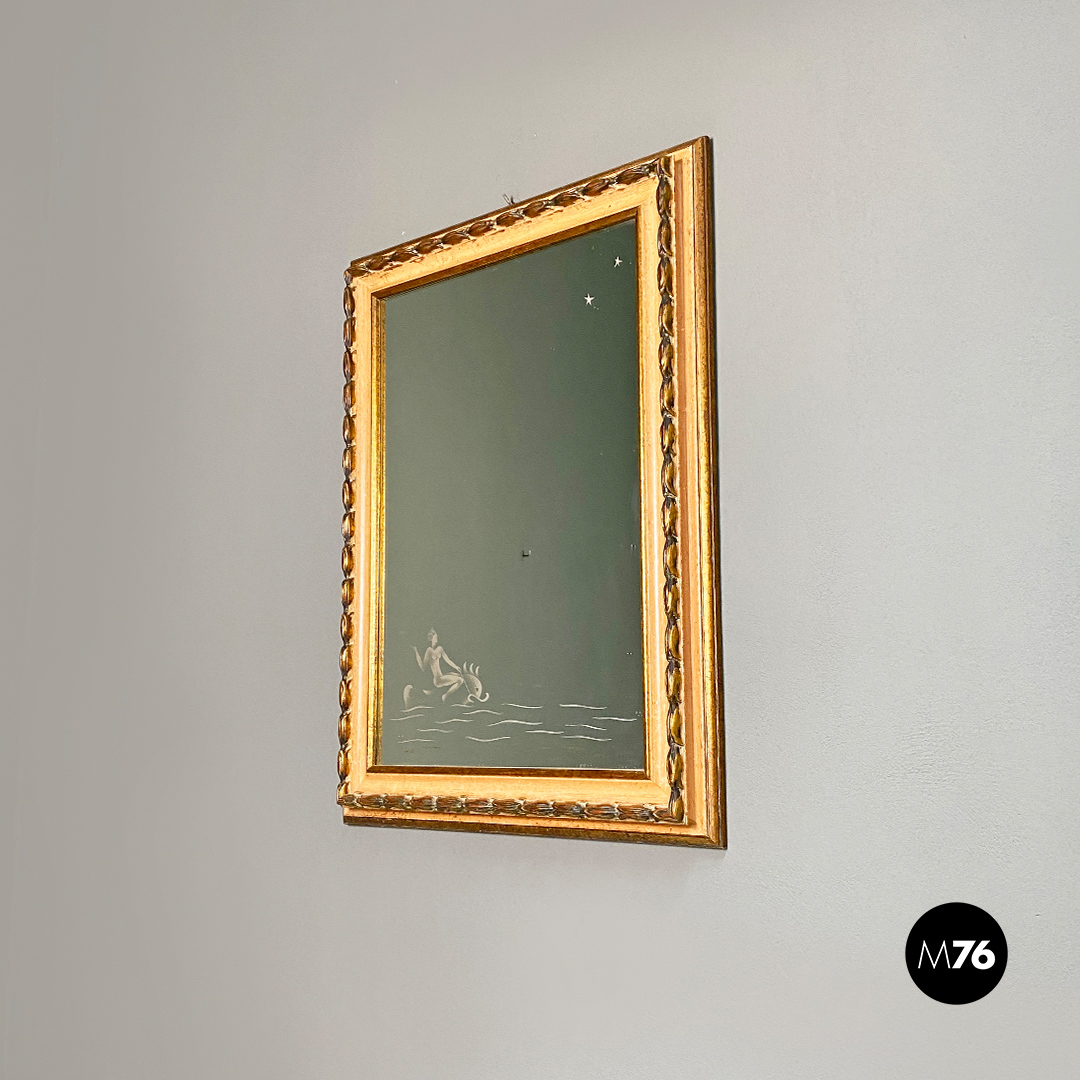 Specchio da parete di forma rettangolare con disegno sul vetro dalle linee pontiane raffigurante una scena marina stilizzata con due piccole stelle disegnate nella parte in alto a destra. Cornice in legno intagliato con lavorazione dorata in rilievo.