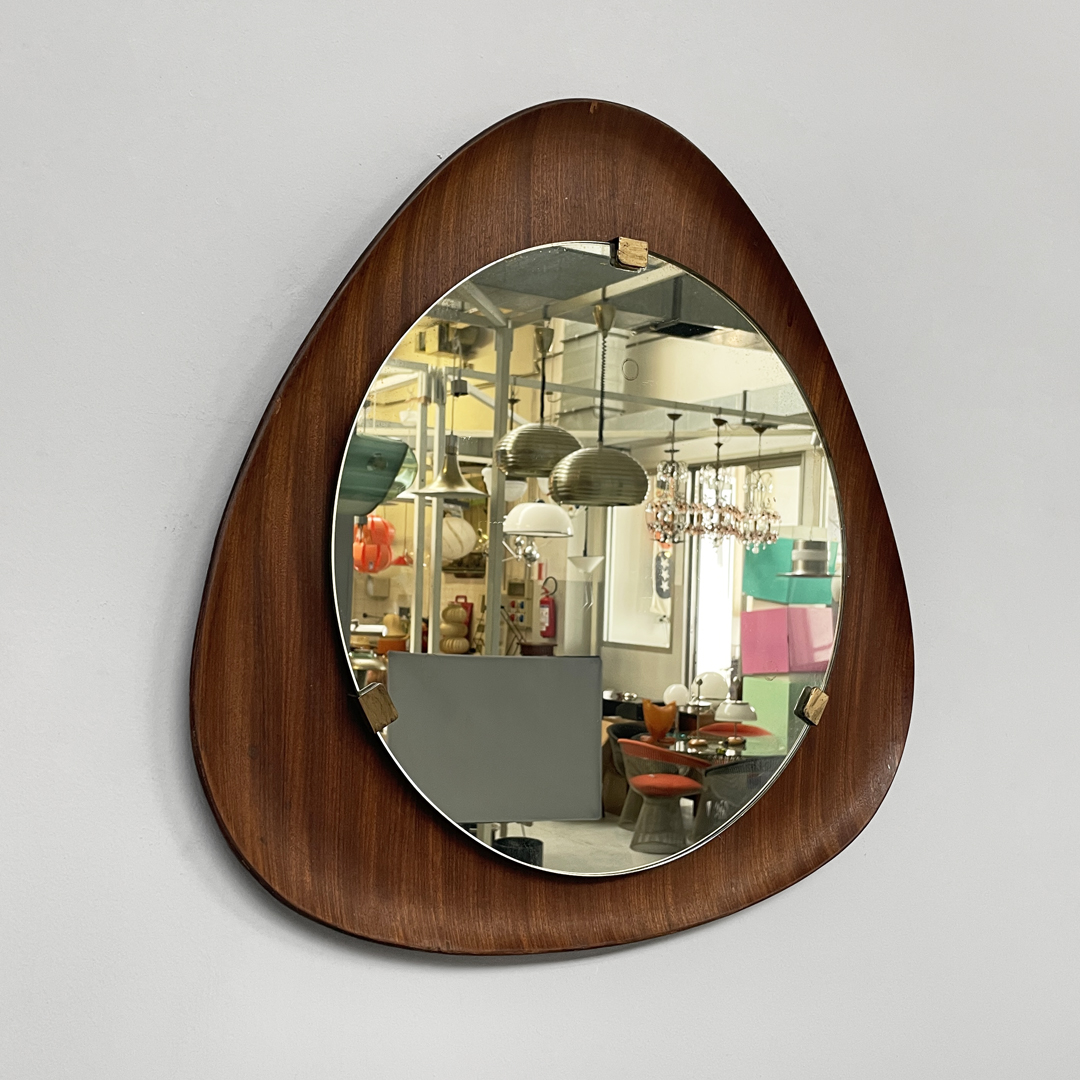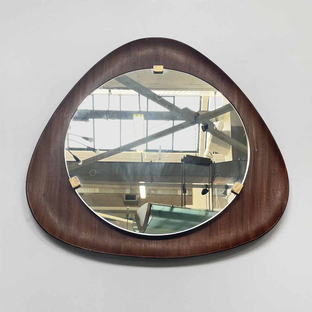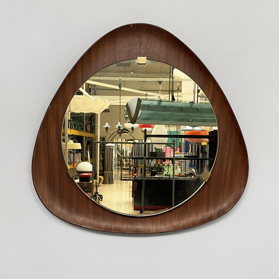 Specchio da parete dalla forma triangolare curvata, con cornice in legno.