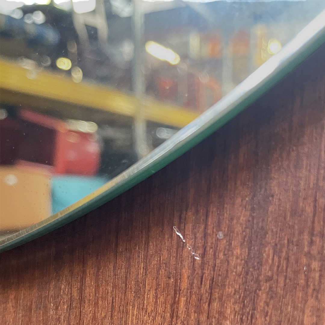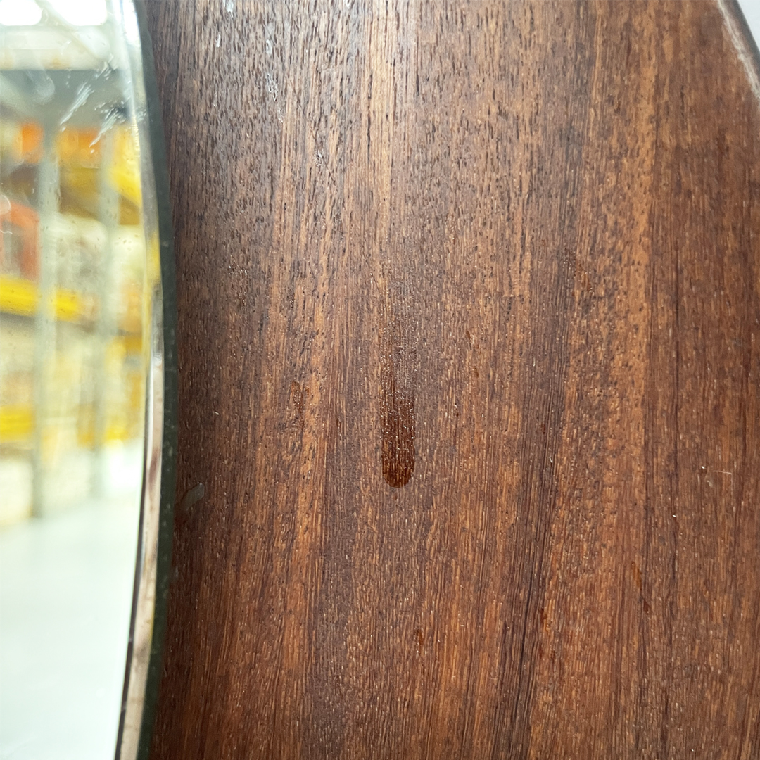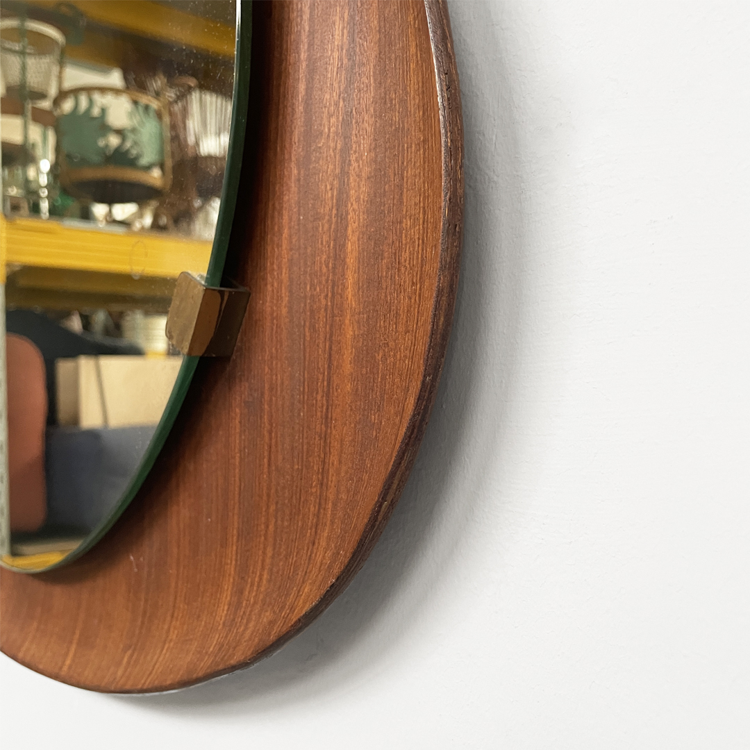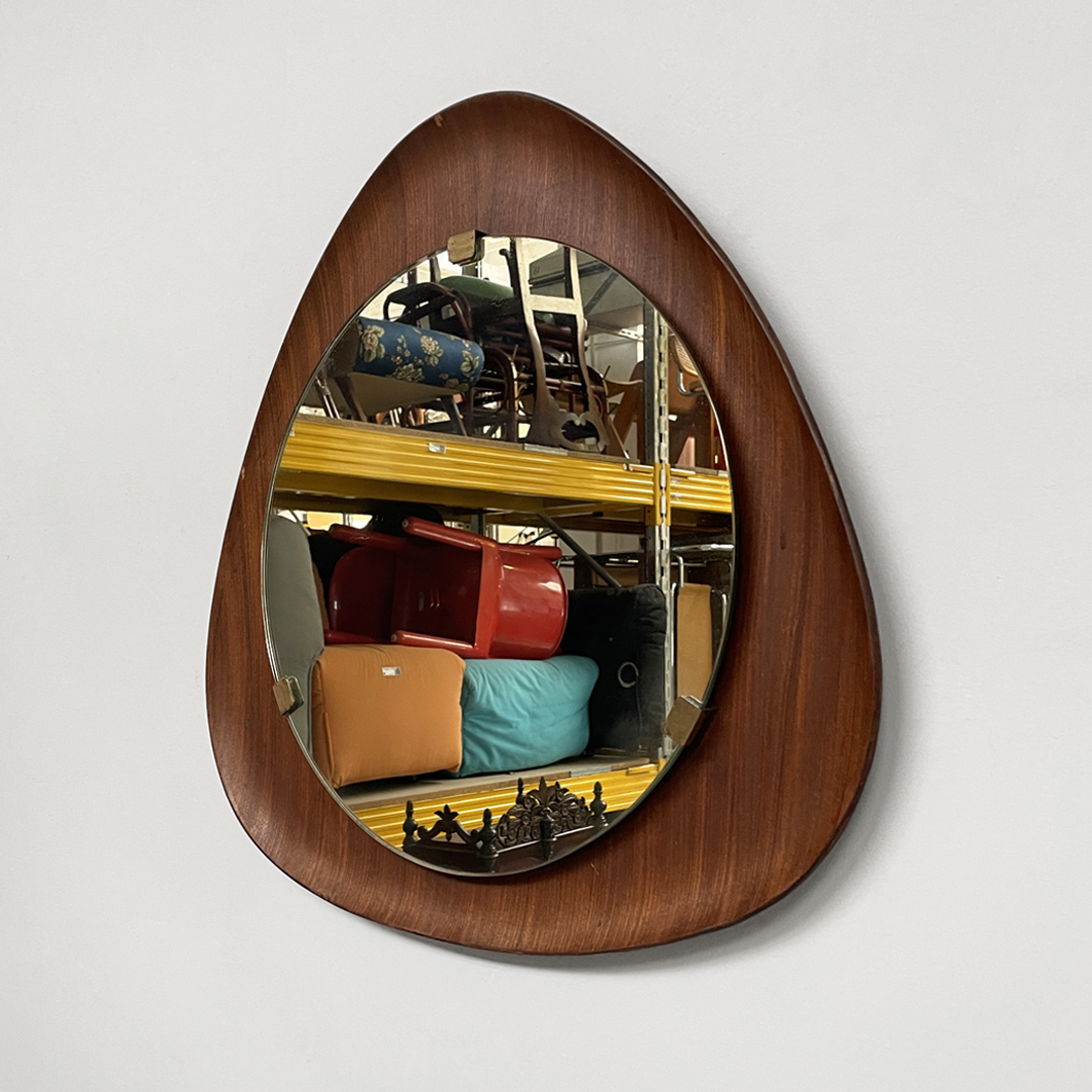 Specchio da parete dalla forma triangolare curvata, con cornice in legno.