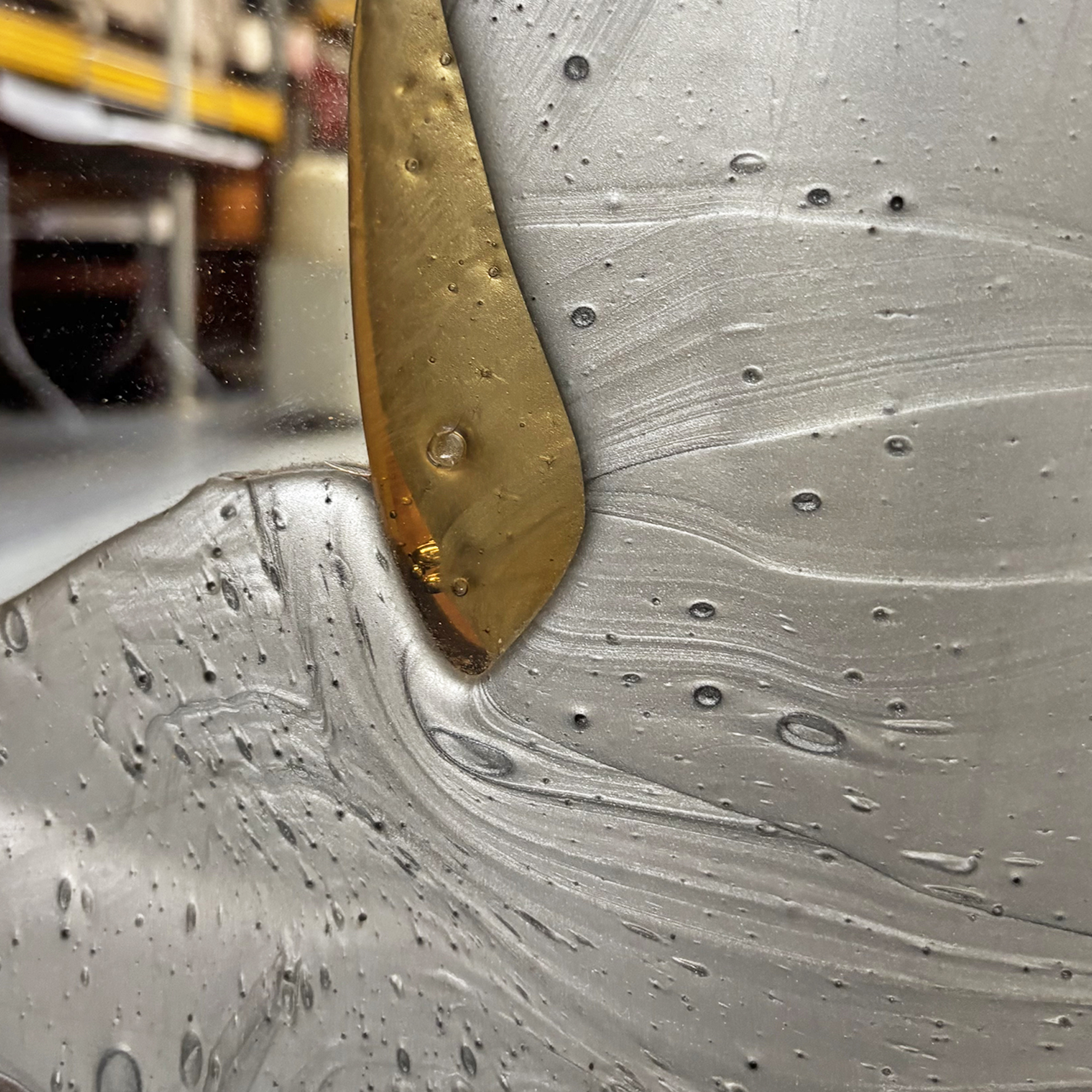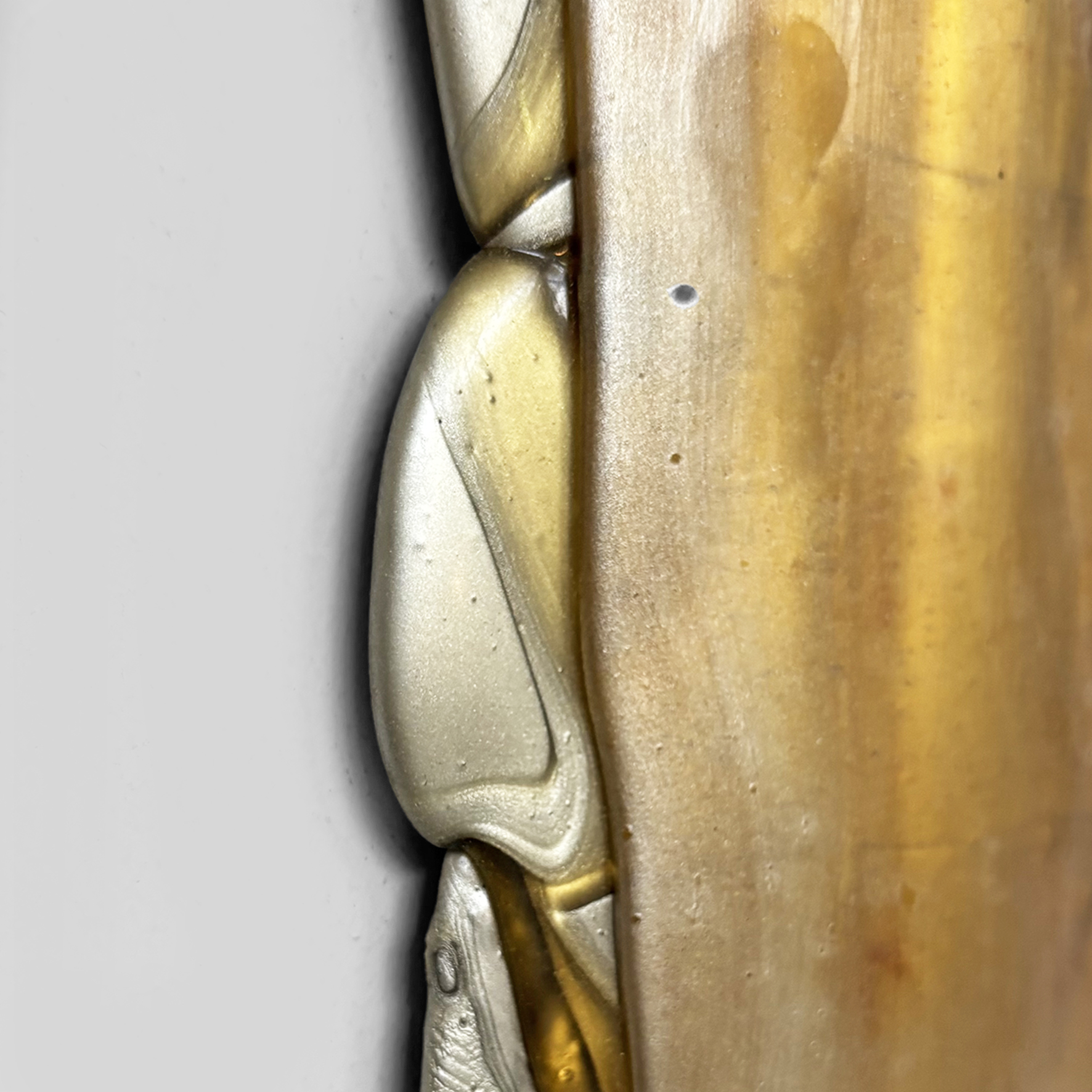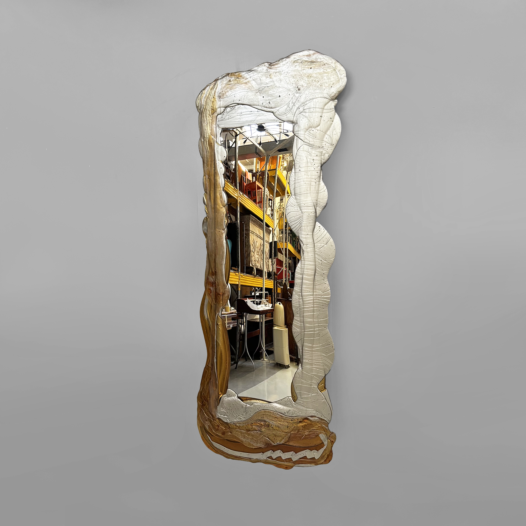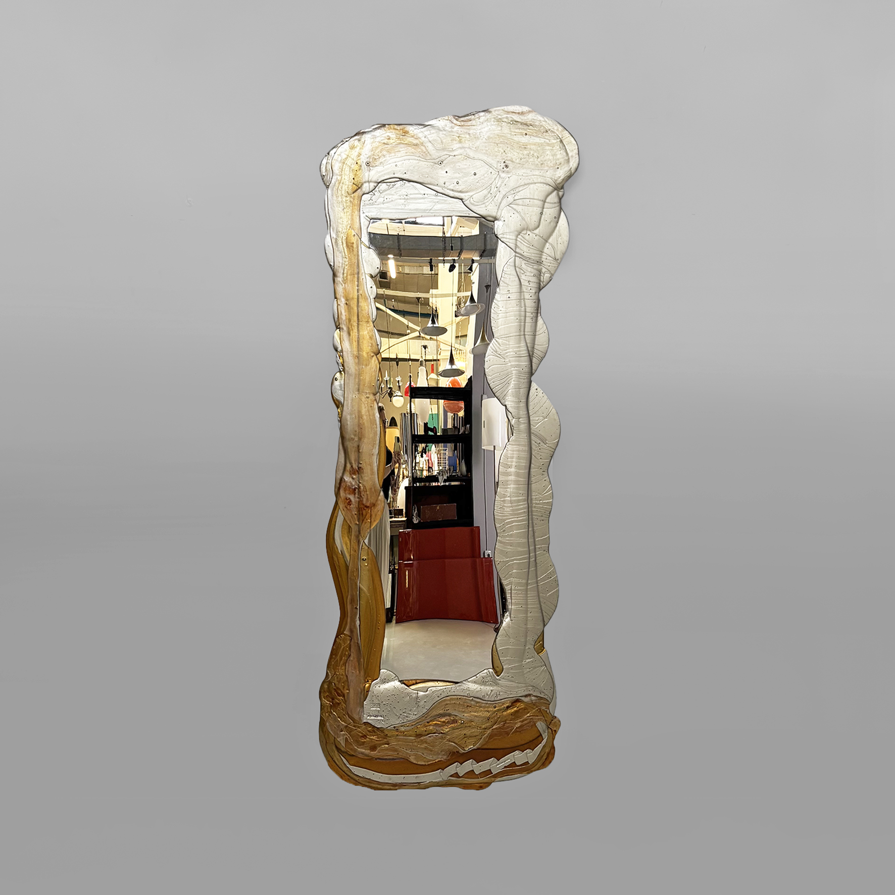 Specchio da parete con cornice in resina di forma irregolare, dalla sagoma curvilinea, sui toni del giallo dorato, bianco e argento. Lo specchio interno è di forma rettangolare.
