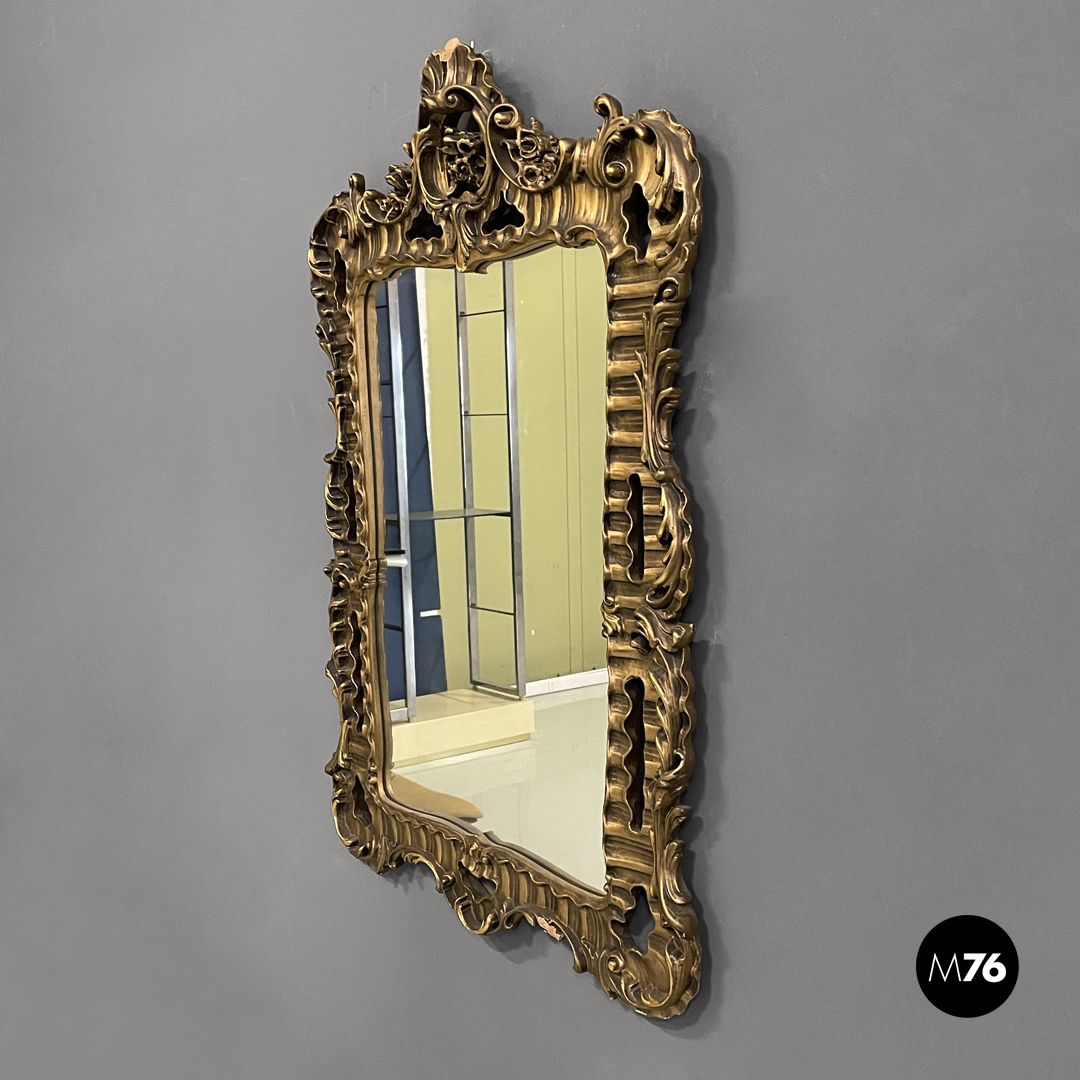 Specchio da parete rettangolare finemente decorato. La struttura è in legno laccato di colore oro con sfumature marroni.
