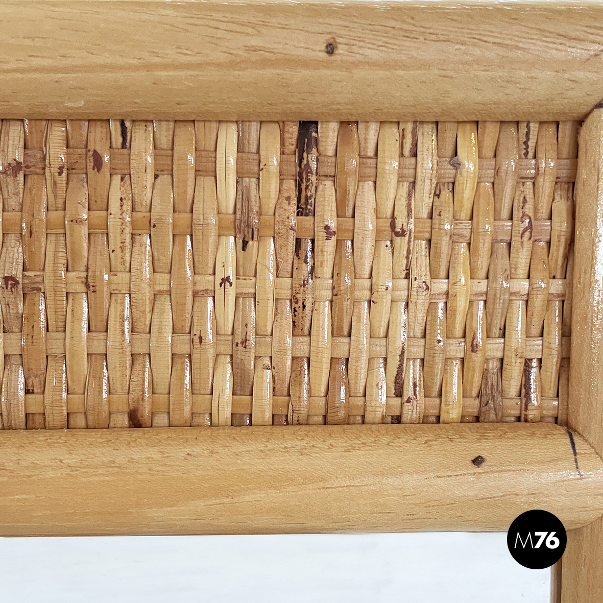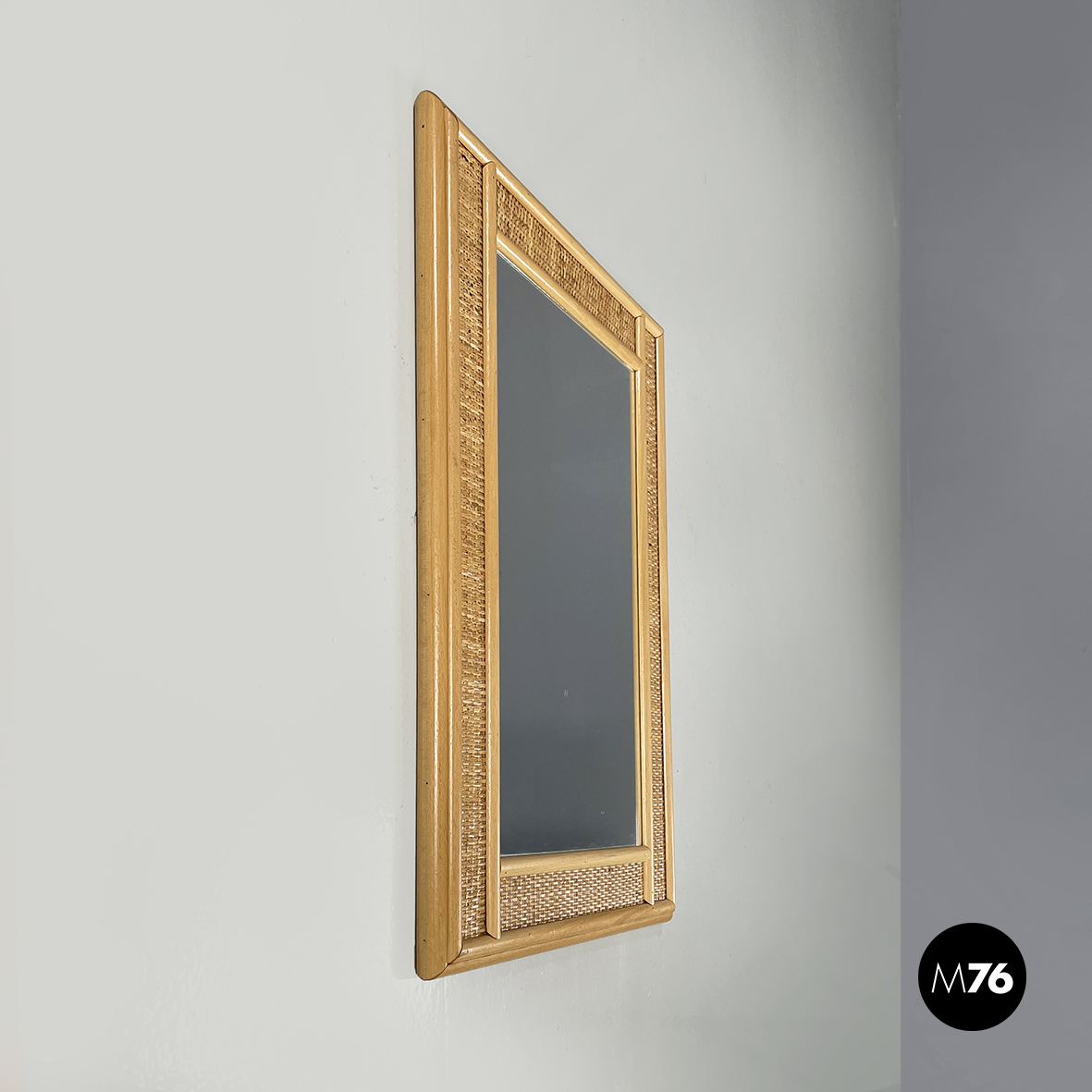 Specchio da parete rettangolare in legno e rattan. La cornice presenta due listelli di legno per lato e nel mezzo una striscia di rattan intrecciato.