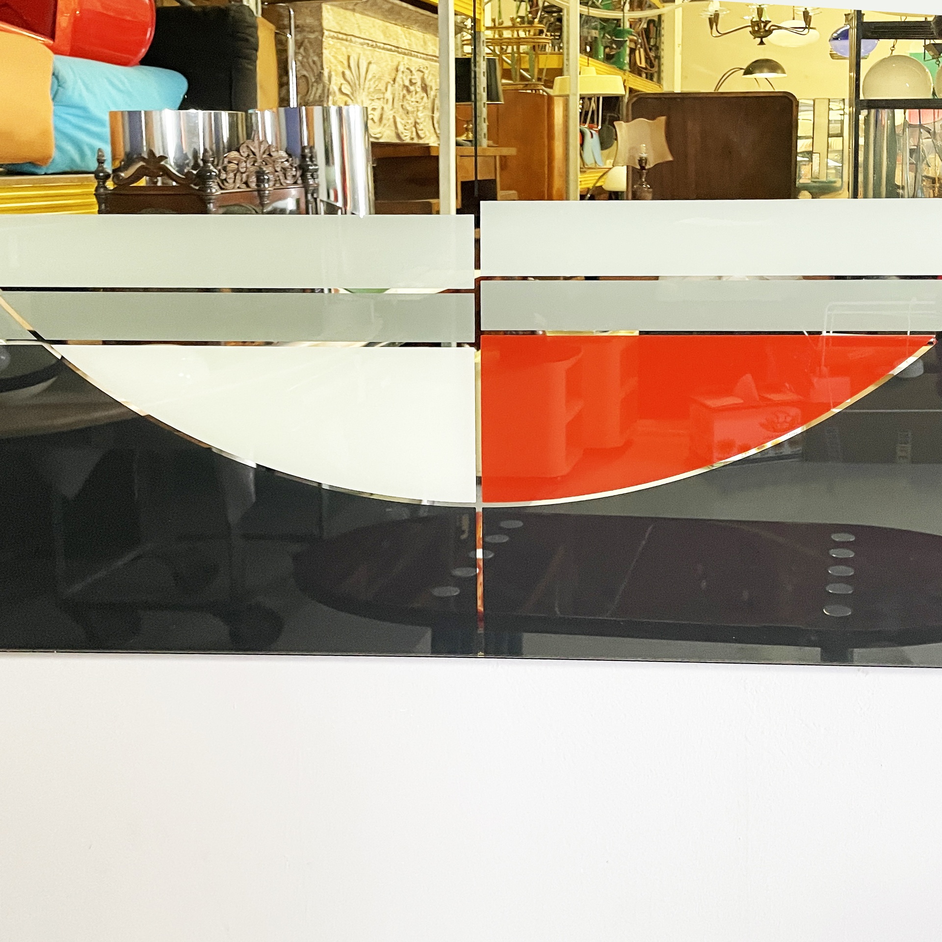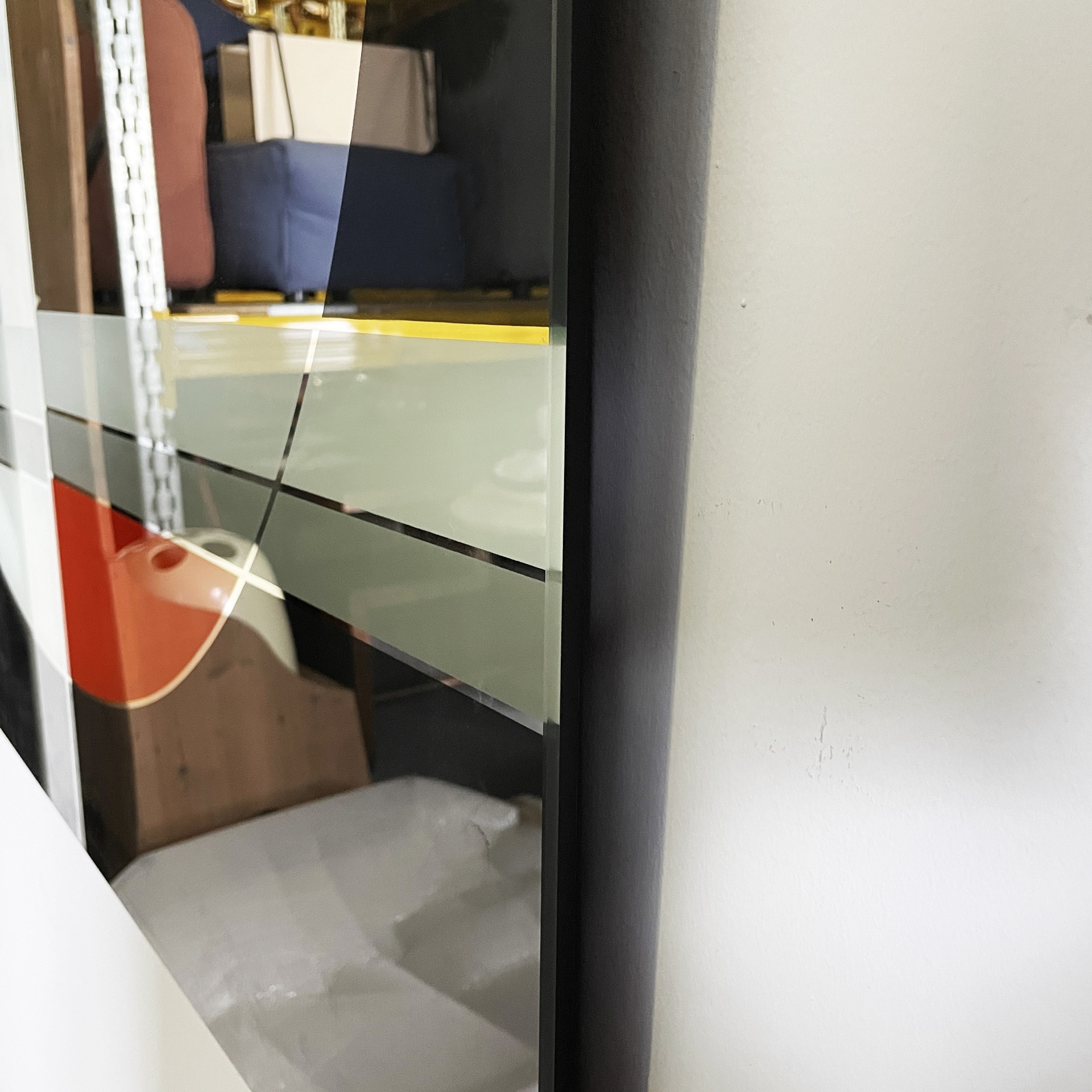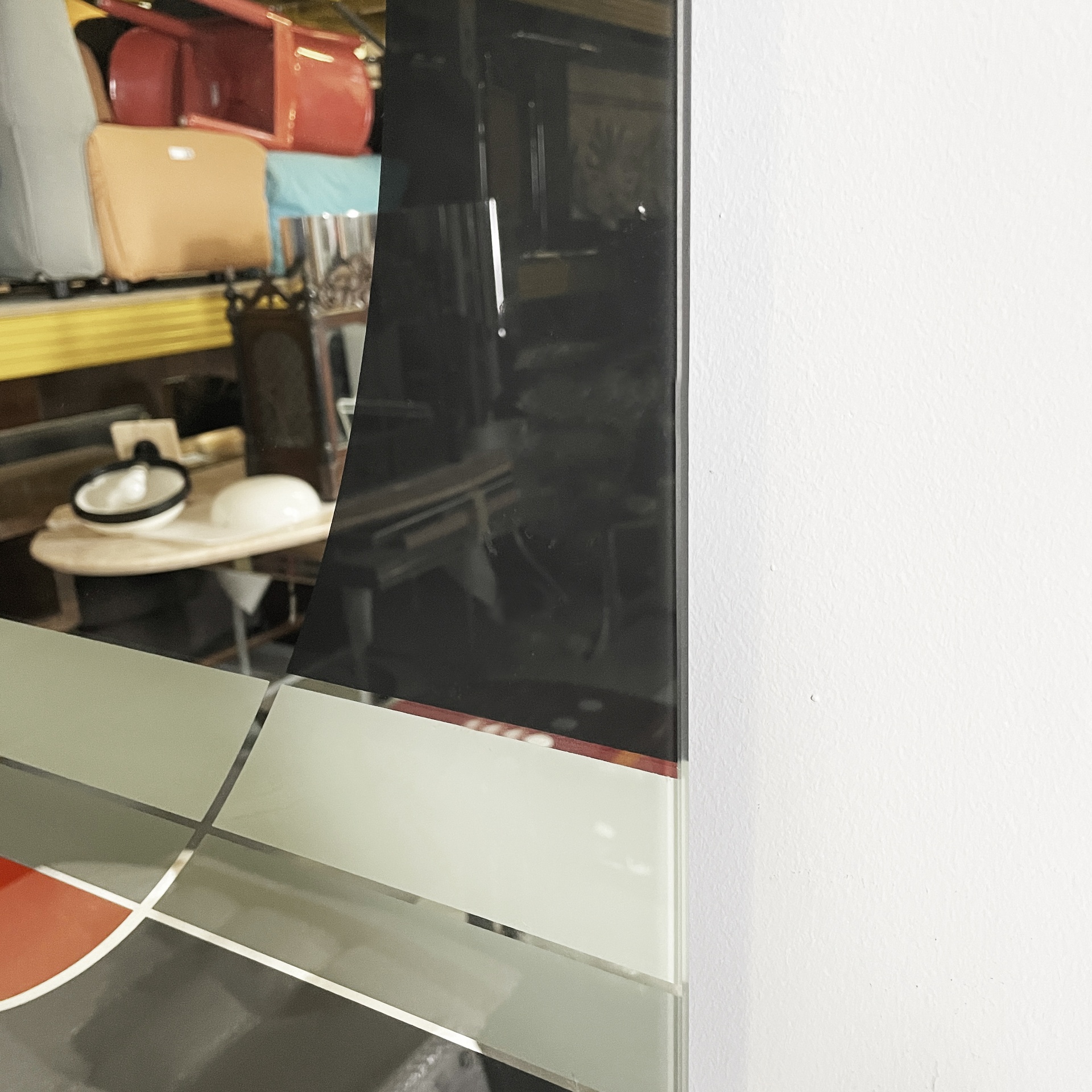 Specchio da parete appartenente alla serie Morphos di forma rettangolare. Sul profilo sono presenti decori geometrici in nero rosso e grigio.