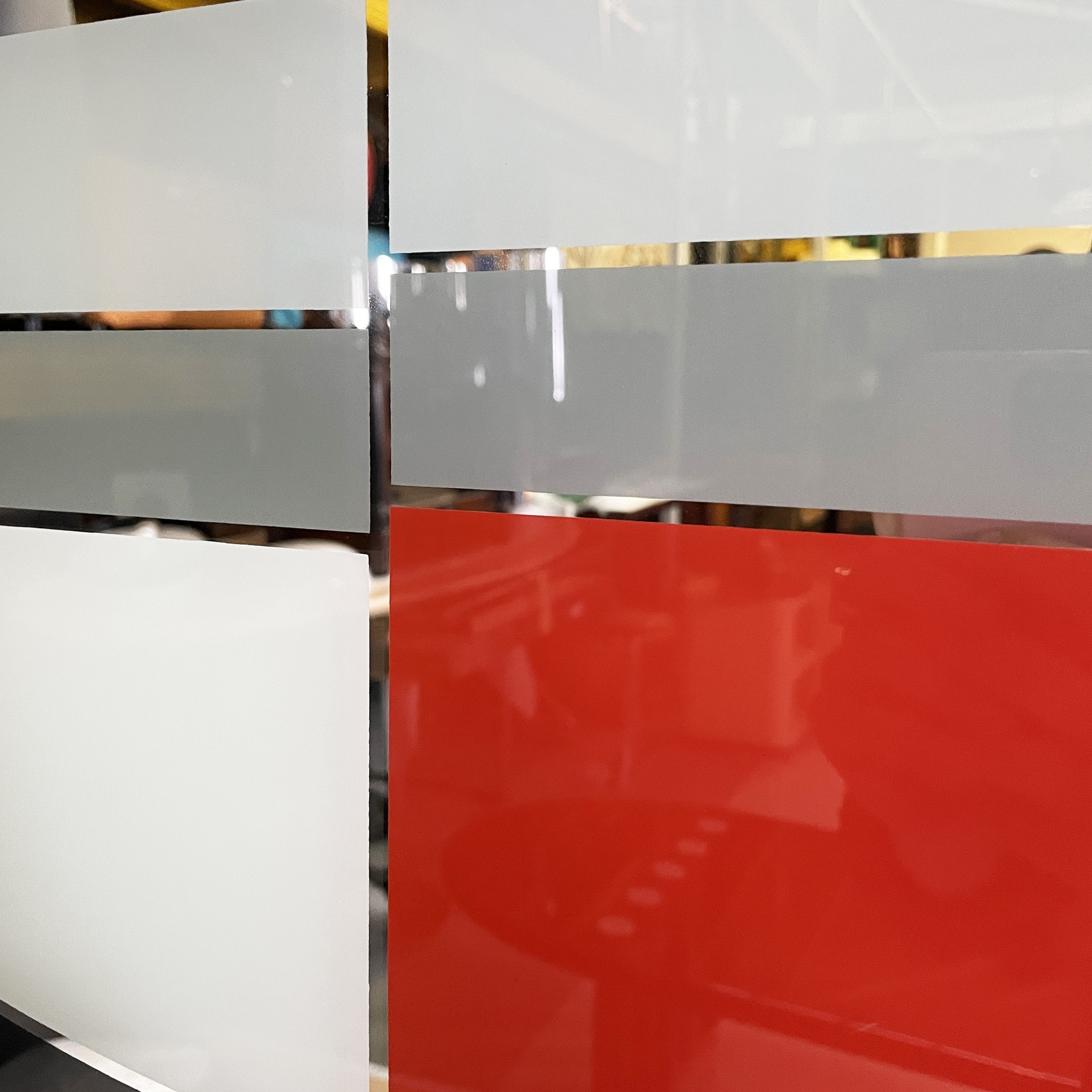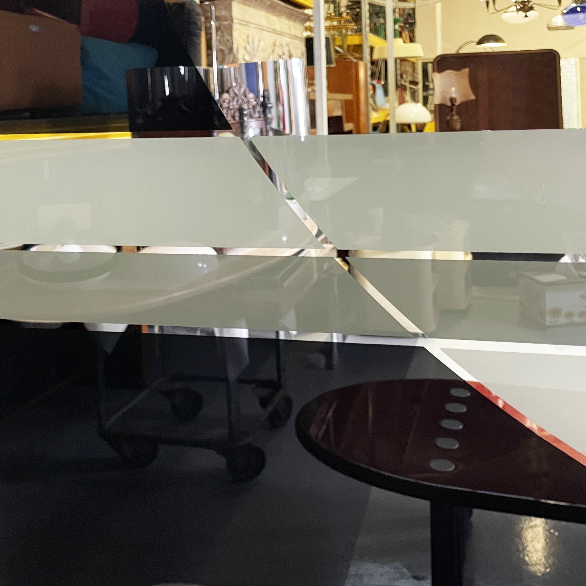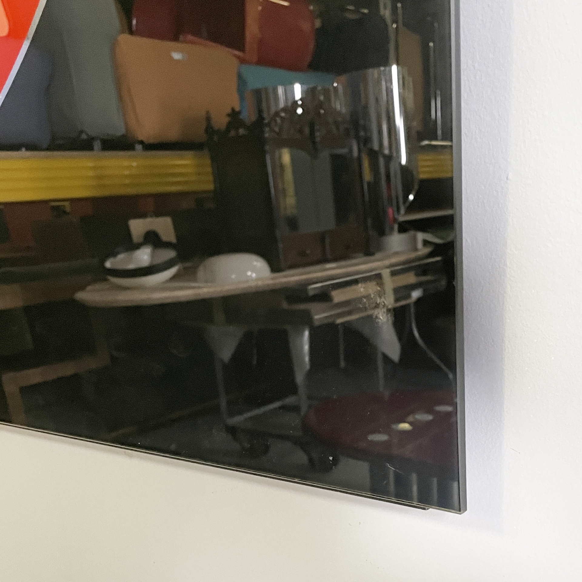 Specchio da parete appartenente alla serie Morphos di forma rettangolare. Sul profilo sono presenti decori geometrici in nero rosso e grigio.