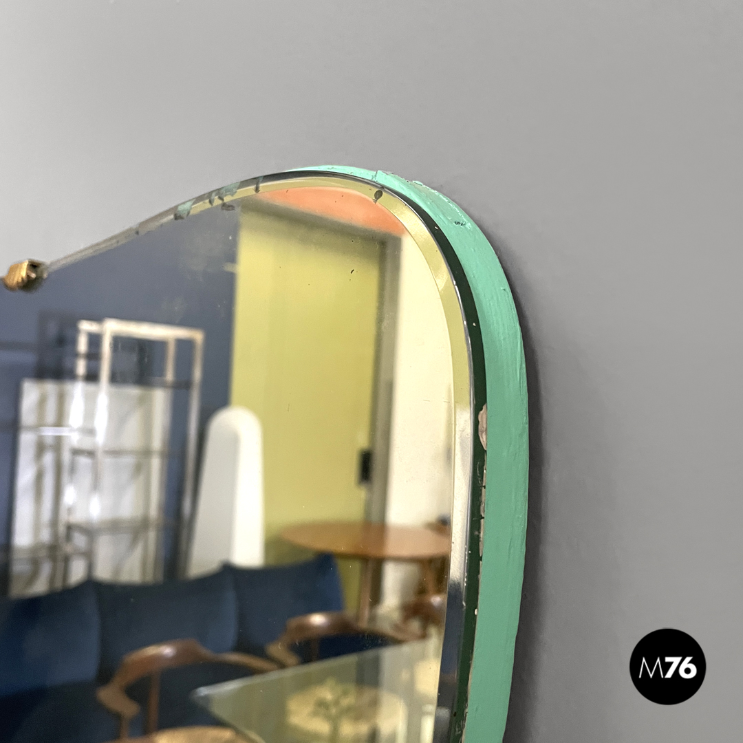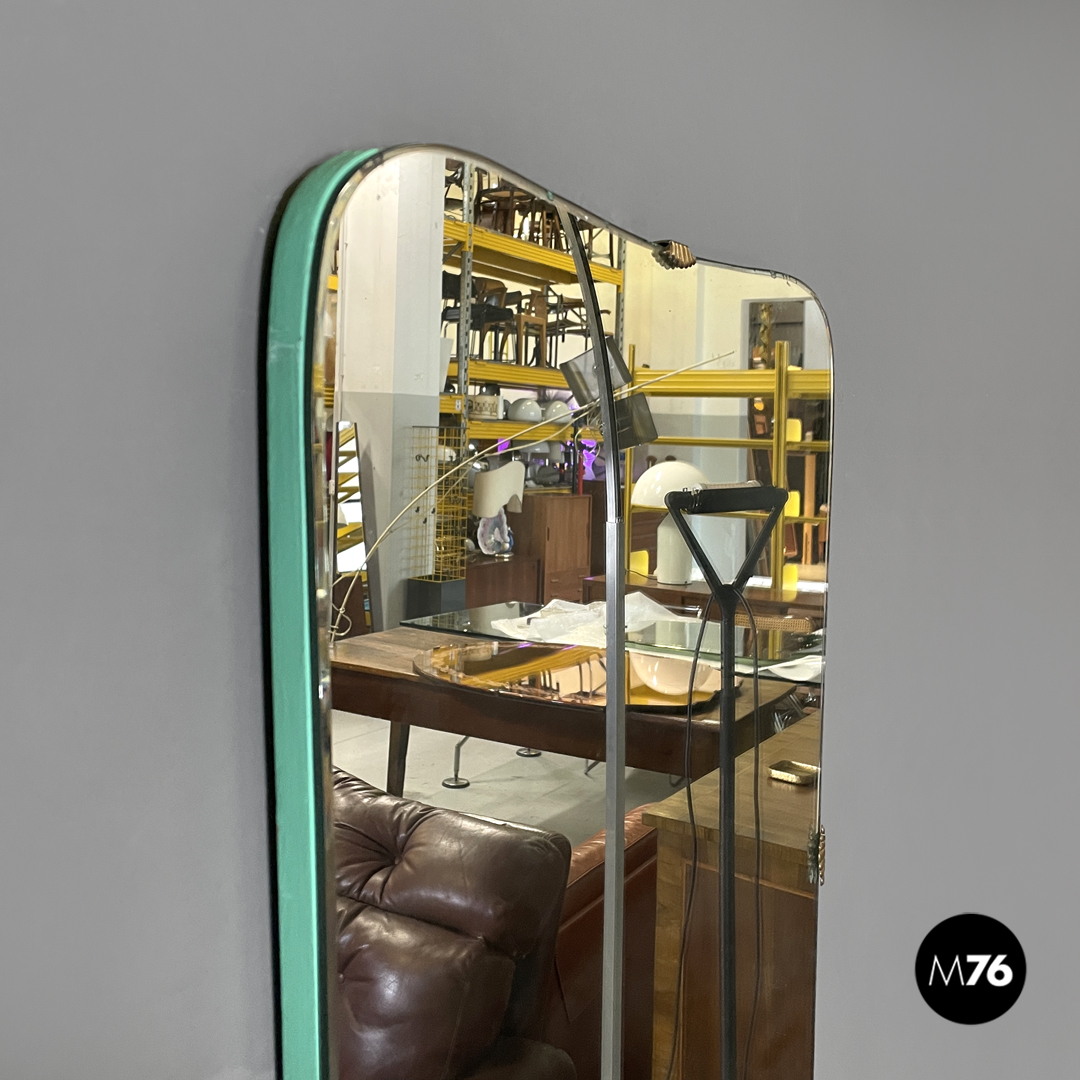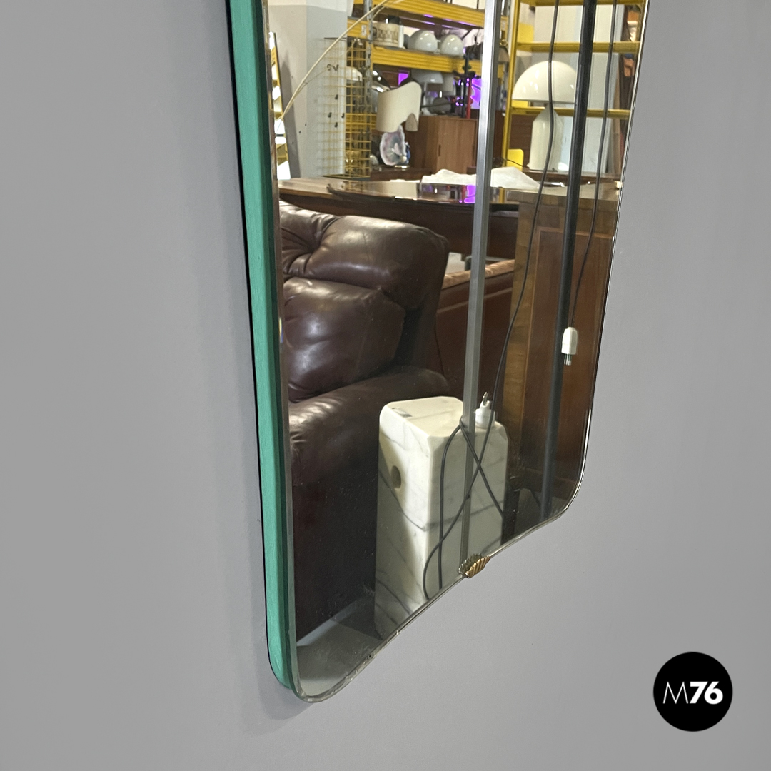 Specchio da parete rettangolare. Gli angoli sono stondati la struttura in legno si stringe nella parte bassa ed ha i profili dipinti di verde acqua. La parte dello specchio è fissata alla struttura tramite quattro ganci in ottone con forme che ricordano quelle di una conchiglia.