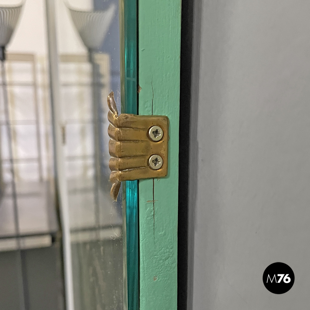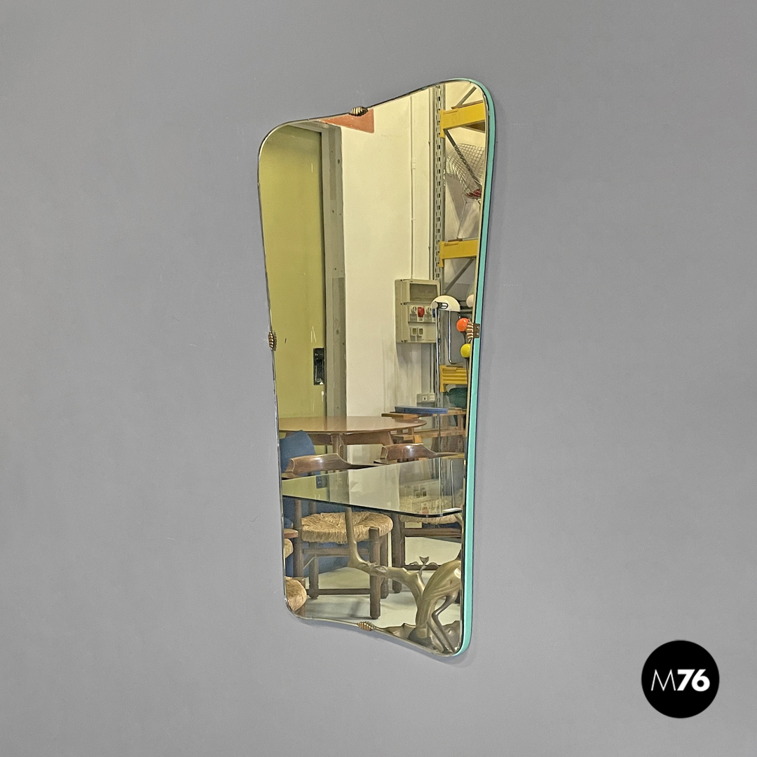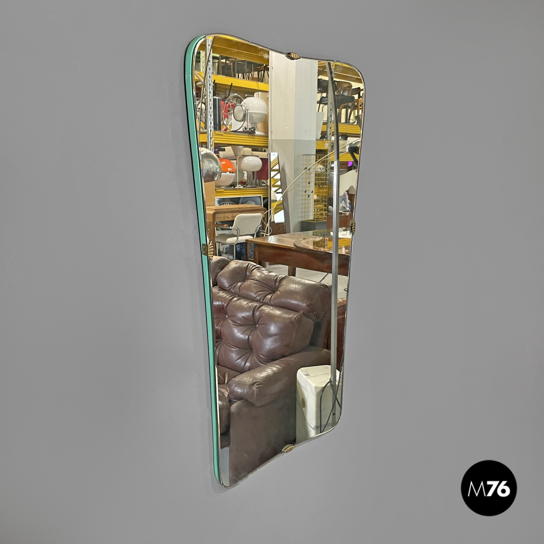 Specchio da parete rettangolare. Gli angoli sono stondati la struttura in legno si stringe nella parte bassa ed ha i profili dipinti di verde acqua. La parte dello specchio è fissata alla struttura tramite quattro ganci in ottone con forme che ricordano quelle di una conchiglia.