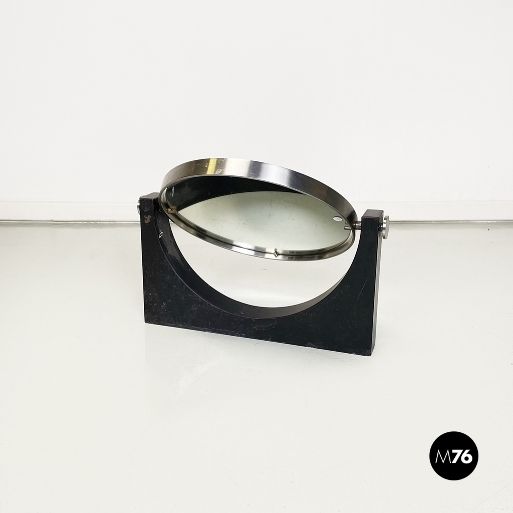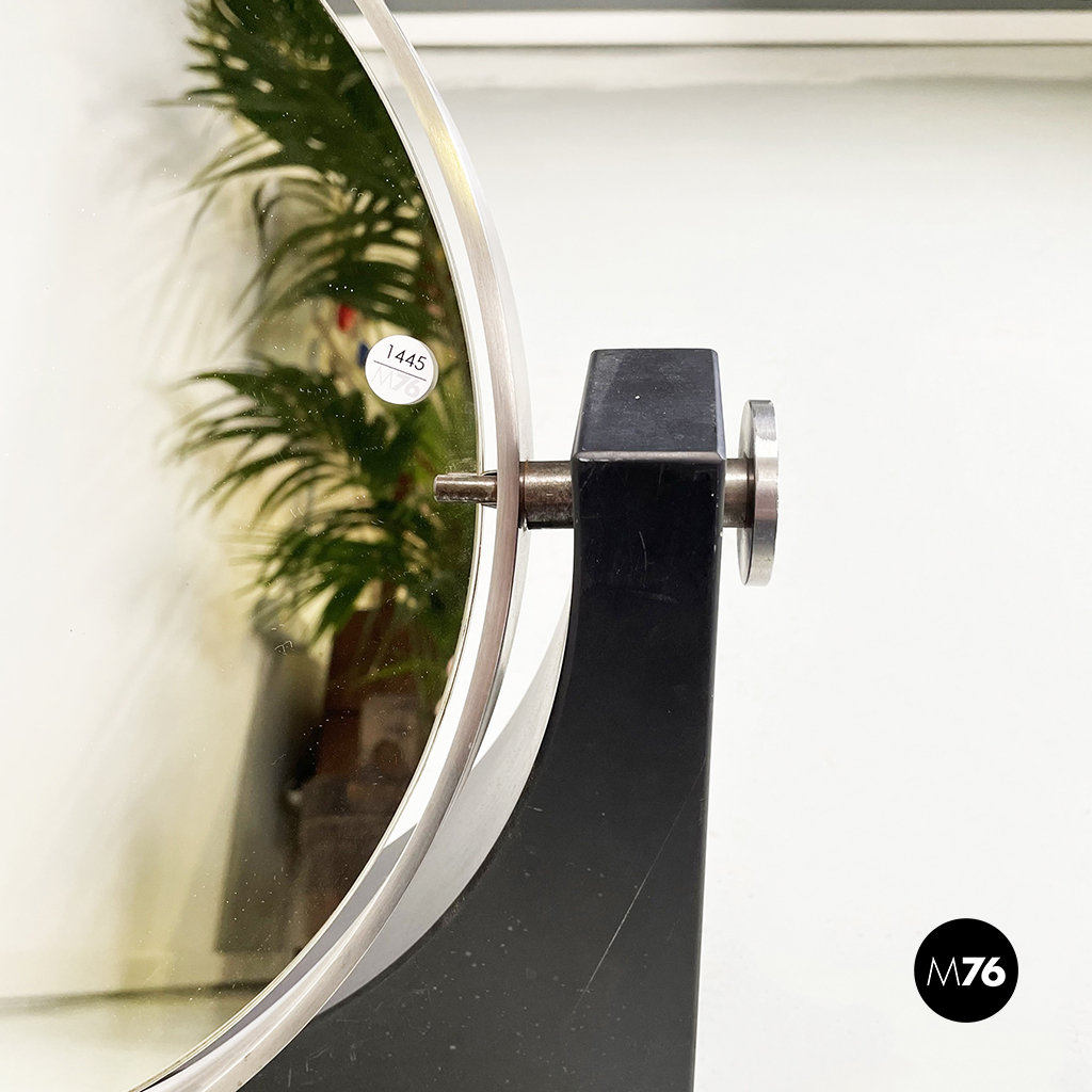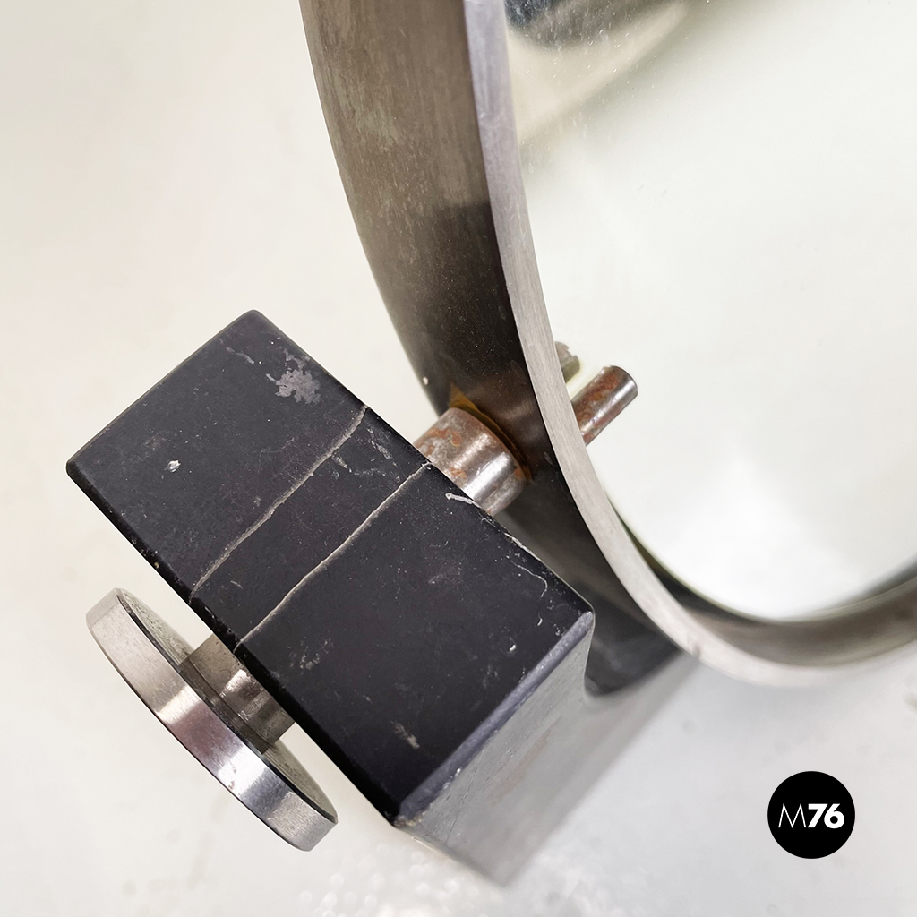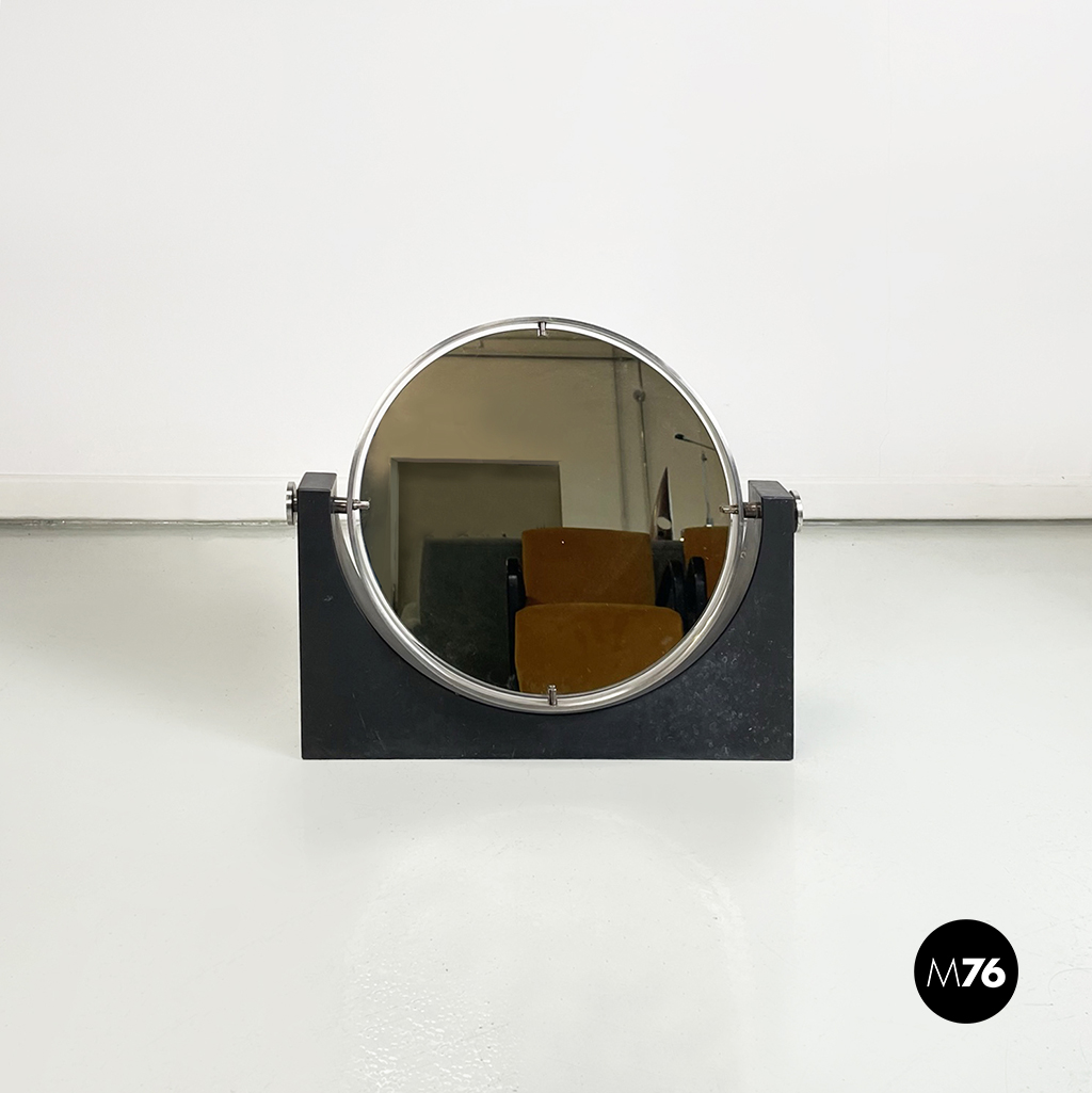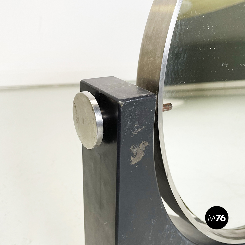 Doppio specchio da tavolo tondo con cornice in metallo. La cornice è collegata alla struttura in ardesia grazie a delle aste sottili in metallo le quali permettono anche la rotazione dello specchio.