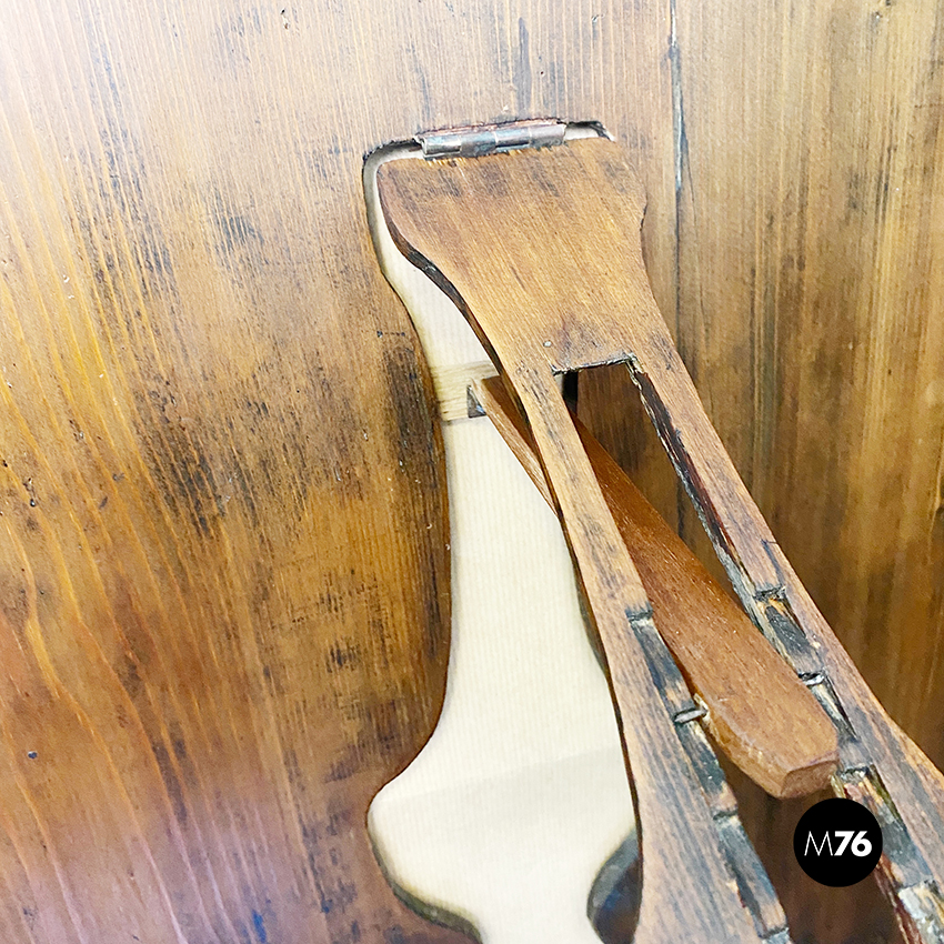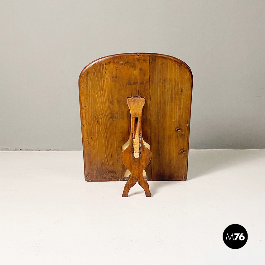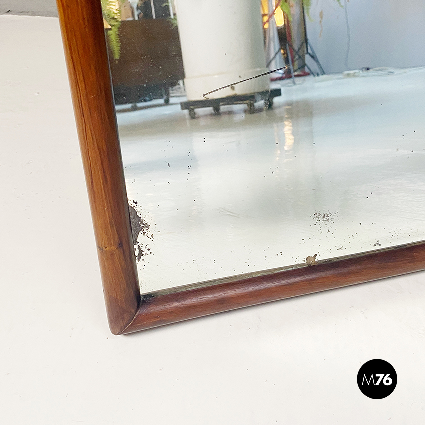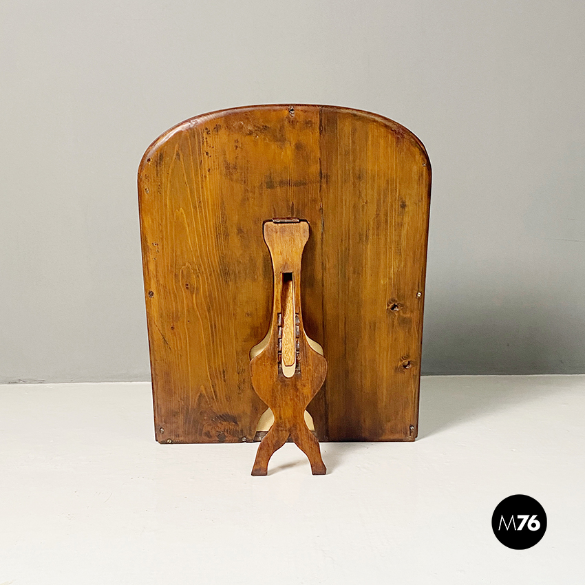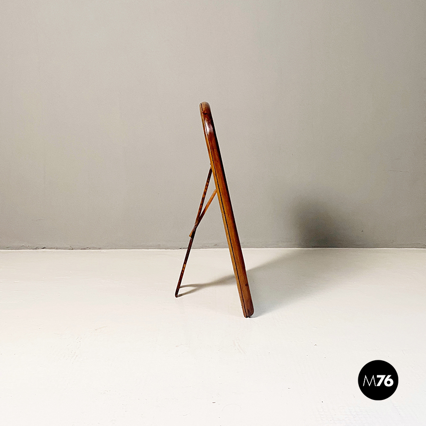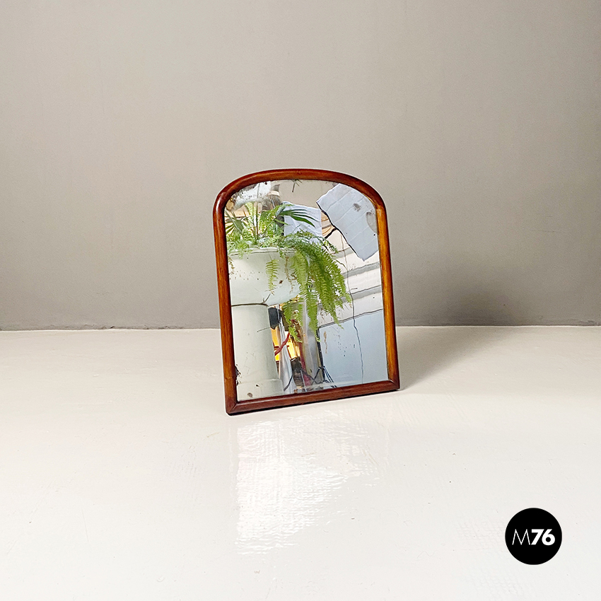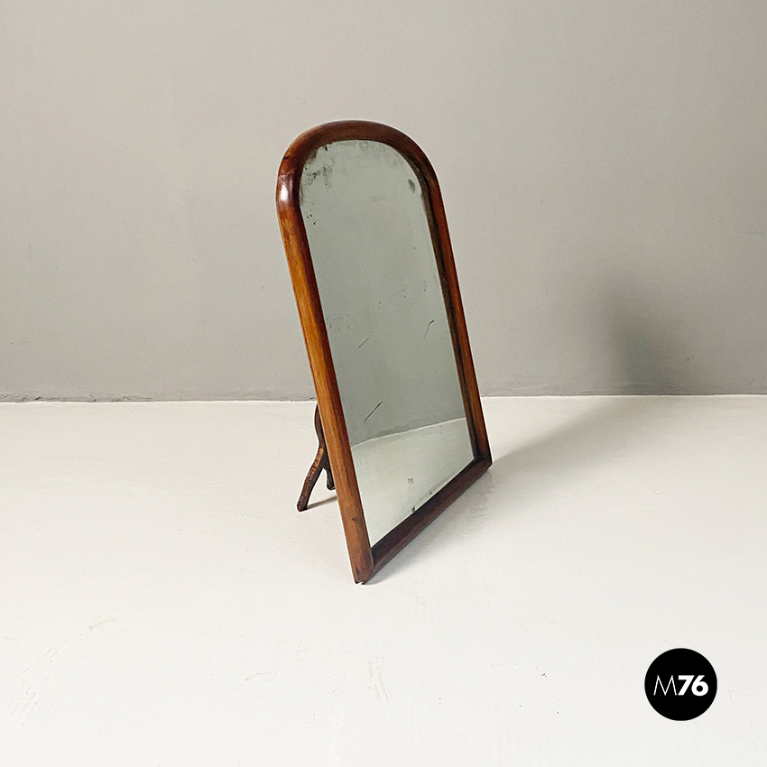 Specchio da tavolo con vetro al mercurio e cornice in legno con supporto richiudibile.