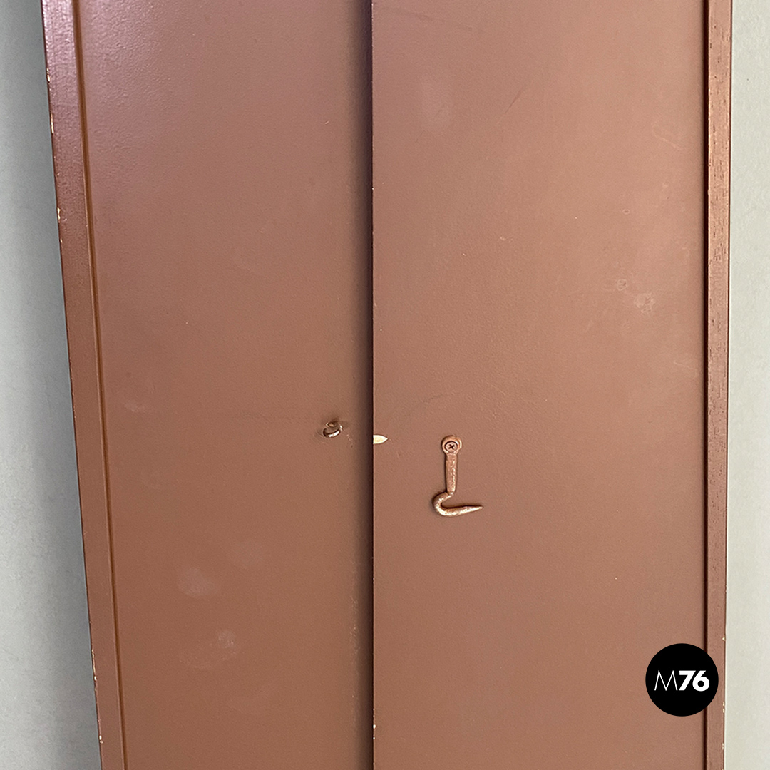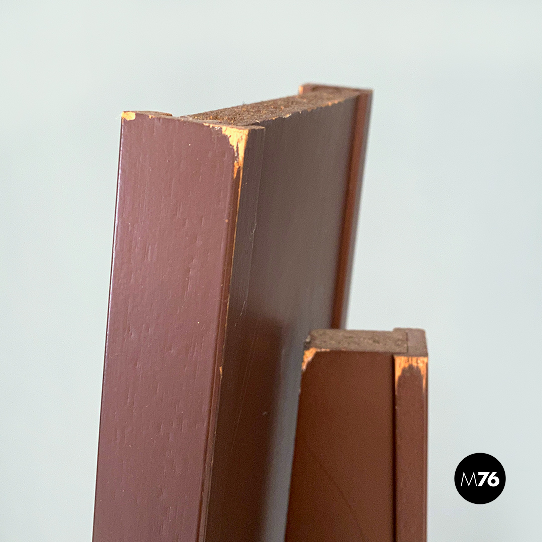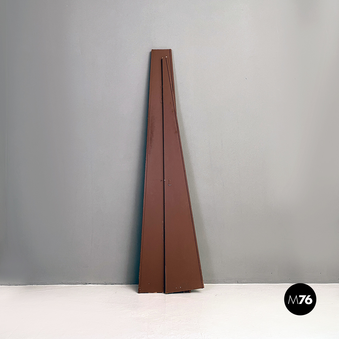 Specchio da terra con struttura in legno verniciata in colore marrone opaco con aletta posteriore a battente e gancetto di blocco che lo rende autoportante e stabile.