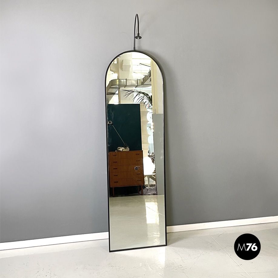 Specchio da terra con parte superiore a semicerchio. Cornice in metallo nera liscia con lampada ad arco in tondino di metallo nero e diffusore tondo l’interruttore si trova nella parte centrale dello specchio.