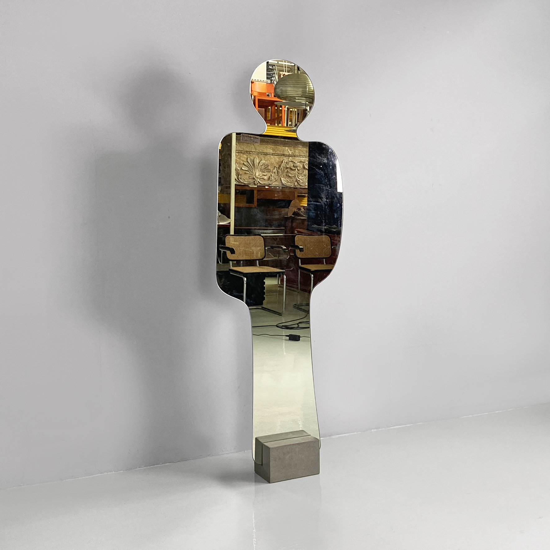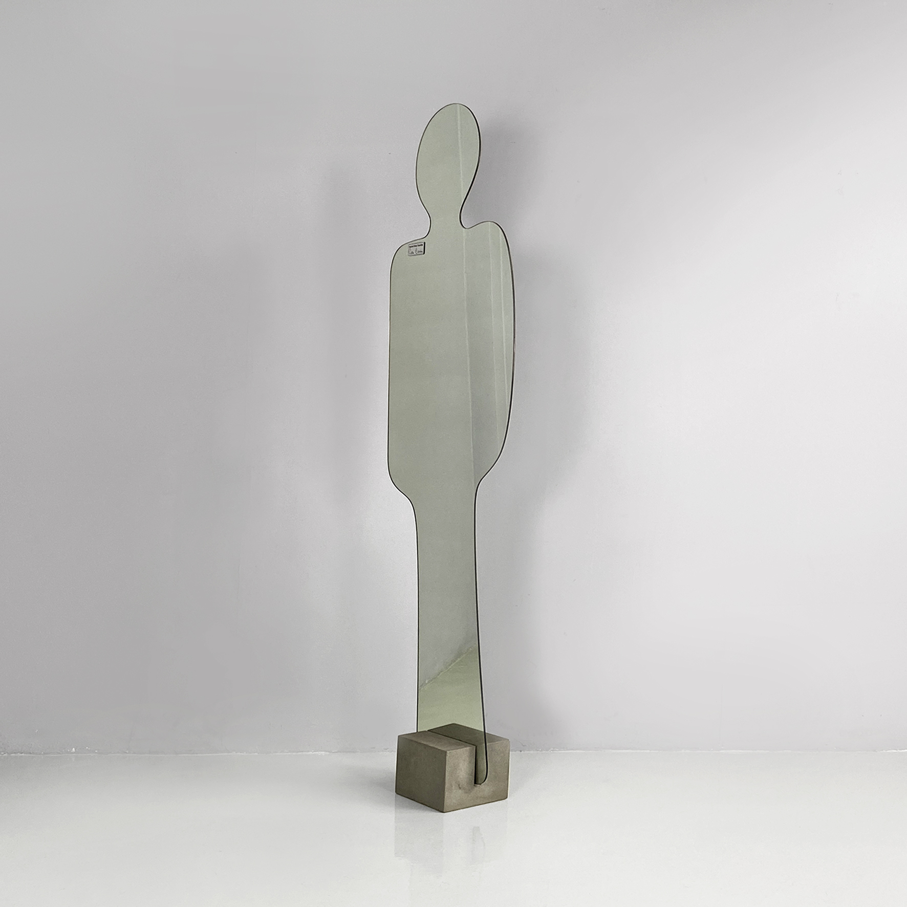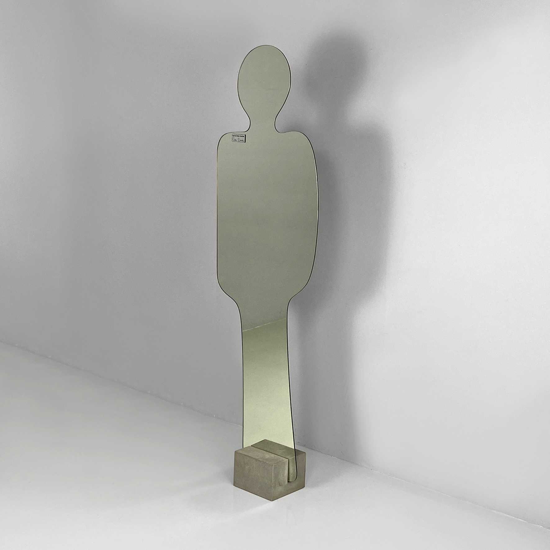 Specchio da terra mod. Narciso con struttura autoportante a figura intera, con forma di figura umana. Il retro dello specchio è fatto in plastica nera, con un motivo geometrico in rilievo, e su questa superficie è fissato il vetro specchiato, che fa da fronte allo stesso oggetto. Lo specchio si fissa semplicemente inserendosi nella base cubica in pietra serena, rimanendo stabile. Pubblicato sulla copertina del Time Magazine assieme allo stesso designer Pierre Cardin, ideatore del prodotto. Presente un etichetta di produzione sul vetro.