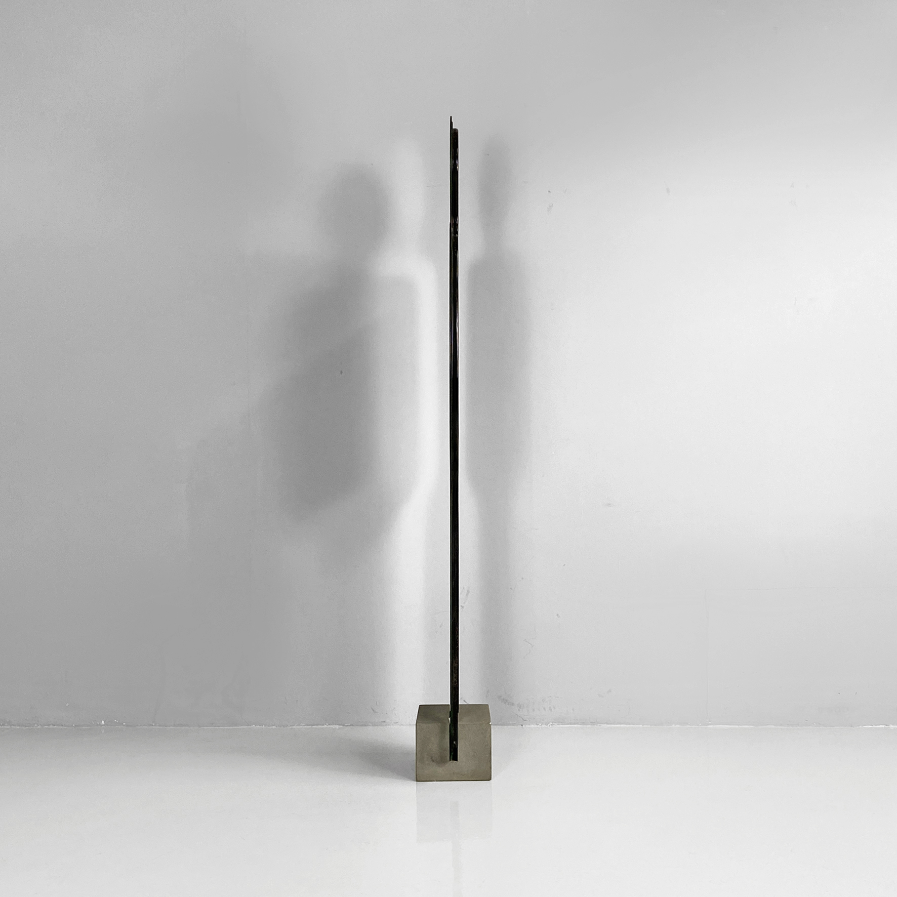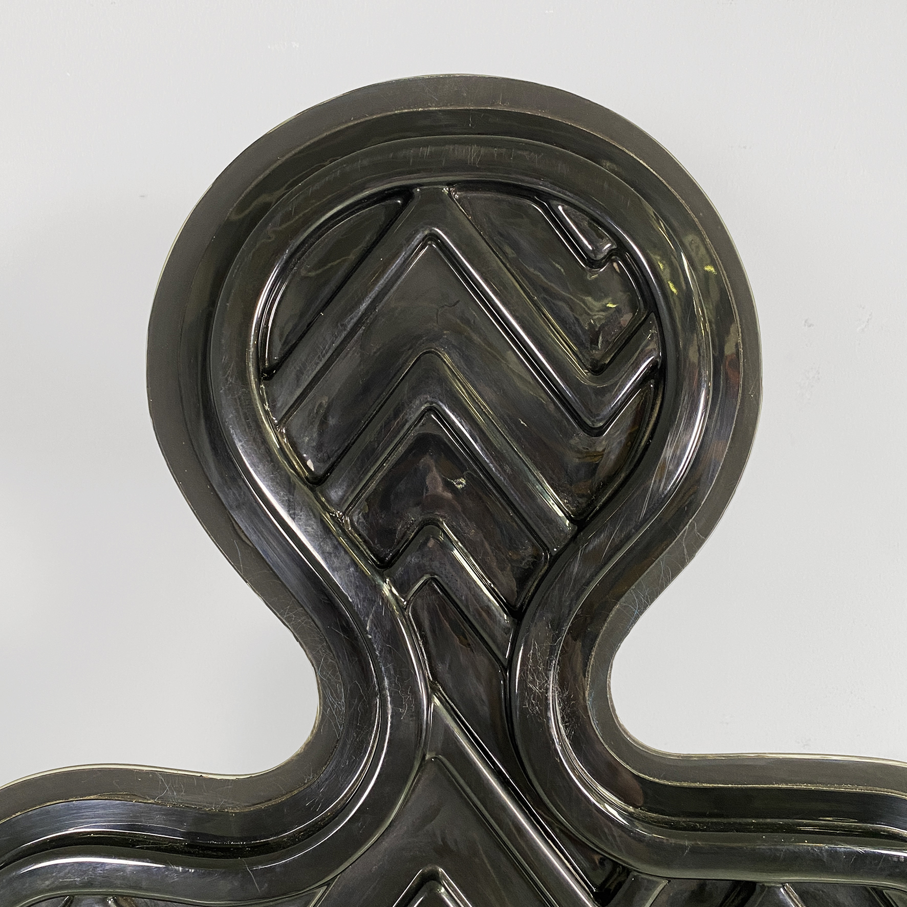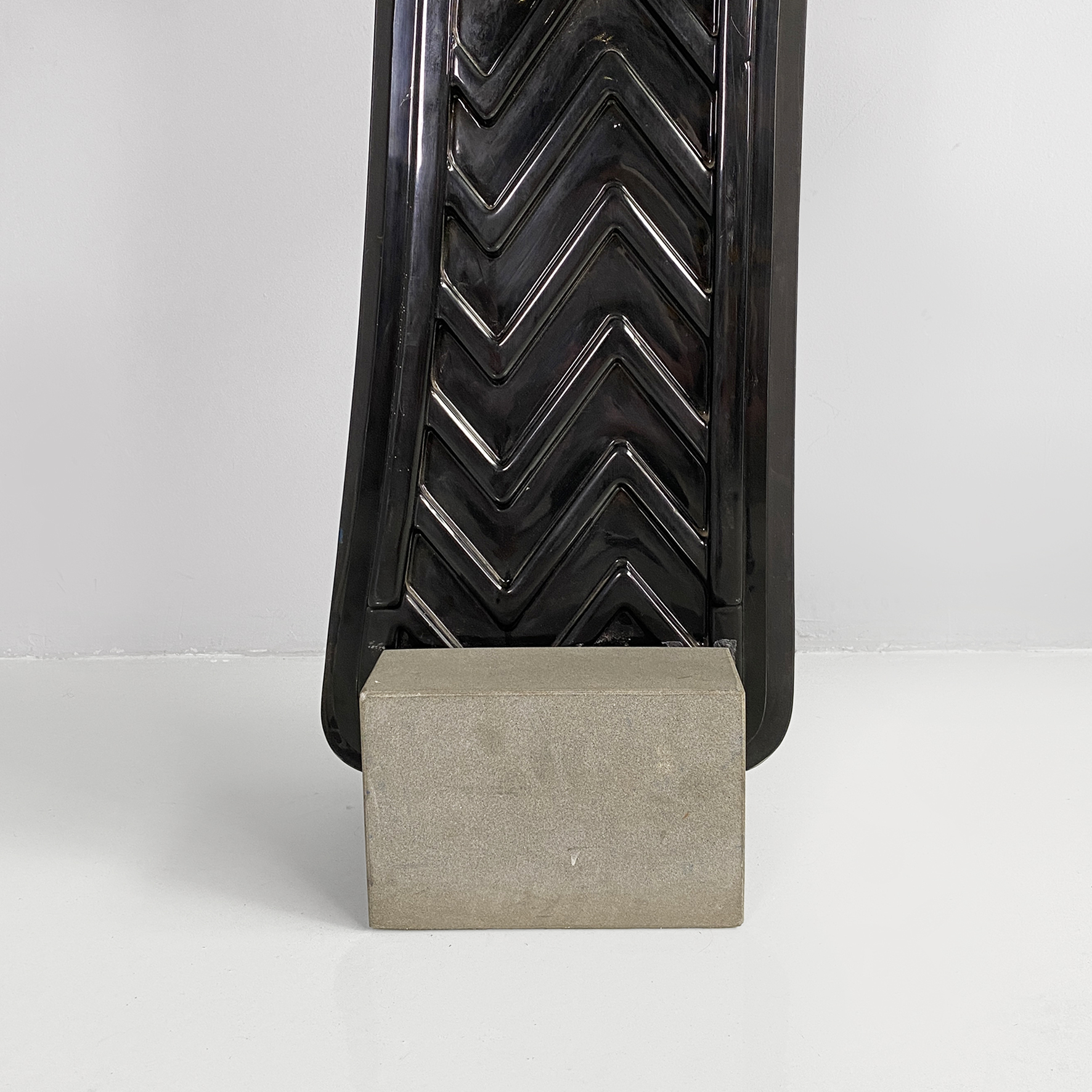 Specchio da terra mod. Narciso con struttura autoportante a figura intera, con forma di figura umana. Il retro dello specchio è fatto in plastica nera, con un motivo geometrico in rilievo, e su questa superficie è fissato il vetro specchiato, che fa da fronte allo stesso oggetto. Lo specchio si fissa semplicemente inserendosi nella base cubica in pietra serena, rimanendo stabile. Pubblicato sulla copertina del Time Magazine assieme allo stesso designer Pierre Cardin, ideatore del prodotto. Presente un etichetta di produzione sul vetro.